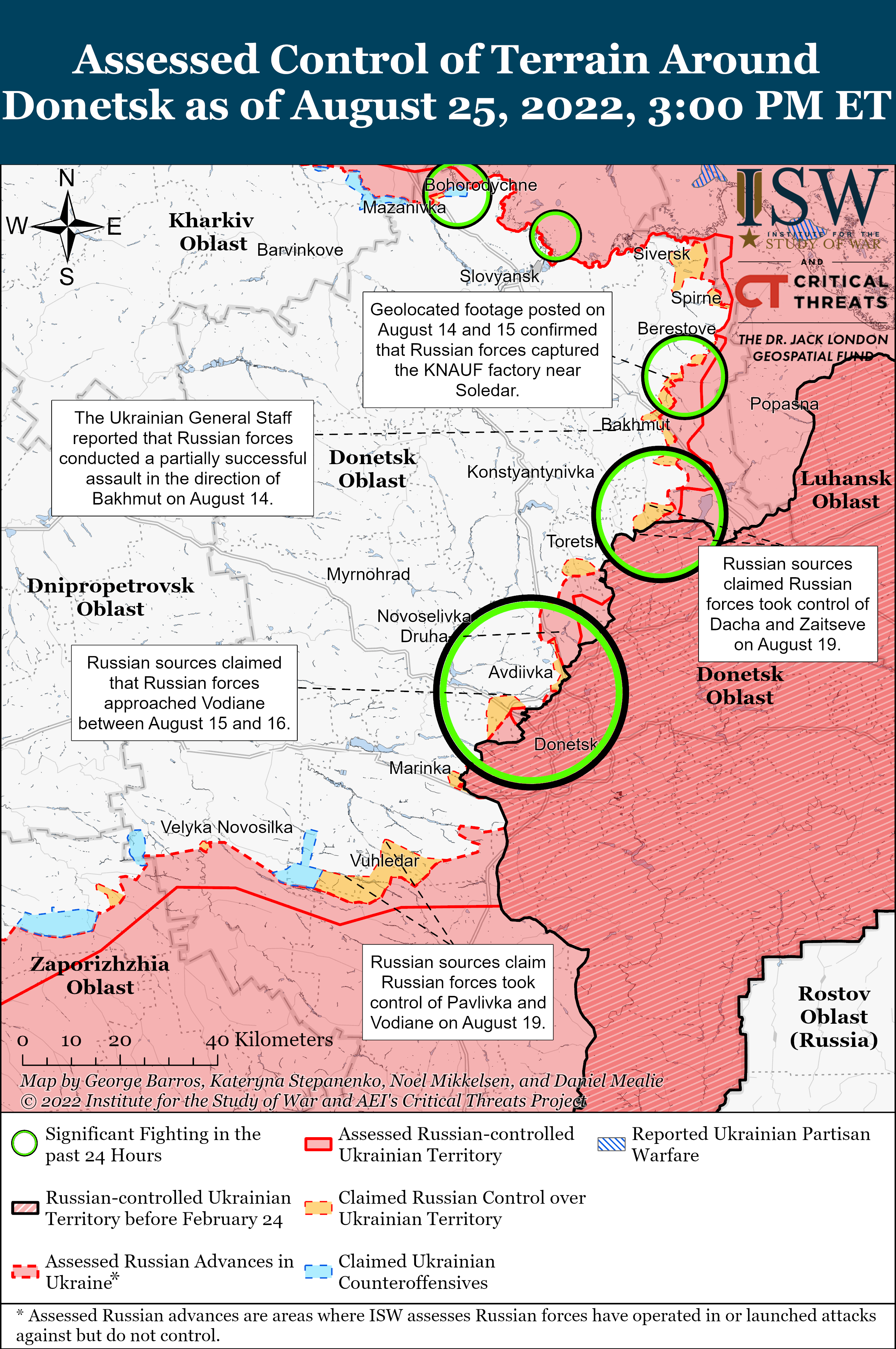 Russian forces continued ground attacks northeast and south of Bakhmut on August 25. The Ukrainian General Staff stated that Russian troops attempted to advance on Bakhmut from Bakhmutske, 8km northeast of Bakhmut.[13] Russian troops, likely including Wagner Group mercenaries and elements of the Luhansk People’s Republic (LNR) 6th Cossack Regiment are continuing to conduct ground attacks with artillery support around Bakhmut and in Soledar.[14] The Ukrainian General Staff also reported that Russian troops attempted to advance northward from the Horlivka area and conducted a ground attack from Travneve (19km southeast of Bakhmut) to Kodema (14km southeast of Bakhmut) and are fighting around Kodema.[15]