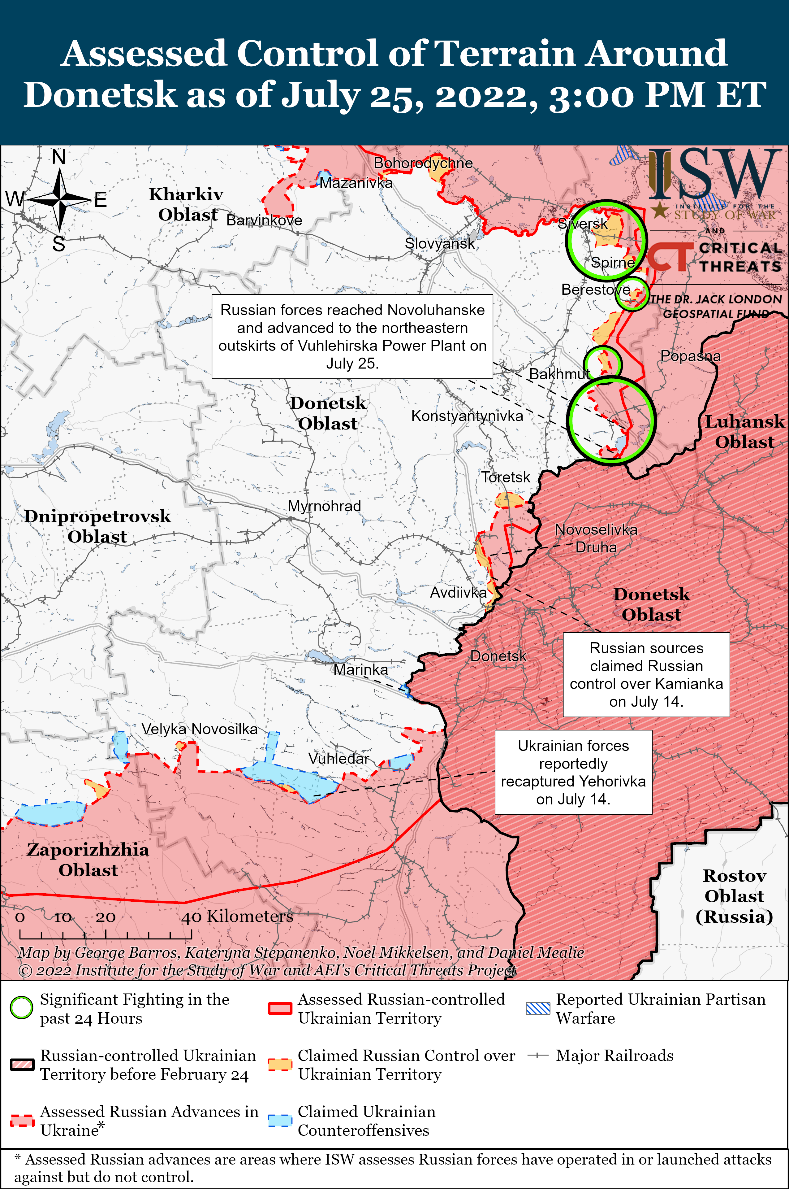 Russian forces continued unsuccessful ground assaults east of Siversk on July 25. Ukrainian sources reported that Russian troops failed to advance on Ivano-Darivka (about 10km southeast of Siversk) from Berestove and Verkhnokamyanka.[6] Russian forces reportedly continued ground attacks around Spirne (15km southeast of Siversk) and Verkhnokamyanske (5km due east of Siversk) and conducted air and artillery attacks around Siversk to support ongoing ground attacks.[7]