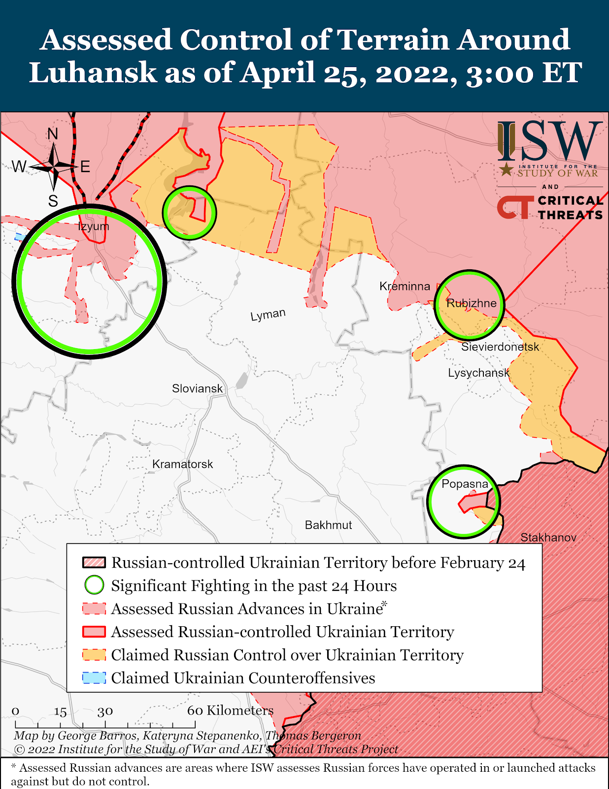 - Russian forces will likely continue attacking southeast from Izyum, west from Kreminna and Popasna, and north from Donetsk City via Avdiivka or another axis.