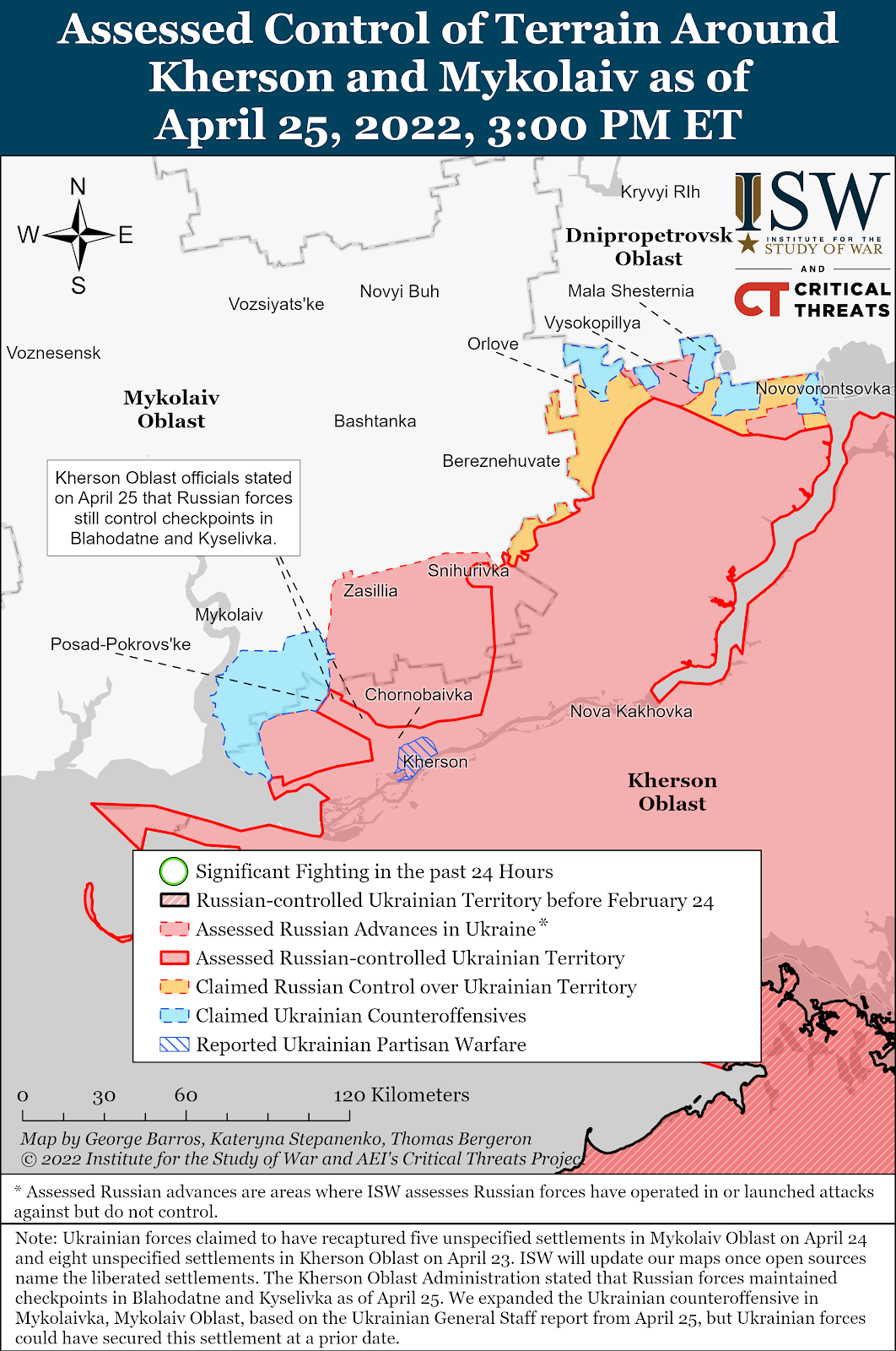 The Ukrainian General Staff reported that Russian forces are consolidating in the southern direction to conduct limited attacks west toward Mykolaiv and north toward Kryvyi Rih after conducting limited withdrawals from several forward positions in the past two days.[17] ISW could not verify Ukrainian claims to have recaptured five settlements in Mykolaiv Oblast on April 24 and eight in Kherson Oblast on April 23, though Ukrainian forces are likely conducting successful local attacks.[18] Limited Ukrainian counterattacks in the past 48 hours northwest of Kherson city likely disrupted Russian offensive preparations and forced some Russian forces to retreat to Chornobaivka on April 23.[19] Ukraine’s Operational Command “South” reported that two Russian sabotage and reconnaissance units attempted to advance toward Mykolaiv but lost half their personnel and retreated on April 24.[20] Ukrainian counterattacks continue to disrupt Russian efforts to capture the entirety of Kherson Oblast.