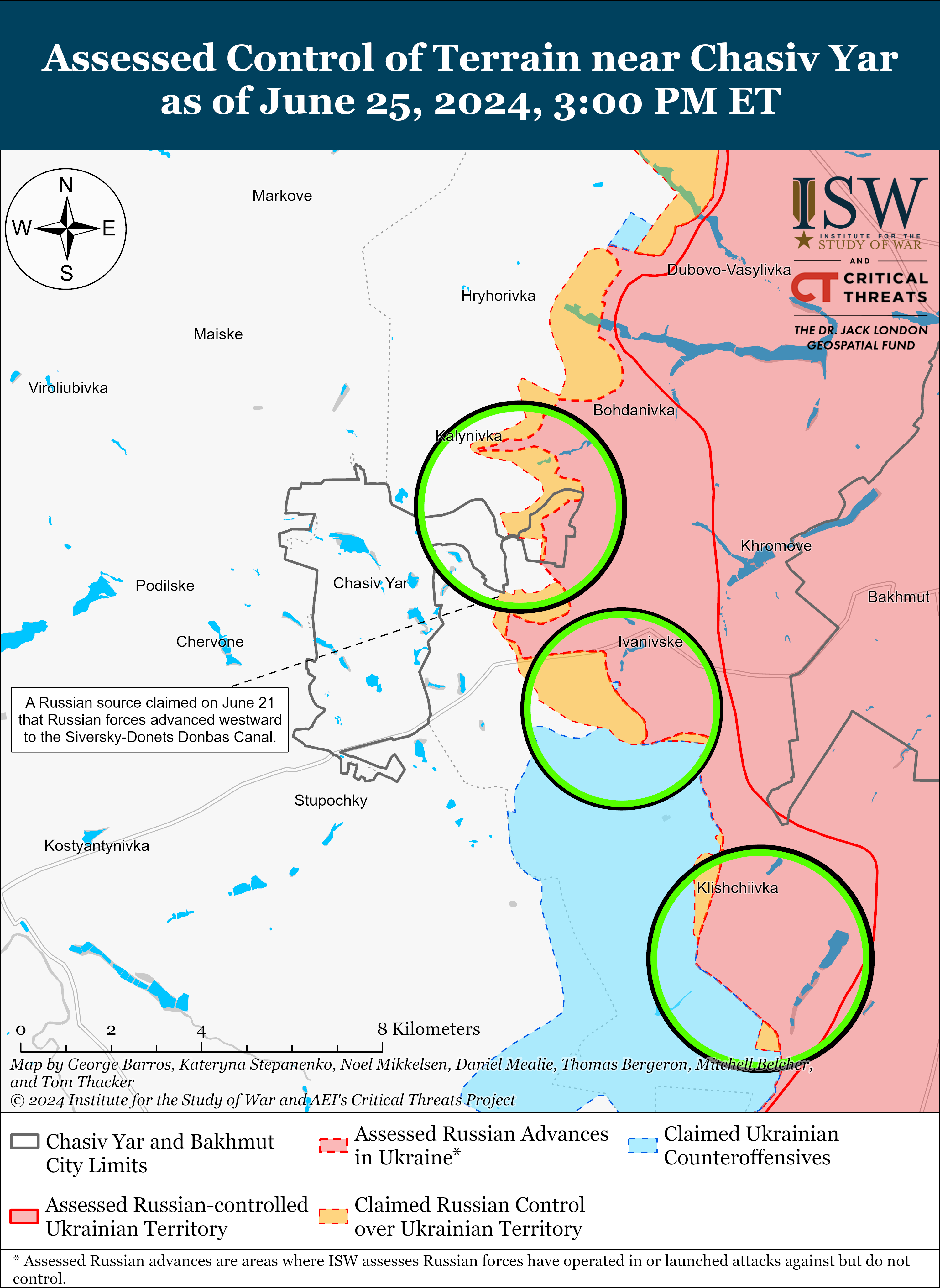 Russian forces continued offensive operations near Chasiv Yar on June 25 but did not make any confirmed advances. Ukrainian and Russian sources reported continued fighting north of Chasiv Yar near Kalynivka; east of Chasiv Yar near Ivanivske; and southeast of Chasiv Yar near Andriivka and Klishchiivka on June 24 and 25.[48] Elements of the Russian 98th VDV Division reportedly continue operating in Kanal Microraion (easternmost Chasiv Yar), while elements of the “Sever-V” Volunteer Brigade (Russian Volunteer Corps) are reportedly operating north of Chasiv Yar near Hryhorivka.[49]