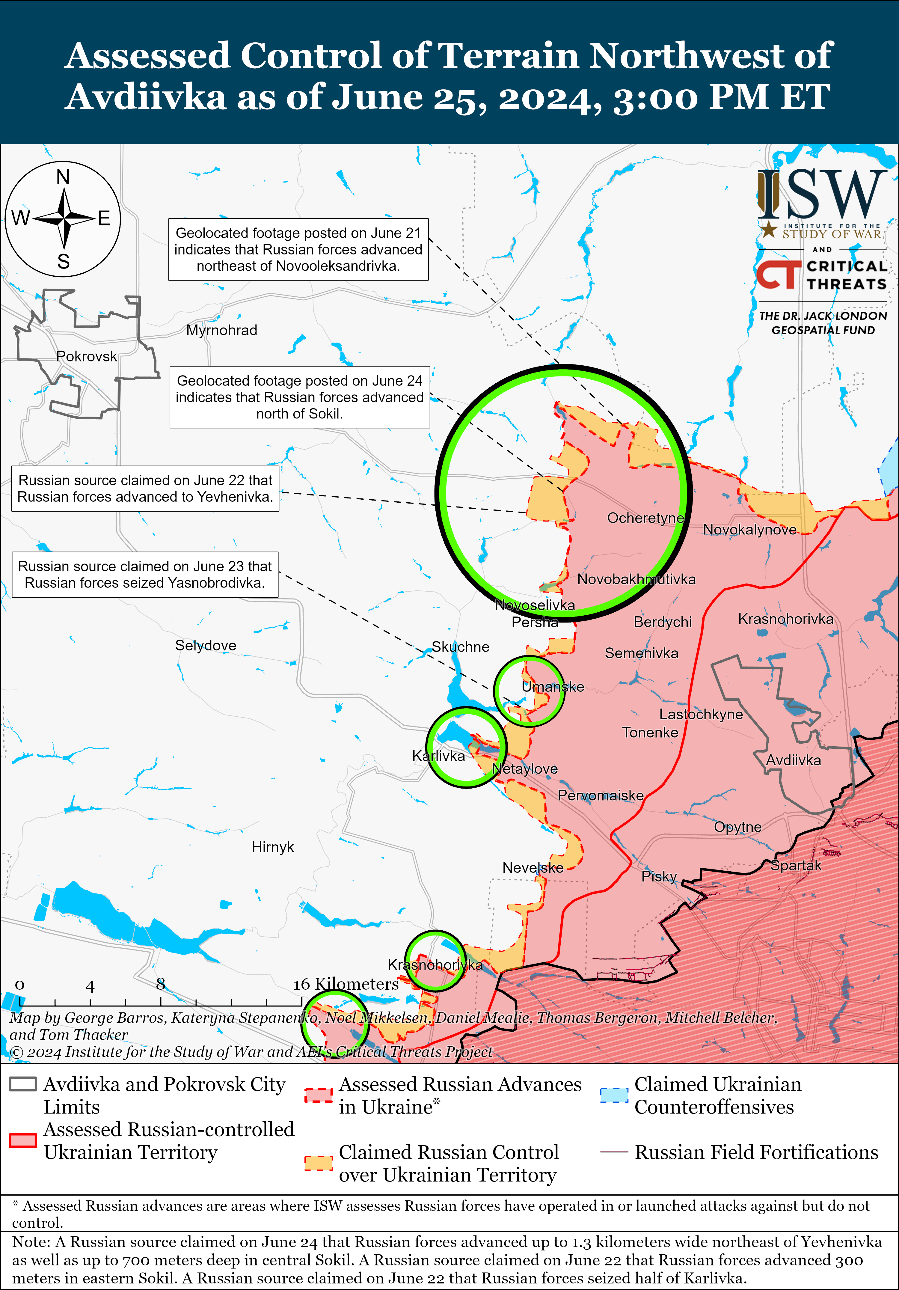 Russian forces recently made marginal advances northwest of Avdiivka. Geolocated footage posted on June 24 shows that Russian forces advanced in a field area just north of Sokil (northwest of Avdiivka).[52] Russian milbloggers amplified geolocated images on June 25 that also confirm that Russian forces hold positions along the O0544 Ocheretyne-Pokrovsk road just northwest of Ocheretyne (northwest of Avdiivka).[53] Russian milbloggers claimed that Russian forces are advancing near Yasnobrodivka (west of Avdiivka) and have partially encircled Ukrainian forces in the area.[54] Russian and Ukrainian sources reported continued fighting north of Avdiivka near Oleksandropil; northwest of Avdiivka near Yevhenivka, Novooleksandrivka, Vozdvyzhenka, Sokil, and Novoselivka Persha; west of Avdiivka near Umanske and Yasnobrodivka; and southeast of Avdiivka near Karlivka, Nevelske, and the Karlivske Reservoir.[55]