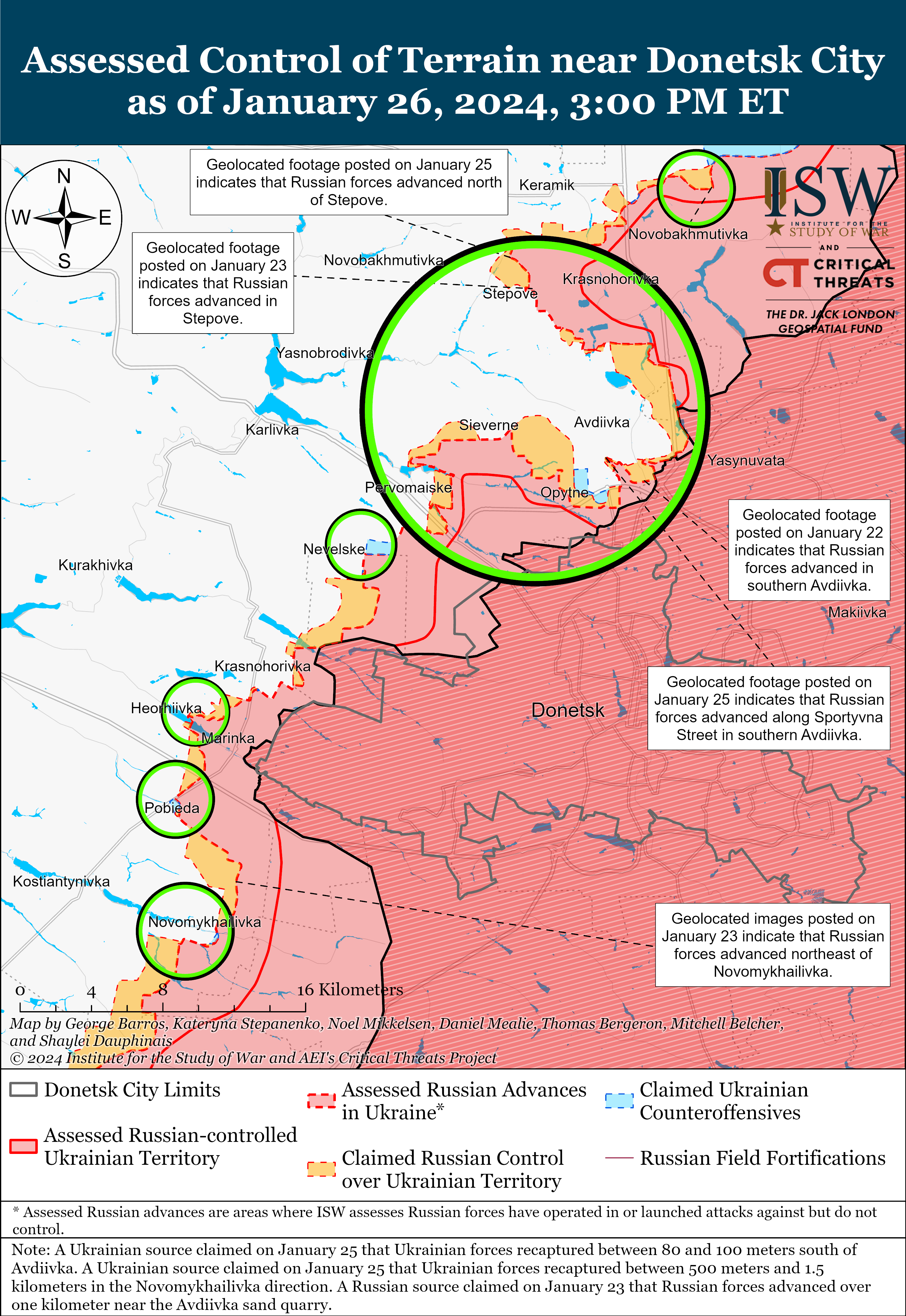 Russian forces recently marginally advanced near and in Avdiivka amid continued positional fighting in the area on January 26. Geolocated footage published on January 25 indicates that Russian forces recently marginally advanced north of Stepove (3km northwest of Avdiivka) and along Sportyvna Street in the southernmost residential area of Avdiivka.[44] A Russian milblogger claimed that Russian forces advanced near the ”Tsarska Okhota” restaurant area in Avdiivka’s southern outskirts.[45] Positional fighting continued northwest of Avdiivka near Novobakhmutivka and Stepove, northeast of Avdiivka from Kamianka, near Avdiivka’s southeastern outskirts, and southwest of Avdiivka near Vodyane, Pervomaiske and Nevelske.[46]