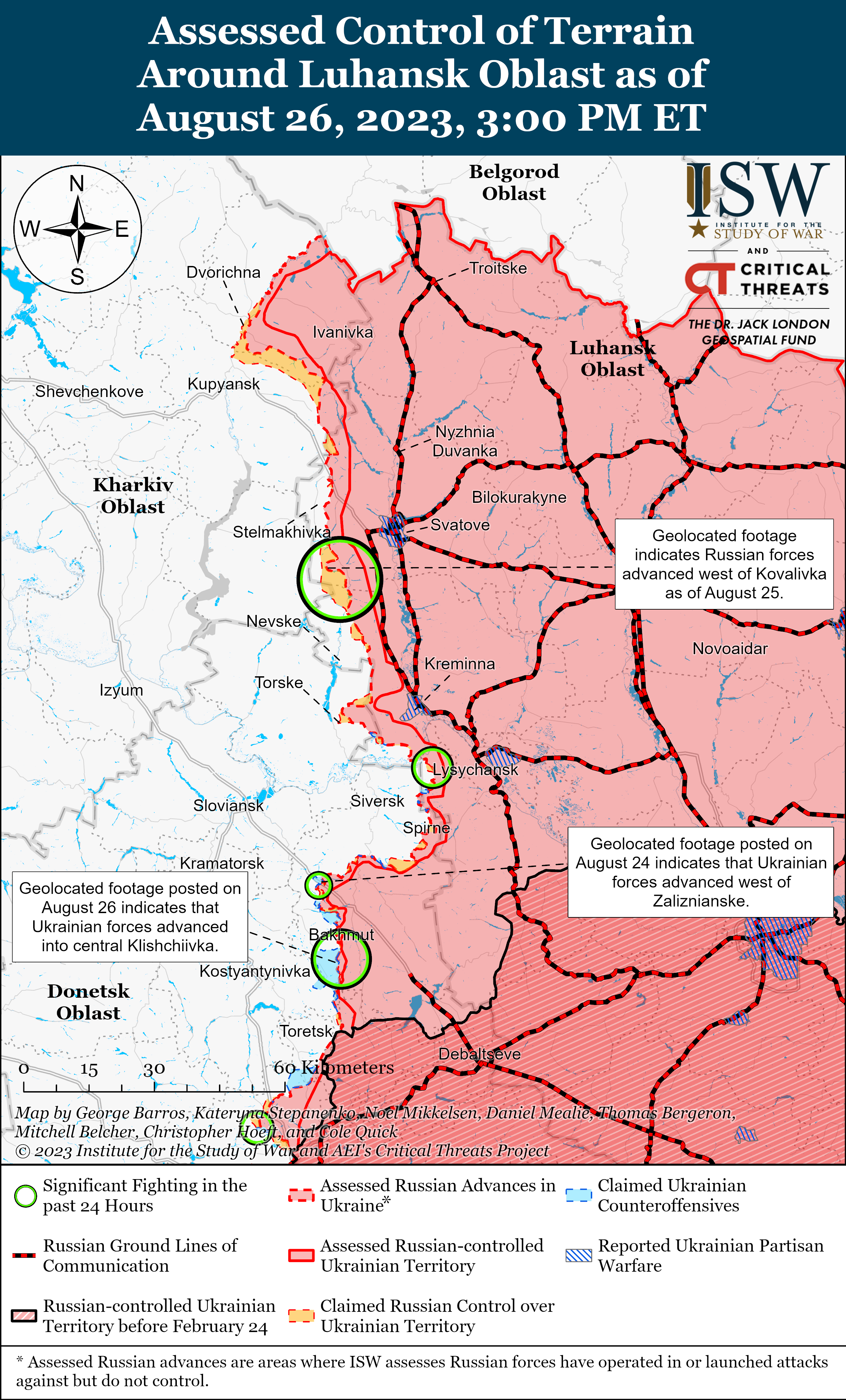 Russian forces continued offensive operations along the Kupyansk-Svatove-Kreminna line on August 26 but did not make any confirmed gains. The Ukrainian General Staff reported that Russian forces conducted unsuccessful offensive operations near Novoyehorivka (16 km southwest of Svatove) and Bilohorivka (12 km south of Kreminna).[24] Russian Western Grouping of Forces Press Officer Yaroslav Yakimkin claimed that Russian forces captured three unspecified strongholds in the Kupyansk direction.[25] Ukrainian Eastern Group of Forces Spokesperson Ilya Yevlash stated on August 25 that Russian forces shifted their tactical focus from the Kupyansk direction to the Novoyehorivka area.[26] A Russian milblogger claimed that Russian forces advanced near Synkivka (9 km northeast of Kupyansk) and in the direction of Petropavlivka (6 km east of Kupyansk), although ISW has not observed visual confirmation of these claims.[27]