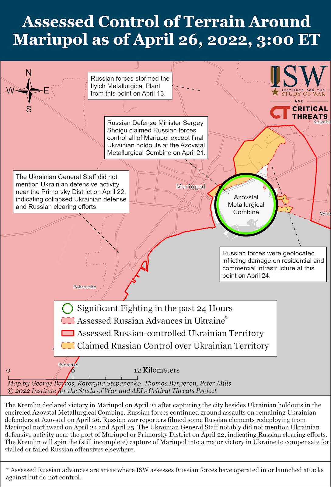 Russian forces continued ground and air assaults against remaining Ukrainian defenders in Mariupol on April 26 but were unsuccessful in storming the Azovstal Steel Plant.[1] Donetsk Oblast Administration Head Pavlo Kyrylenko said that Russian forces launched 35 airstrikes at Azovstal on April 26, which resulted in a fire at one of the plant’s shops.[2] Russian President Vladimir Putin nevertheless falsely claimed that all fighting has ceased in “liberated” Mariupol in a telephone conversation with Turkish President Recep Tayyip Erdogan.[3] Advisor to the Mayor of Mariupol Petro Andryushchenko stated that any Russian claims of humanitarian corridors for evacuation from Azovstal are a ”trap.”[4] Footage of continuing Russian tanks shooting at residential and commercial buildings outside the Azovstal Steel Plant indicates that Ukrainian defenders likely still hold positions beyond the boundaries of the Azovstal plant proper.[5]