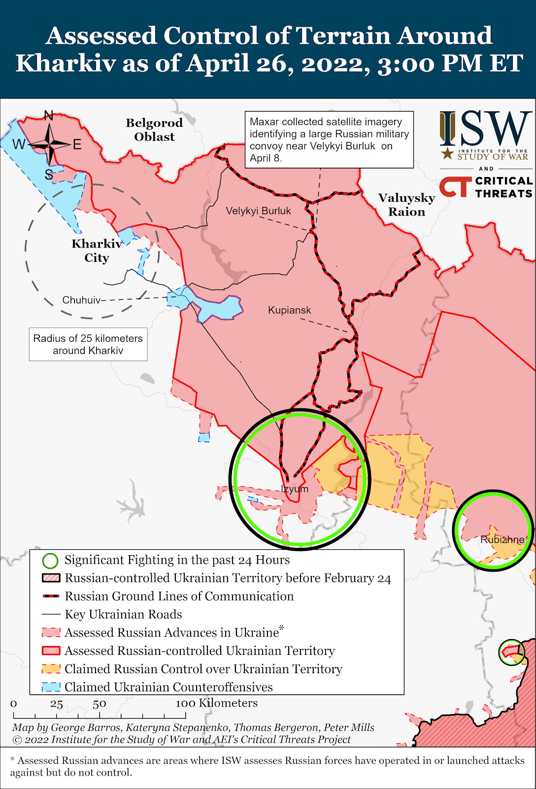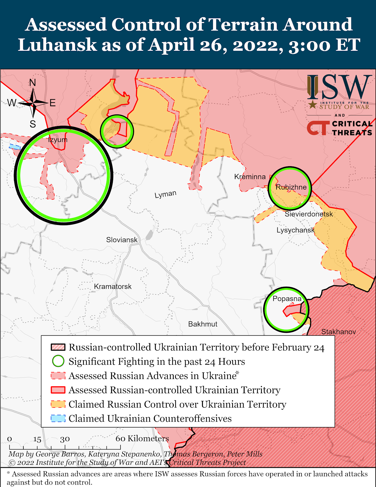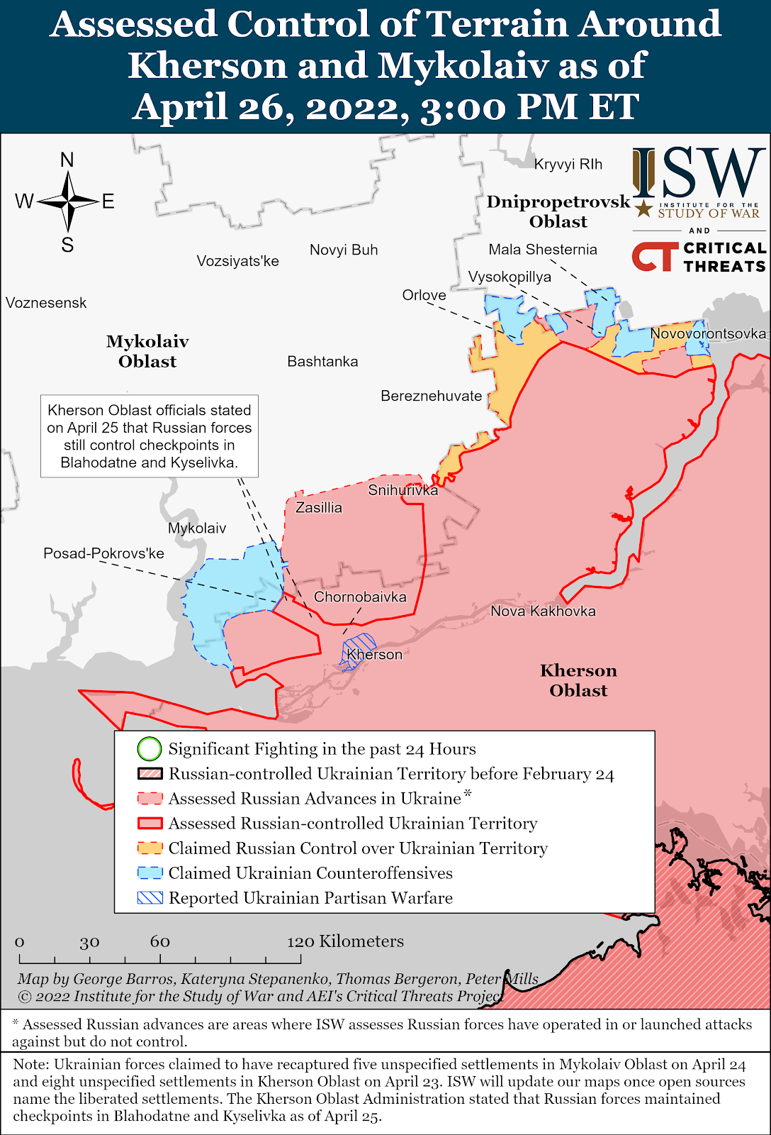 Russian forces continued to shell the entire line of contact on the Southern Axis and are carrying out ground offensives in the direction of Mykolaiv and Kryvyi Rih.[16] Russian forces are reportedly forcing residents of Velyka Oleksandrivka (roughly 15 kilometers from the Kherson-Mykolaiv administrative border) to evacuate their homes.[17] The Ukrainian General Staff additionally reported that Russian forces suffered losses in the towns of Novodmytrivka and Bilousove, both within 20 kilometers of the Kherson-Mykolaiv administrative border.[18] The Russian presence in areas near the border likely indicates preparation for an offensive in the direction of Mykolaiv. Russian missiles hit Odesa, Zaporizhia, Dnipropetrovsk, and Mykolaiv on April 26.[19] The mayor of Melitopol claimed on April 25 that Russian forces are blocking men from leaving the city and forcing them to mobilize into the Russian army.[20]