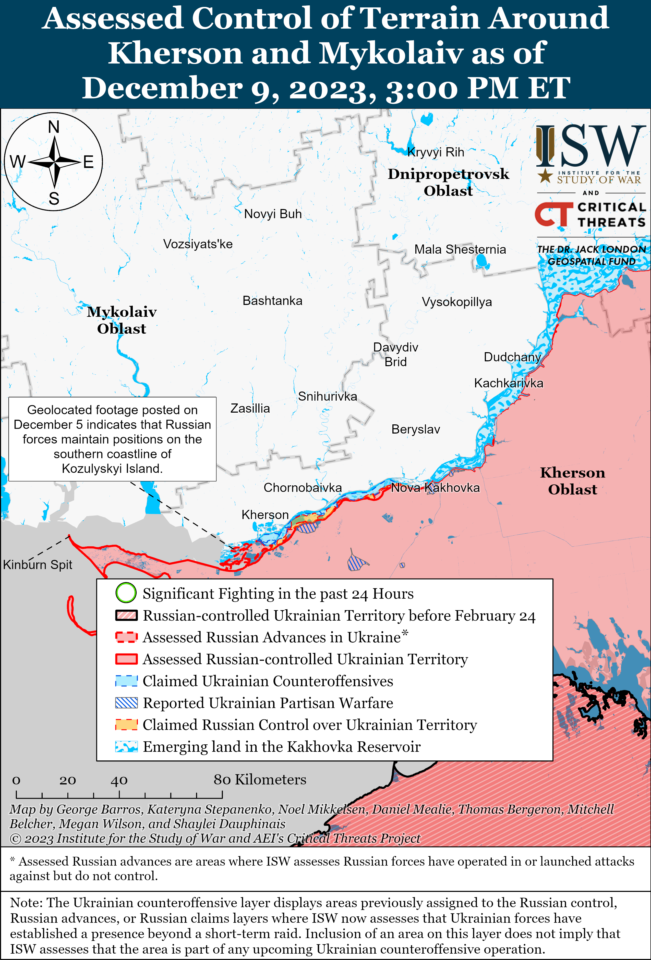 Ukrainian forces maintain positions on the east (left) bank of Kherson Oblast on December 9 amid Russian efforts to push Ukrainian forces from positions in Krynky (30km northeast of Kherson City and 2km from the Dnipro River). The Ukrainian General Staff reported on December 9 that Ukrainian forces maintain positions on the east (left) bank of the Dnipro River.[66] Russian milbloggers claimed that Russian forces are striking Ukrainian positions and sinking boats attempting to transfer Ukrainian personnel to Krynky.[67] Ukrainian military observer Kostyantyn Mashovets stated on December 8 that Russian forces are attempting to advance east of Krynky and are strengthening defenses southwest of Oleshky (7km south of Kherson City and 4km from the Dnipro River), near Pidlisne (8km south of Kherson City and 6km from the Dnipro River), and near Kardashynka (7km south of Kherson City and 2km from the Dnipro River).[68]