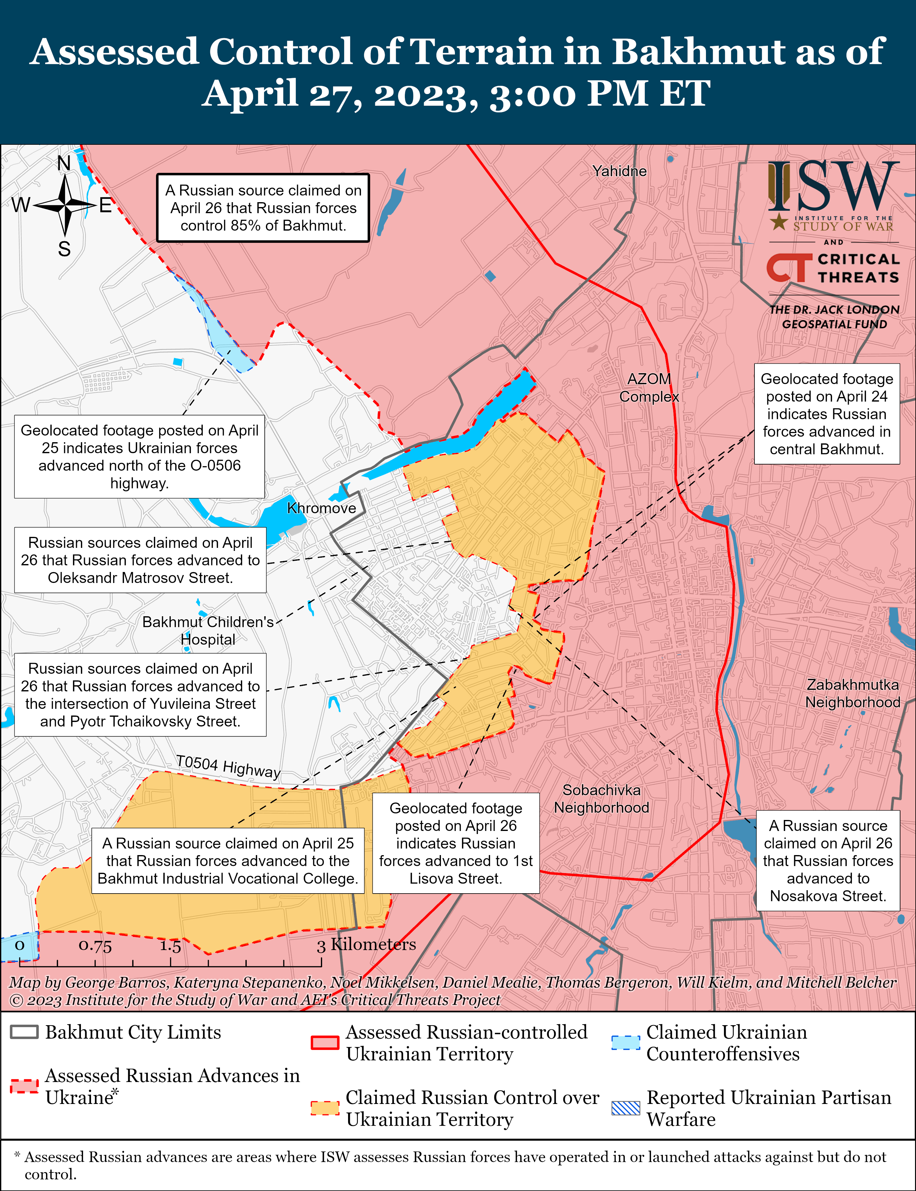 Russian forces did not make any confirmed gains in or around Bakhmut on April 27. The Ukrainian General Staff reported that Russian forces continued to attack within Bakhmut, and Ukrainian forces repelled Russian ground attacks near Orikhovo-Vasylivka (11km northwest of Bakhmut), Bohdanivka (5km northwest of Bakhmut), and Ivanivske (6km west of Bakhmut).[24] A milblogger claimed on April 27 that Wagner forces reached the main entrance to Bakhmut from Khromove (immediately west of Bakhmut) and Ivanivske and cut the main but not final Ukrainian logistics line into Bakhmut, but ISW cannot confirm this claim.[25] One Russian milblogger claimed that Wagner Group forces broke through Ukrainian lines near Khromove, but another claimed that Wagner forces have not yet entered the settlement.[26] The Russian Ministry of Defense (MoD) claimed that Wagner Group assault detachments captured four unspecified blocks in northwestern, western, and southwestern Bakhmut.[27]