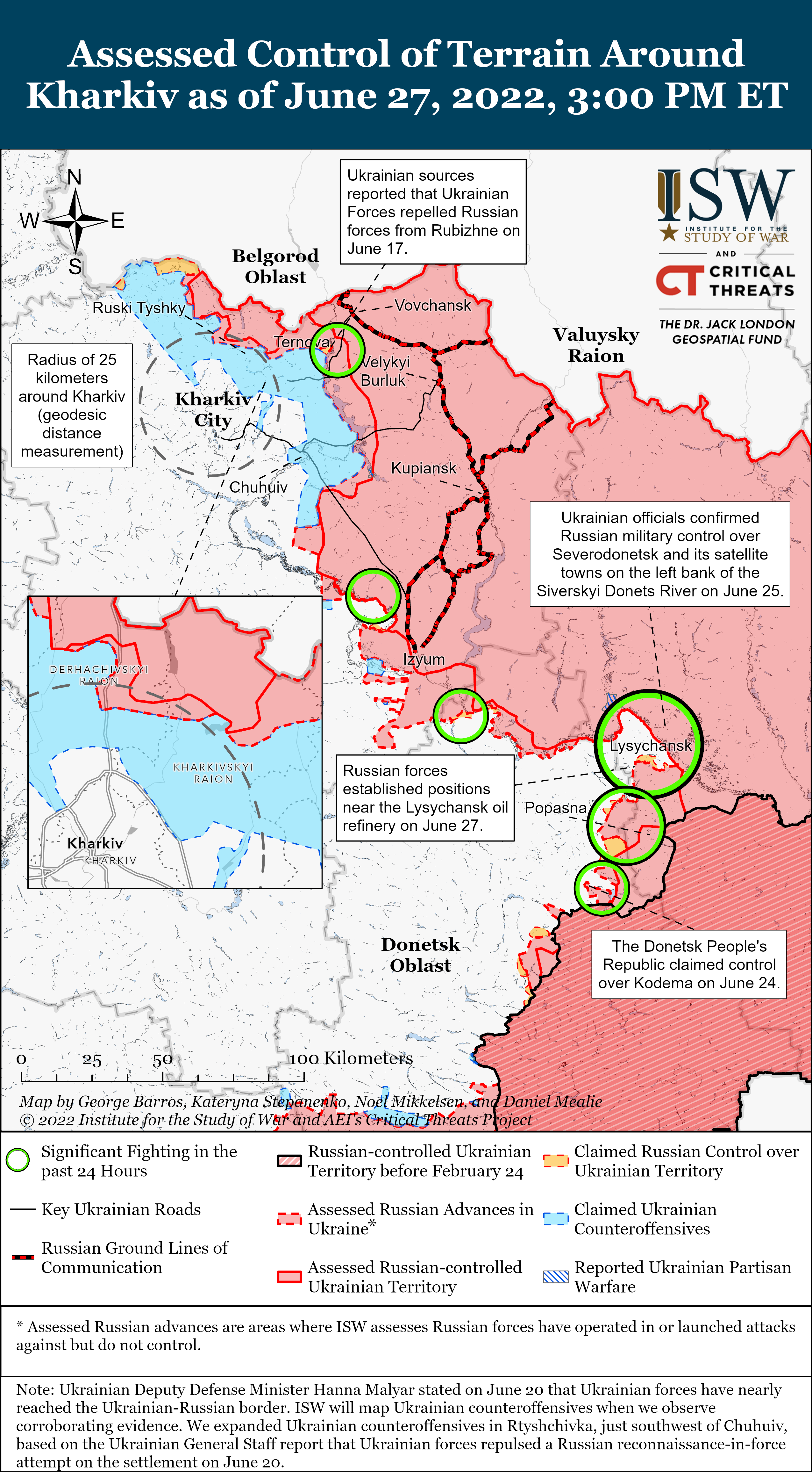 - Russian forces made limited and localized attacks along contested frontlines around Kharkiv City but did not make any advances on June 27.