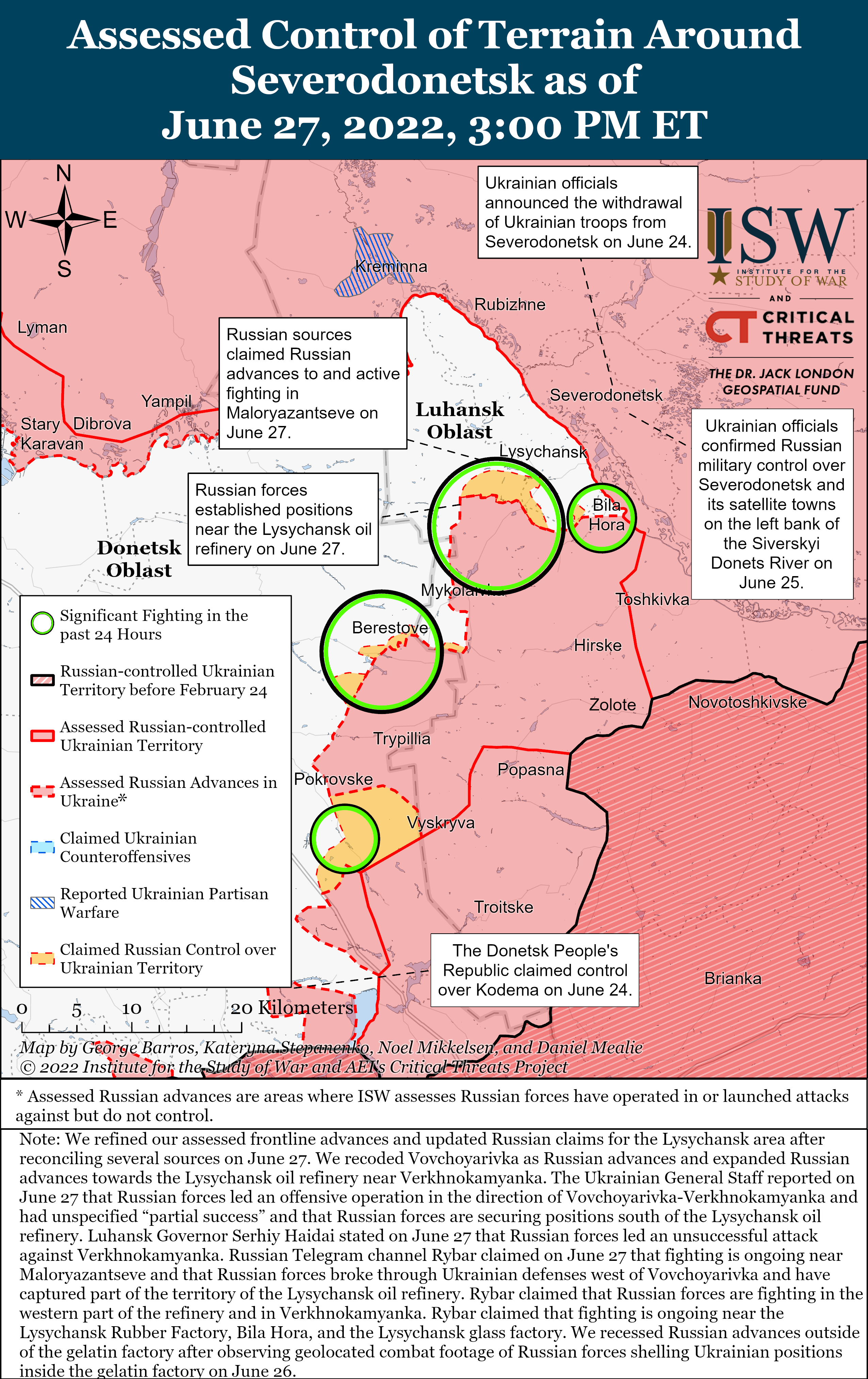 Russian forces made marginal advances southwest of Lysychansk on June 27 but have not yet entirely severed Ukrainian ground lines of communication (GLOCs) to the city. The Ukrainian General Staff reported that Russian forces conducted a partially successful advance west of Vovchoyarivka towards the T1302 Lysychansk-Bakhmut highway (just 5 km south of Lysychansk) but are unlikely to have reached the T1302 in this area as of June 27 due to Ukrainian resistance in Verkhnokamyanka.[7] Russian forces are also securing positions in the southern territory of the Lysychansk Oil Refinery and maintained artillery fire against Ukrainian positions around the Lysychansk Gelatin Plant.[8] Ukrainian forces reportedly repelled Russian attacks north of Pidlisne, situated just south of the Lysychansk Gelatin Plant. Luhansk Oblast Administration Head Serhiy Haidai called on Lysychansk residents to evacuate from the city, indicating Ukrainian forces retain control of at least some GLOCs to the city.[9] Russian Telegram channels continue to claim that Russian forces have established “fire control” (likely meaning successfully interdicting Ukrainian movement) along Ukrainian GLOCs to Lysychansk on the Siversk-Bilohorivka road, however.[10]