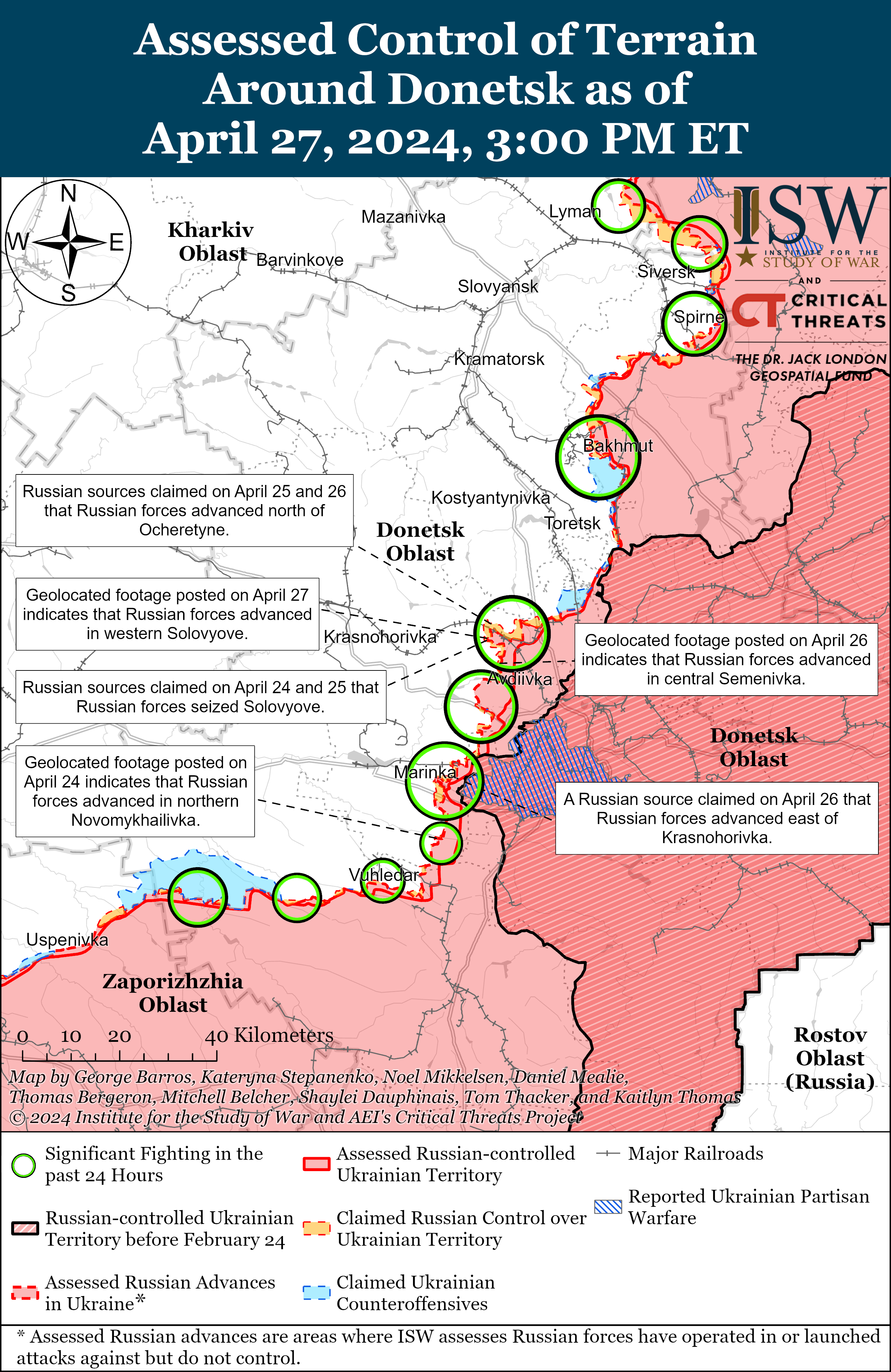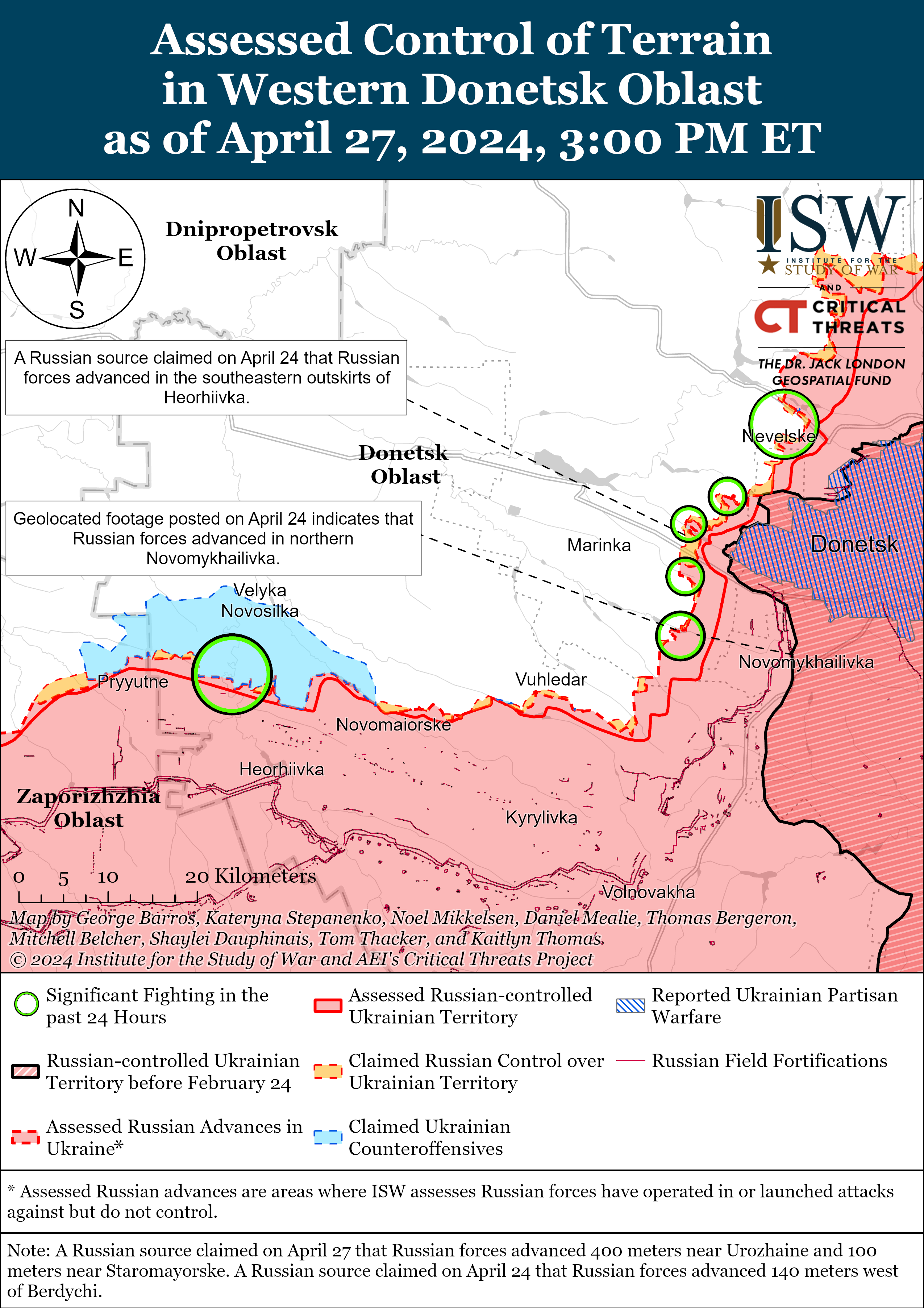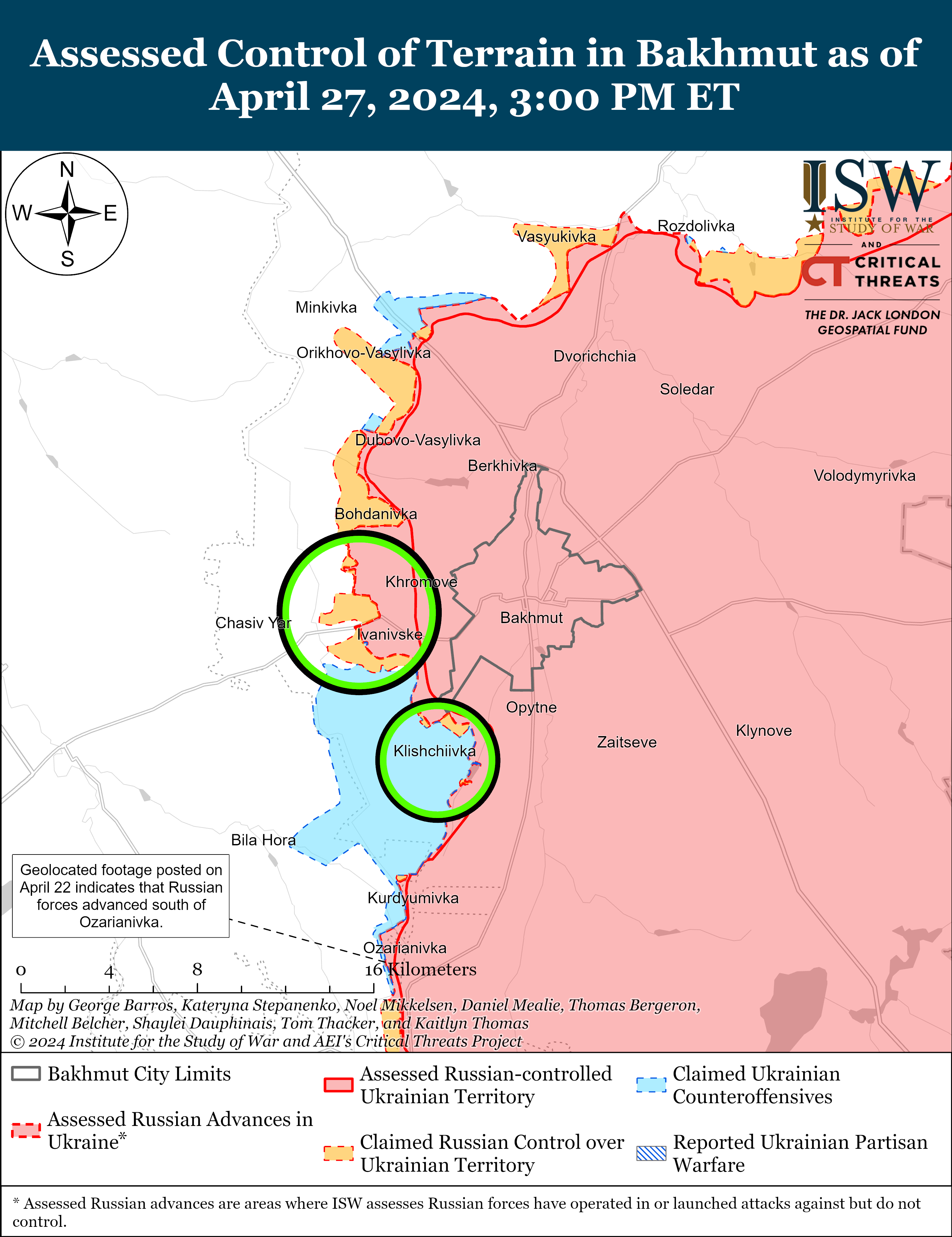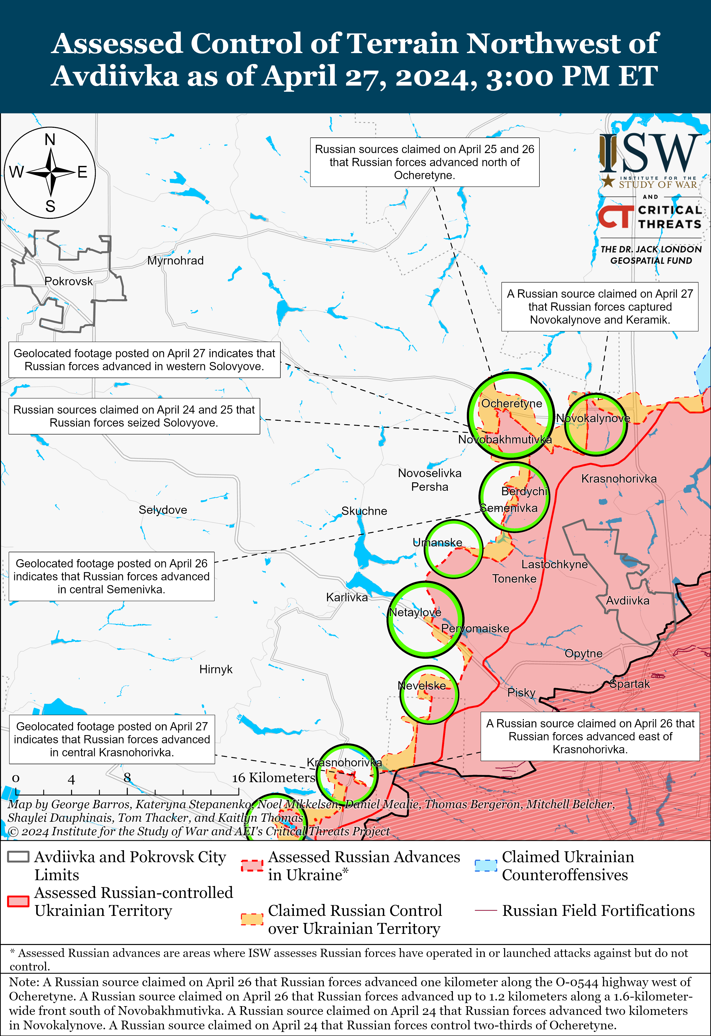 Russian forces are continuing to exploit a tactical penetration north and northwest of Avdiivka and recently made additional confirmed advances in the area. Geolocated footage published on April 27 shows that Russian forces advanced to northern Novokalynove (north of Avdiivka), and Russian milbloggers claimed that Russian forces completely seized the settlement on April 27.[17] Some milbloggers also claimed that Russian forces advanced into Keramik (directly northwest of Novokalynove), although ISW has not yet observed visual evidence of Russian forces in Keramik.[18] Geolocated footage published on April 27 also shows that Russian forces advanced in western Ocheretyne, in southwestern Solovyove, and to a treeline south of Novobakhmutivka (all northwest of Avdiivka).[19] Milbloggers claimed that Russian forces captured the entirety of Solovyove, which is consistent with available geolocated footage of Russian forces in the southwestern part of the settlement.[20] Several Russian sources also claimed that fierce fighting continued in western Berdychi (northwest of Avdiivka) and that Russian forces were pushing Ukrainian forces further west of the settlement.[21]