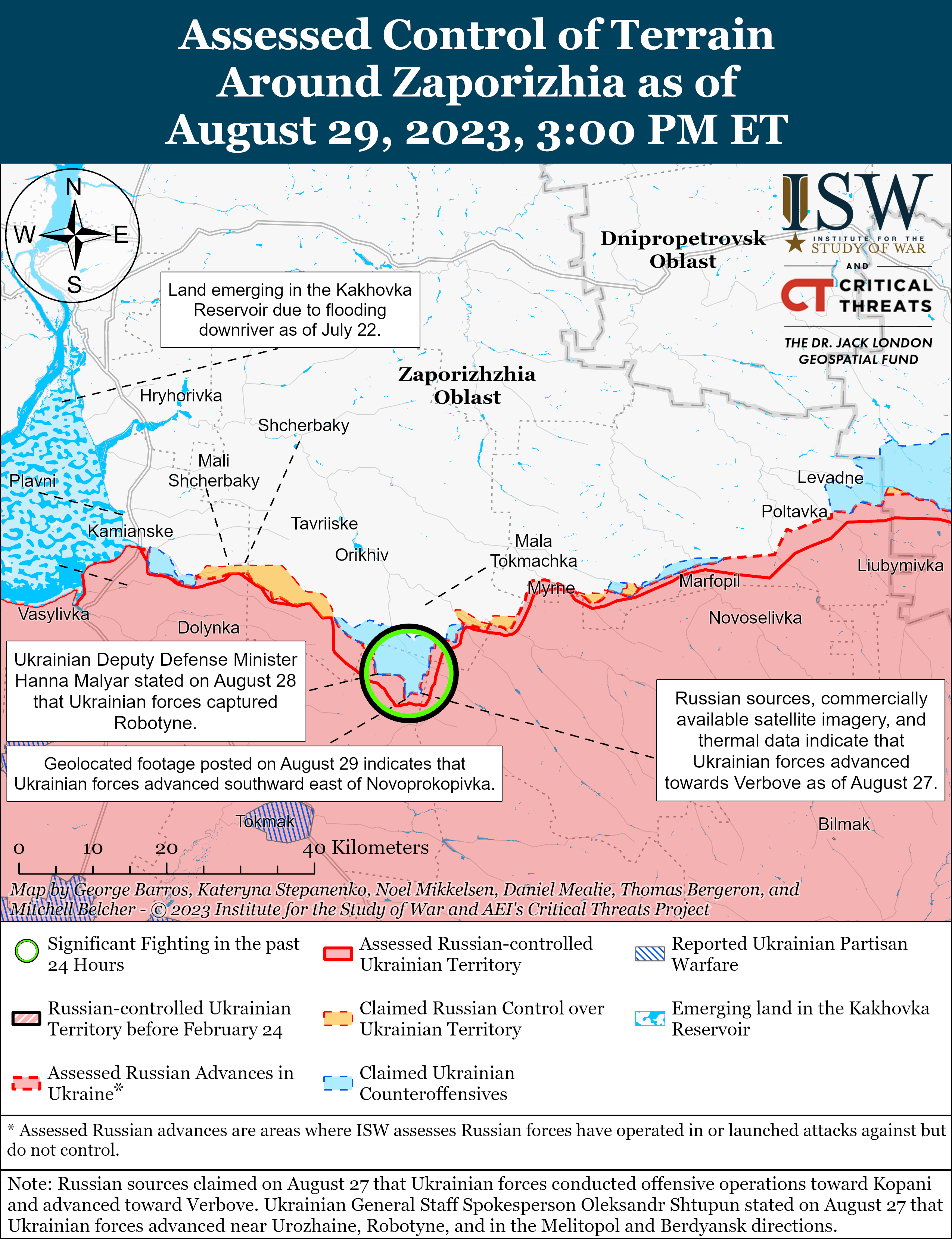 Ukrainian forces advanced near Bakhmut in Donetsk Oblast and Robotyne in western Zaporizhia Oblast on August 29. Geolocated footage published on August 29 indicates that Ukrainian forces advanced south of Bakhmut and about five kilometers southeast of Robotyne.[1] The Ukrainian General Staff reported that Ukrainian forces conducted offensive operations in the Bakhmut and Melitopol (western Zaporizhia Oblast) directions.[2] Ukrainian Tavriisk Group of Forces Spokesperson Oleksandr Shtupun reported on August 28 that Ukrainian forces continued to secure positions in Robotyne and are demining the area.[3] Shtupun reported that Ukrainian forces could bring more troops to the Robotyne area and would have greater opportunities for maneuver.[4] Shtupun noted that Robotyne is near the highway to Tokmak, an important Russian ground line of communication (GLOC).[5] A Russian milblogger suggested that Russian forces are continuing to commit a significant number of reserves, Airborne (VDV) elements, and TOS-1 thermobaric artillery systems to the area – likely indicating that Russian forces are worried about the vulnerability of their positions in Robotyne.[6] Another Russian milblogger claimed that Russian forces intend to deplete Ukrainian offensive potential by fixing Ukrainian forces in engagements in the settlement of Robotyne.[7]