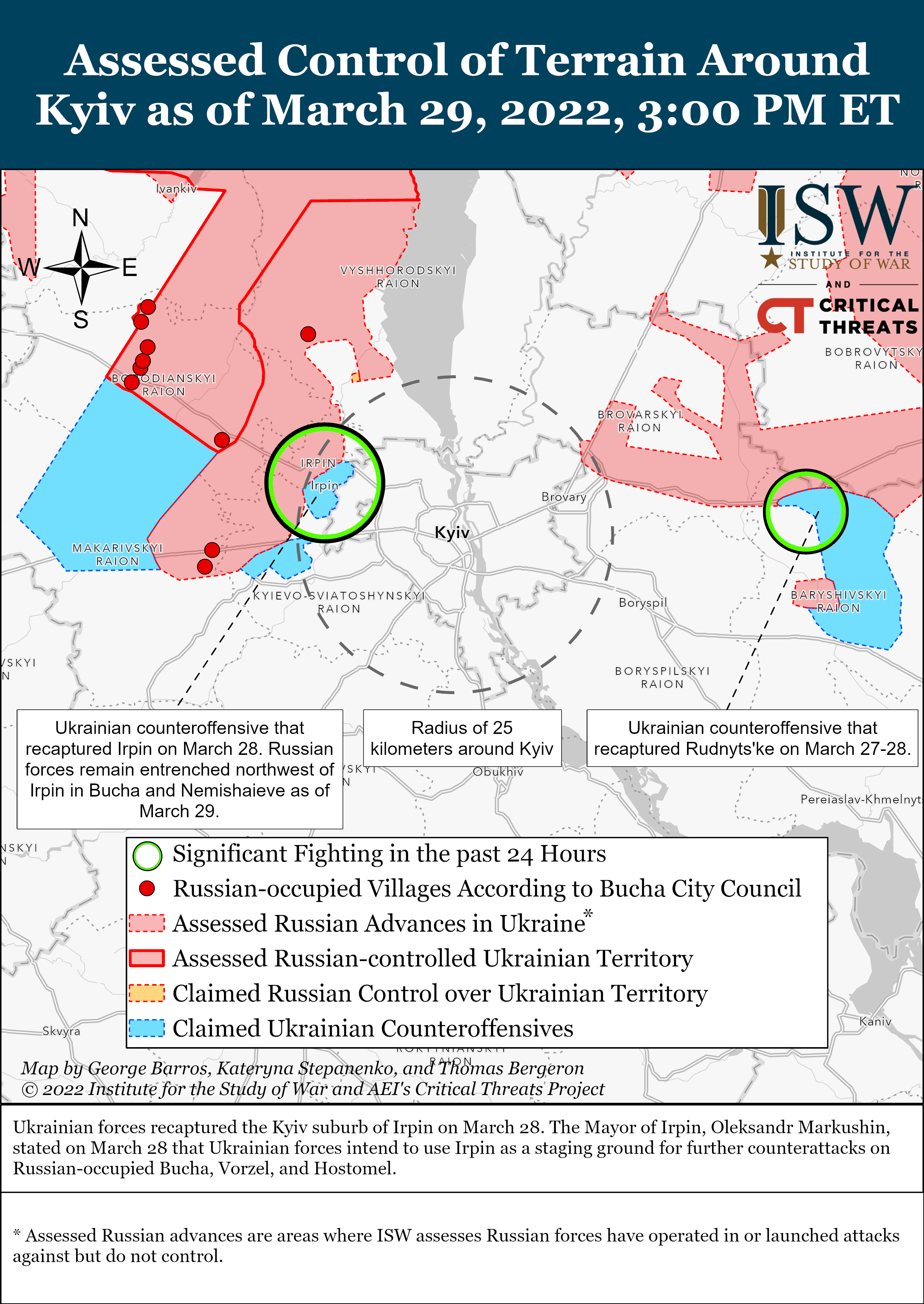 Russian forces are actively resisting Ukrainian counteroffensives in the Irpin and Hostomel areas and continued to shell Makariv and Irpin on March 29.[9] Russian troops remain dug in in the Bucha and Nemishyev areas just northwest of Irpin.[10] Russian artillery and rockets continue to fire at Ukrainian positions at many locations north and west of the capital.[11]