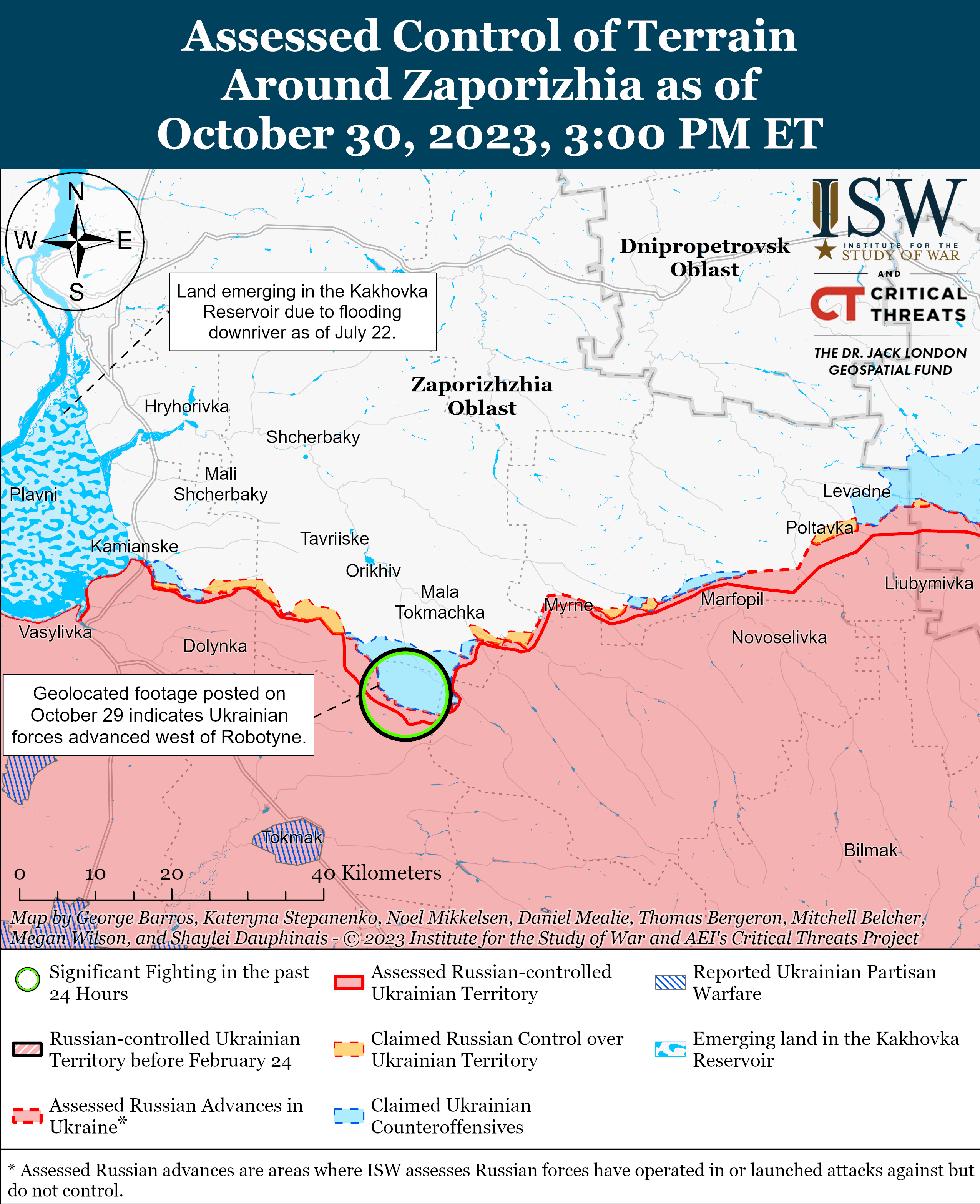 Ukrainian forces conducted offensive operations in western Zaporizhia Oblast on October 30 and made a confirmed gain. Geolocated footage published on October 29 indicates that Ukrainian forces advanced west of Robotyne (10km south of Orikhiv).[63] Russian sources, including the Russian Ministry of Defense (MoD), claimed on October 29 and 30 that Ukrainian forces unsuccessfully attacked northwest of Verbove (9km east of Robotyne) and near Kopani (7km northwest of Robotyne), Robotyne, and Novoprokopivka (2km south of Robotyne).[64]