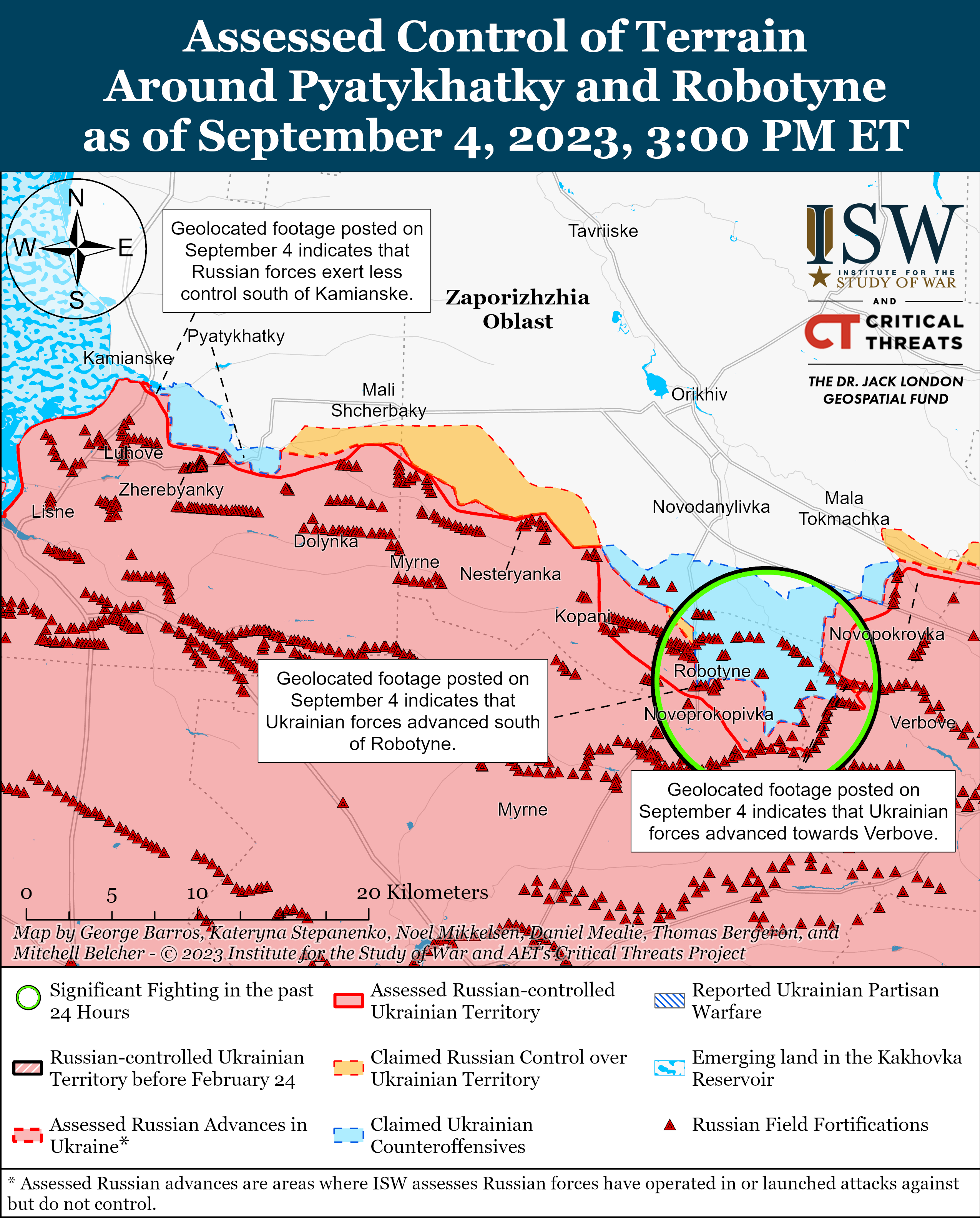 Ukrainian forces conducted offensive operations in western Zaporizhia Oblast on September 4 and made tactically significant advances. Geolocated footage published on September 4 shows that Ukrainian forces advanced south of Robotyne (9km south of Orikhiv) and west of Verbove (18km southeast of Orikhiv).[59] Ukrainian Deputy Defense Minister Hanna Malyar reported that Ukrainian forces continue offensive operations in the Melitopol direction (western Zaporizhia Oblast) and achieved unspecified successes in the direction of Novodanylivka (5km south of Orikhiv) and Novoprokopivka (13km south of Orikhiv).[60] Russian milbloggers claimed that Ukrainian forces advanced in contested areas east of Novoprokopivka in the direction of Ocheretuvate (25km southeast of Orikhiv).[61] A Russian milblogger claimed that Ukranian forces continue to advance near Robotyne and Verbove, while the Russian MoD and other Russian sources claimed that these attacks were unsuccessful.[62] Several Russian sources continued to claim that the southern part of Robotyne is contested and that Russian forces maintain defensive positions on the southern outskirts of the settlement.[63] A Russian source claimed that Ukrainian forces attacked near Dorozhnyanka (34km southeast of Orikhiv).[64]