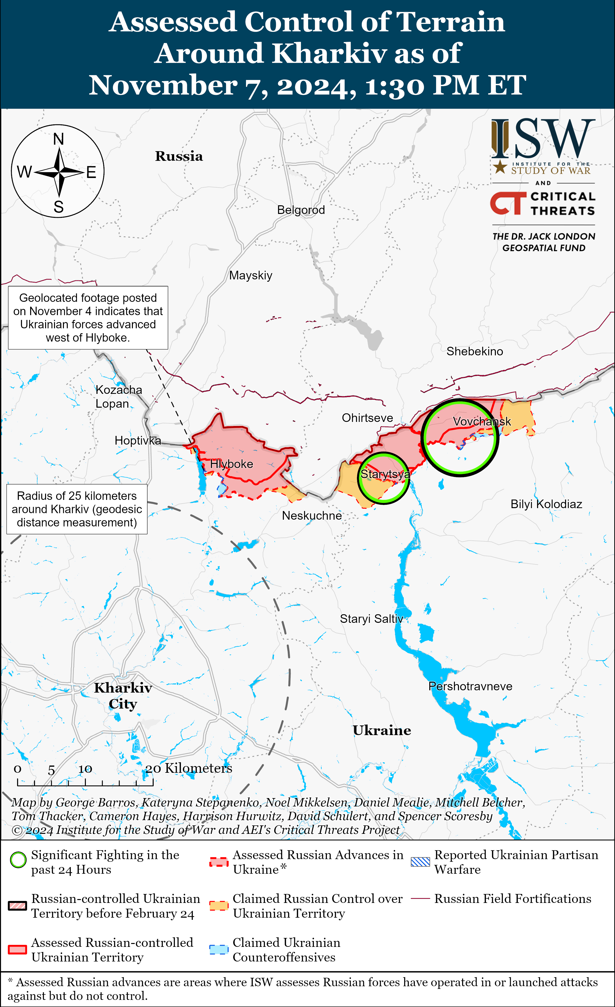 Russian forces continued offensive operations northeast of Kharkiv City near Vovchansk and Starytsya (southwest of Vovchansk) on November 6 and 7 but did not advance.[18] A spokesperson of a Ukrainian brigade operating in the Kharkiv direction stated on November 7 that Ukrainian forces managed to recapture nearly 400 hectares of Ukrainian land and several important forest strips in northern Kharkiv Oblast in October 2024.[19]