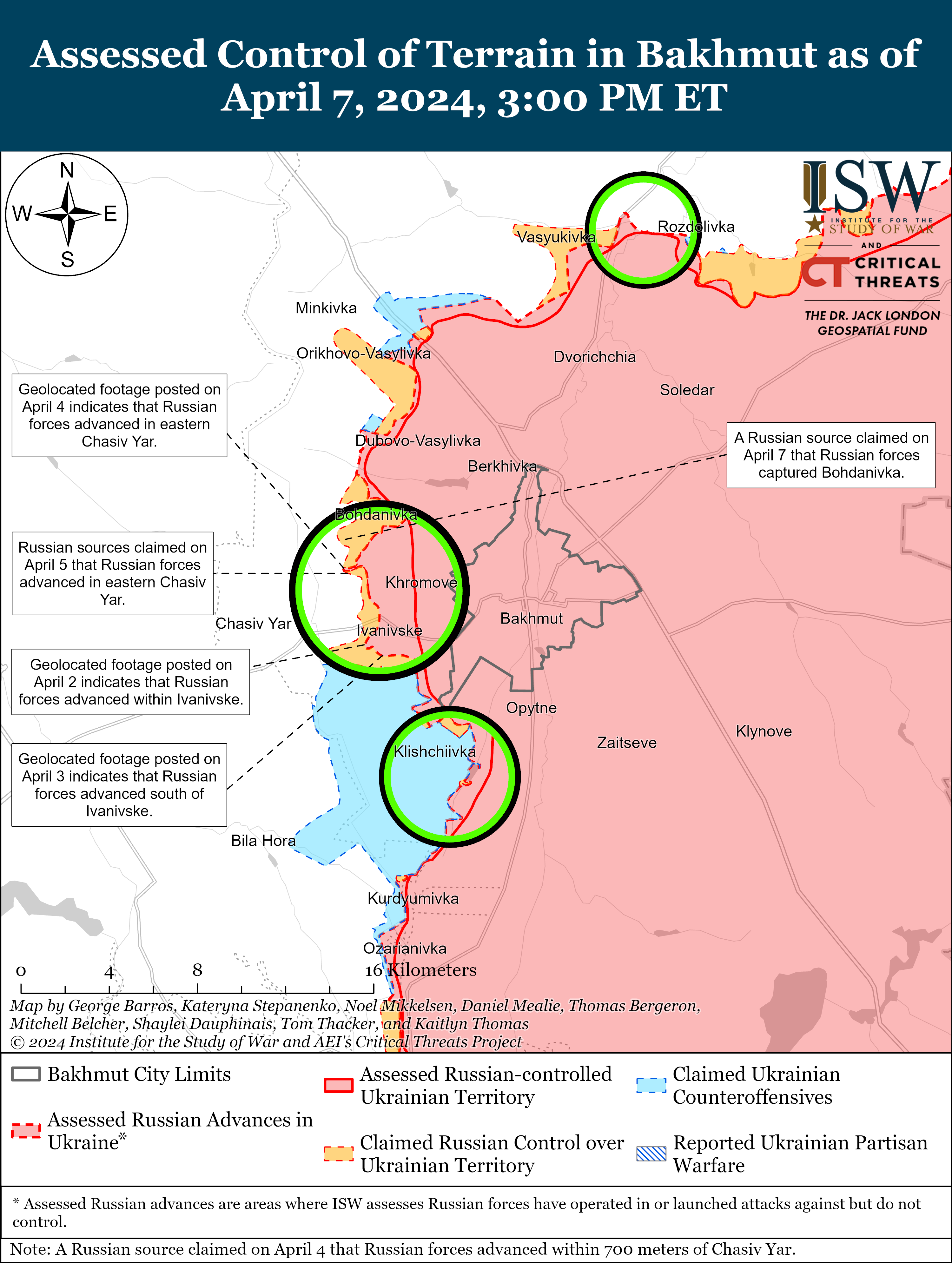 Russian forces reportedly advanced northwest and west of Bakhmut on April 7, but there were no confirmed changes to the frontline. A Russian milblogger claimed that Russian forces seized Bohdanivka (northwest of Bakhmut), while other Russian milbloggers claimed that fighting is ongoing in Bohdanivka and that Ukrainian forces maintain positions in the western outskirts of the settlement.[29] ISW has not yet observed visual evidence indicating that Russian forces entirely seized Bohdanivka. Russian milbloggers claimed that Russian forces, namely elements of the Russian 98th Airborne (VDV) Division, with support from elements of the 11th Separate VDV Brigade and 150th Motorized Rifle Division (8th Combined Arms Army [CAA], Southern Military District [SMD]), advanced in the Kanal Microraion on the eastern outskirts of Chasiv Yar (west of Bakhmut), although ISW has not observed visual evidence of this claim.[30] Positional engagements continued northwest of Bakhmut near Bohdanivka, west of Bakhmut near Ivanivske, and southwest of Bakhmut near Klishchiivka and Andriivka.[31] Ukrainian military observer Kostyantyn Mashovets reported on April 7 that elements of the Russian 7th Reconnaissance and Assault Brigade (Volunteer Corps) and 331st VDV Regiment (98th VDV Division) are operating near Bohdanivka and attempting to advance in the direction of Kalynivka (northeast of Bakhmut).[32] Mashovets stated that elements of the Russian 11th Separate VDV Brigade, 102nd Motorized Rifle Regiment (150th Motorized Rifle Division, 8th CAA, SMD), and 217th and 299th VDV Regiments (98th VDV Division) are conducting the most aggressive attacks near Ivanivske and east of Chasiv Yar. Mashovets stated that elements of the Russian 6th Motorized Rifle Division and 72nd Motorized Rifle Brigade (both of the 3rd Army Corps) and elements of the 88th Motorized Rifle Brigade (2nd Luhansk People’s Republic [LNR] Army Corps) are attempting to bypass Klishchiivka and push Ukrainian forces west of the Siverskyi-Donets Donbas Canal.