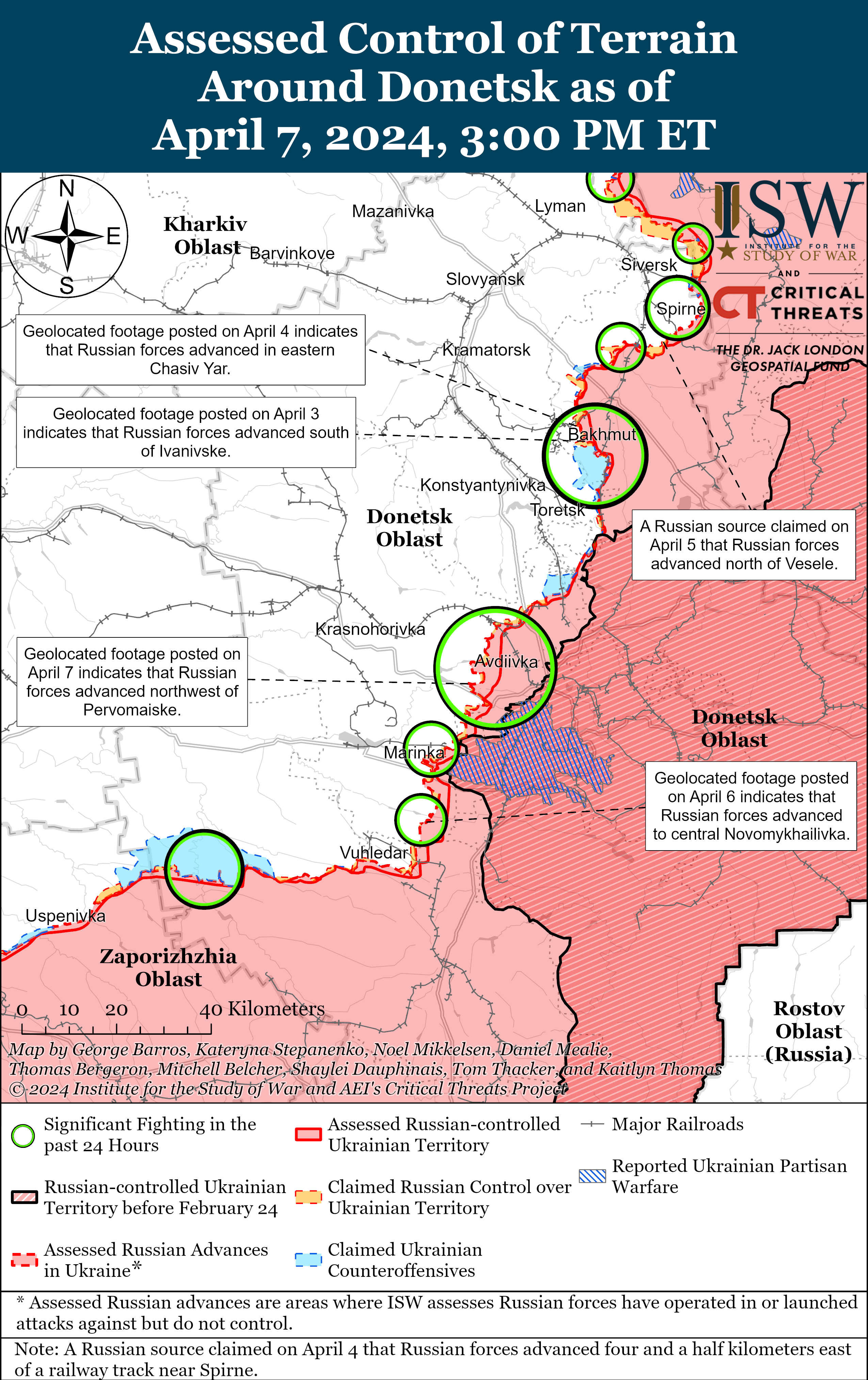 - Russian forces recently made confirmed advances near Avdiivka amid continued positional fighting along the entire line of contact on April 7.
