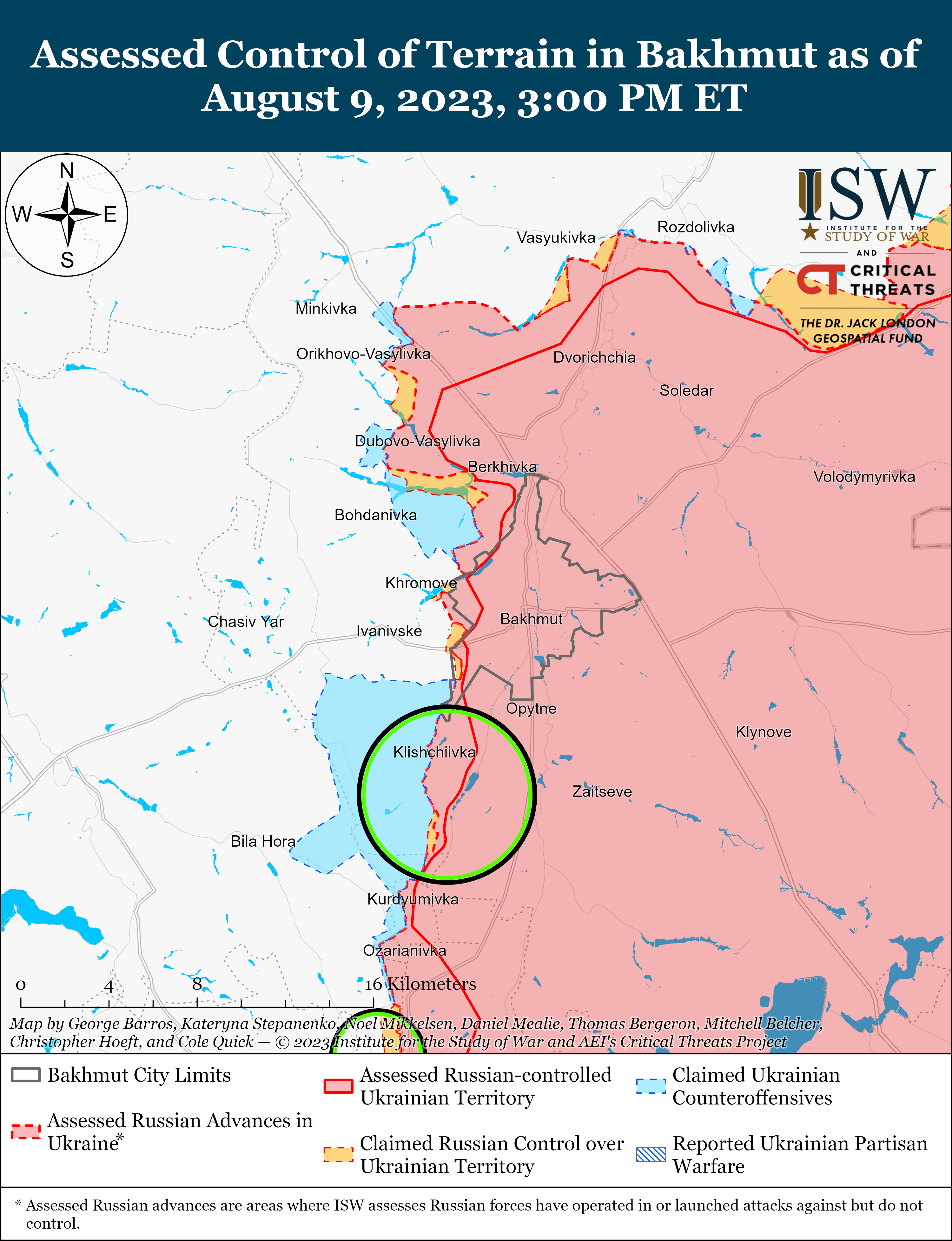 Russian forces continued limited counterattacks in the Bakhmut area on August 9 and recently advanced north of Bakhmut. Geolocated footage published on August 8 indicates that Russian forces advanced west of Yahidne (2km north of Bakhmut).[60] The Ukrainian General Staff reported on August 9 that Ukrainian forces repelled Russian assaults on the outskirts of Klishchiivka, northeast of Druzhba (20km southwest of Bakhmut), and near Zaitseve (21km south of Bakhmut), and Ukrainian Deputy Defense Minister Hanna Malyar added that Russian forces consistently counterattack in these areas.[61] A Russian milblogger claimed that Russian forces also unsuccessfully counterattacked near Kurdyumivka.[62] Another Russian milblogger claimed that Russian forces conducted successful counterattacks near Klishchiivka on August 7 and 8 and pushed Ukrainian forces from several unspecified strongholds, although ISW has not observed visual confirmation of this claim.[63]