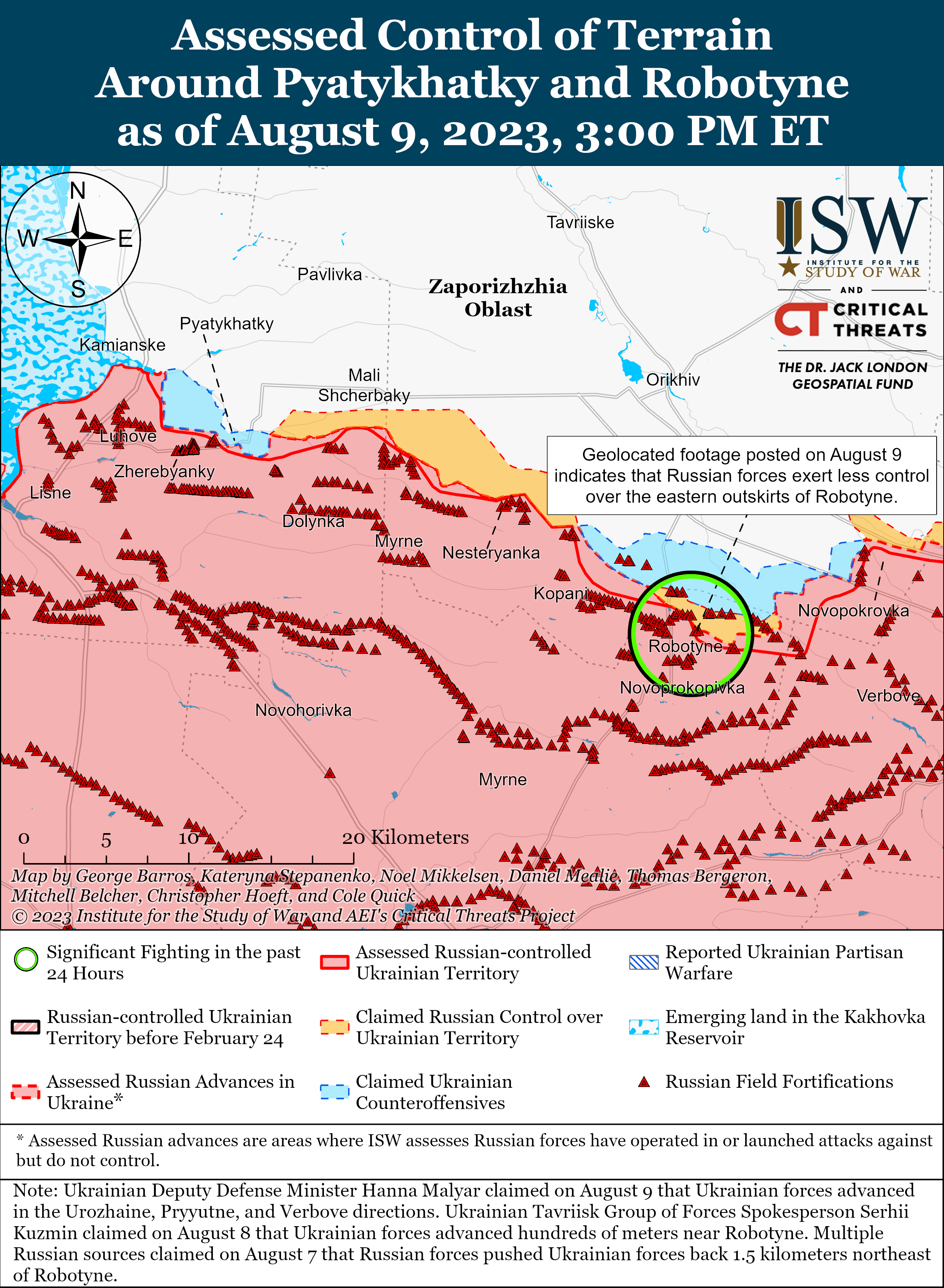 Ukrainian forces continued offensive operations in western Zaporizhia Oblast and reportedly advanced on August 9. Geolocated footage published on August 9 shows that Ukrainian forces recently advanced northeast of Robotyne (12km south of Orikhiv), but the extent and duration of this presence are unclear due to geolocated footage showing a Russian presence in the area and milblogger claims that the area is contested.[71] Ukrainian Tavriisk Operational and Strategic Group of Forces Spokesperson Serhii Kuzmin stated on August 8 that Ukrainian forces advanced hundreds of meters near Robotyne.[72] Malyar stated on August 9 that Ukrainian forces achieved partial success near Verbove (18km southeast of Orikhiv).[73] A prominent Russian milblogger claimed that Ukrainian forces entrenched themselves in new positions three kilometers northeast of Robotyne and consolidated control over an unspecified position but did not penetrate through Russian defenses, and other milbloggers reported continued attacks near Robotyne.[74] Another prominent milblogger claimed that Ukrainian forces pushed Russian forces from positions near Verbove but failed to capture the positions themselves.[75] Another milblogger claimed that Ukrainian forces have shifted the focus of their assaults from near Robotyne to the east towards Bilohirya (16km southeast of Orikhiv) in recent days.[76] A Russian milblogger claimed that Ukrainian forces attacked Russian positions north of Pyatykhatky (25km southwest of Orikhiv).[77]
