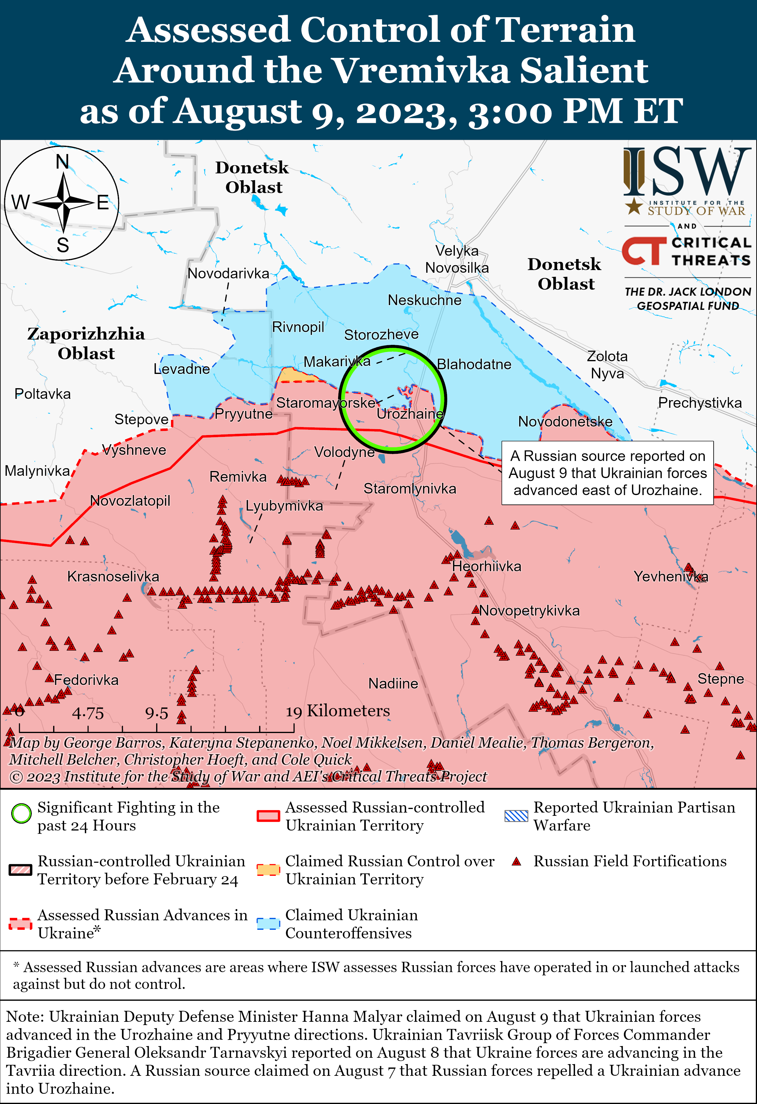 Ukrainian forces continued counteroffensive operations on at least three sectors of the front and advanced in some areas on August 9. The Ukrainian General Staff reported that Ukrainian forces continued counteroffensive operations in the Bakhmut, Berdyansk (Donetsk-Zaporizhia Oblast border area), and Melitopol (western Zaporizhia Oblast) directions.[27] Geolocated footage published on August 9 suggests that Ukrainian forces advanced northeast of Robotyne in western Zaporizhia Oblast, but the duration and extent of these advances are currently unclear.[28] Ukrainian Tavriisk Operational and Strategic Group of Forces Spokesperson Serhii Kuzmin stated on August 8 that Ukrainian forces reached the Russian first line of defense in an unspecified area in the Melitopol or Berdyansk directions.[29] Ukrainian Deputy Defense Minister Hanna Malyar reported on August 9 that Ukrainian forces were partially successful south of Velyka Novosilka near Urozhaine and Pryyutne and southeast of Orikhiv near Verbove.[30] A prominent Russian milblogger claimed that Ukrainian forces advanced into Urozhaine in the Donetsk-Zaporizhia Oblast border area and suggested that Ukrainian forces may have captured some Russian positions south of Bakhmut.[31] Malyar stated that the Ukrainian forces are conducting the counteroffensive as expected and are successfully degrading Russian offensive potential as Ukrainian forces did during the summer-autumn 2022 interdiction campaign in Kherson Oblast.[32]