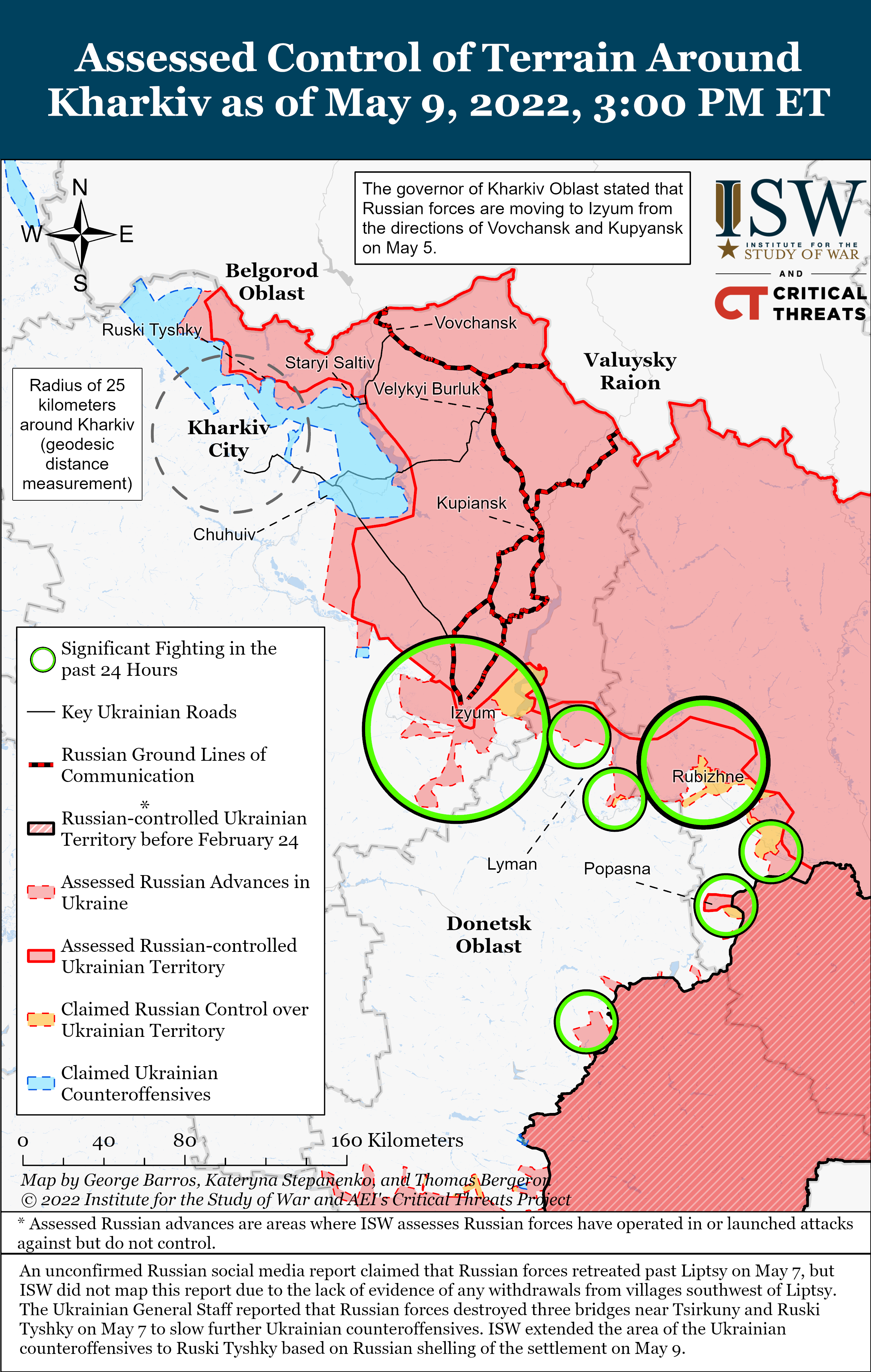 ISW cannot confirm if Russian forces withdrew past Ruski Tyshky, a settlement approximately 18 northeast kilometers of Kharkiv City.[23] The senior US defense official said that Ukrainian forces pushed Russian forces nearly 48 kilometers east in the past week, likely referring to the Ukrainian liberation of Staryi Saltiv on May 2.[24] Pro-Russian Telegram channels posted images of Victory Day celebrations in occupied Kozacha Lopan, despite previous unconfirmed reports that Ukrainian forces were fighting near the settlement on May 7.[25]