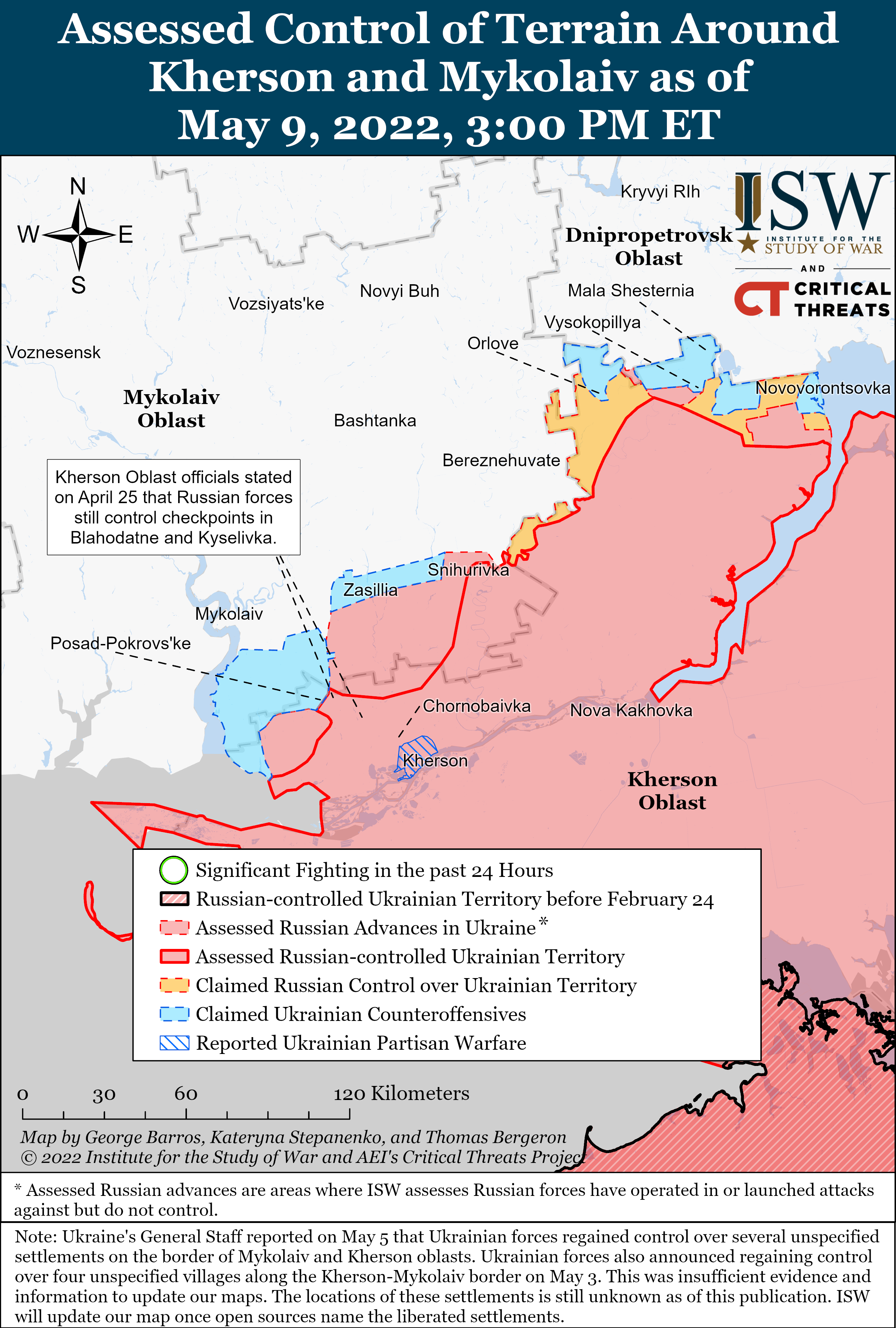 Russian forces continued to target Odesa with missile strikes on May 8 and 9.[31] An unnamed US defense official said that Russia has no ability to threaten Odesa from the sea and the ground, despite consistent missile strikes and ongoing aerial reconnaissance.[32] Russian forces will likely continue to shell Odesa but are unlikely to inflict significant damage or resume advances towards the city. The official also noted that the US has no confirmation that Ukrainian forces recaptured Snake Island, off the coast of Odesa Oblast.[33] Russian and Transnistrian sources claimed Ukrainian forces closed the border with Moldova on May 9 amidst growing tensions in Transnistria, although ISW cannot independently verify this claim.[34]
