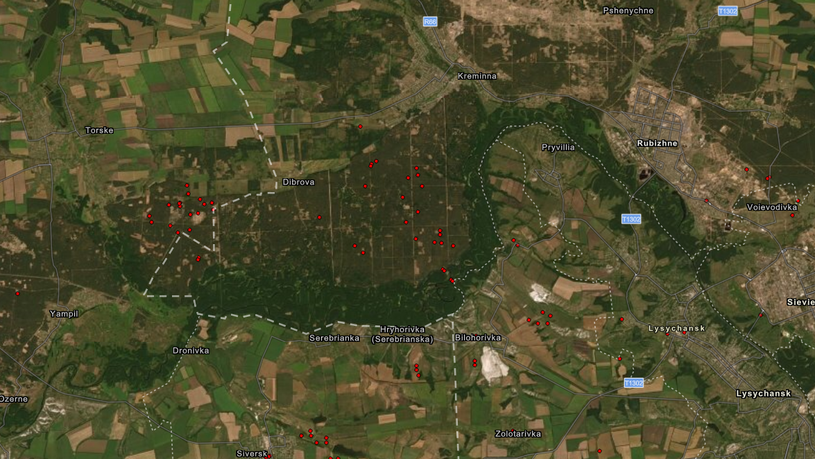 Russian forces continued attacks westward in Donetsk and Luhansk Oblasts and made marginal gains around Severodonetsk on May 9. Troops of the self-proclaimed Luhansk People’s Republic (LNR) reportedly captured Nyzhnje and are fighting for control of Toshkivka, about 25 kilometers southeast of Severodonetsk.[13] Ukrainian sources reported fierce fighting around Rubizhne and Vojevodivka, immediately to the north of Severodonetsk and in Bilohorivka, about 25 kilometers west of Severodonetsk.[14] NASA’s Fire Information for Resource Management System (FIRMS) imagery showed fires in the area west of Severodonetsk around Bilohorivka, Pryvillya and Novodruzhesk, likely indicating that Russian forces are shelling Ukrainian positions in this area in order to encircle Severodonesk and Rubizhne from the west and continue to push towards the Donetsk Oblast border.[15]