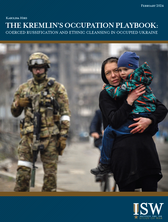 Russia is now applying these means and methods of occupation on an expanded scale in the Ukrainian territories it occupied since the full-scale invasion that began on February 24, 2022. The Kremlin’s occupation design aims to eliminate Ukrainian identity by forcibly integrating occupied Ukraine into Russia socially, culturally, linguistically, politically, economically, religiously, and bureaucratically. Moscow ultimately seeks to persuade Kyiv and its supporters that the forced integration of Ukraine into Russia, and the resulting elimination of Ukrainian identity, are permanent and irreversible so that the Kremlin can fully subjugate these territories and people for its own gain.