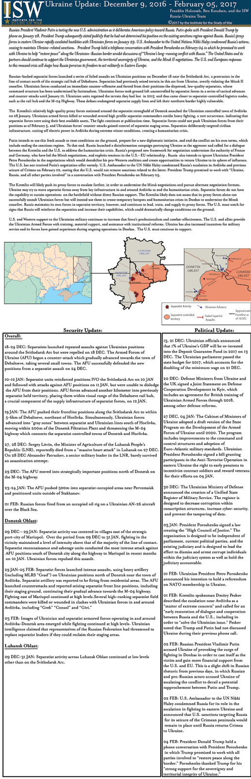 Putin intends to use this fresh assault to reset conditions on the ground, prepare for a new diplomatic initiative, and end the conflict on his own terms, which include ending the sanctions regime. To that end, Russia launched a disinformation campaign portraying Ukraine as the aggressor and called for a dialogue between the Kremlin and the U.S. to address the humanitarian crisis. Russia’s proposed new framework for negotiation undermines the authority of France and Germany, who have led the Minsk negotiations, and exploits tensions in the U.S.- EU relationship . Russia also intends to ignore Ukrainian President Petro Poroshenko in the negotiations which would destabilize his pro-Western coalition and create opportunities to return Ukraine to its sphere of influence. The U.S. has not received Putin’s negotiation offer warmly. U.S. Ambassador to the UN Nikki Haley condemned Russia’s escalation in Avdiivka and previous seizure of Crimea on February 02, stating that the U.S. would not remove sanctions related to the latter. President Trump promised to work with “Ukraine, Russia, and all other parties involved” in a conversation with President Poroshenko on February 05.