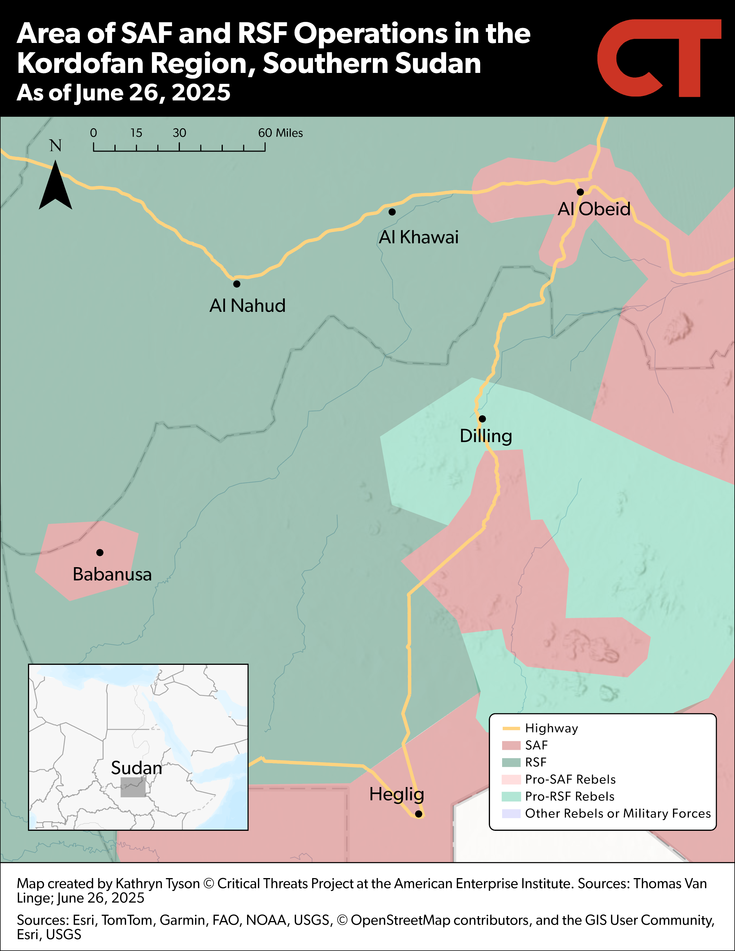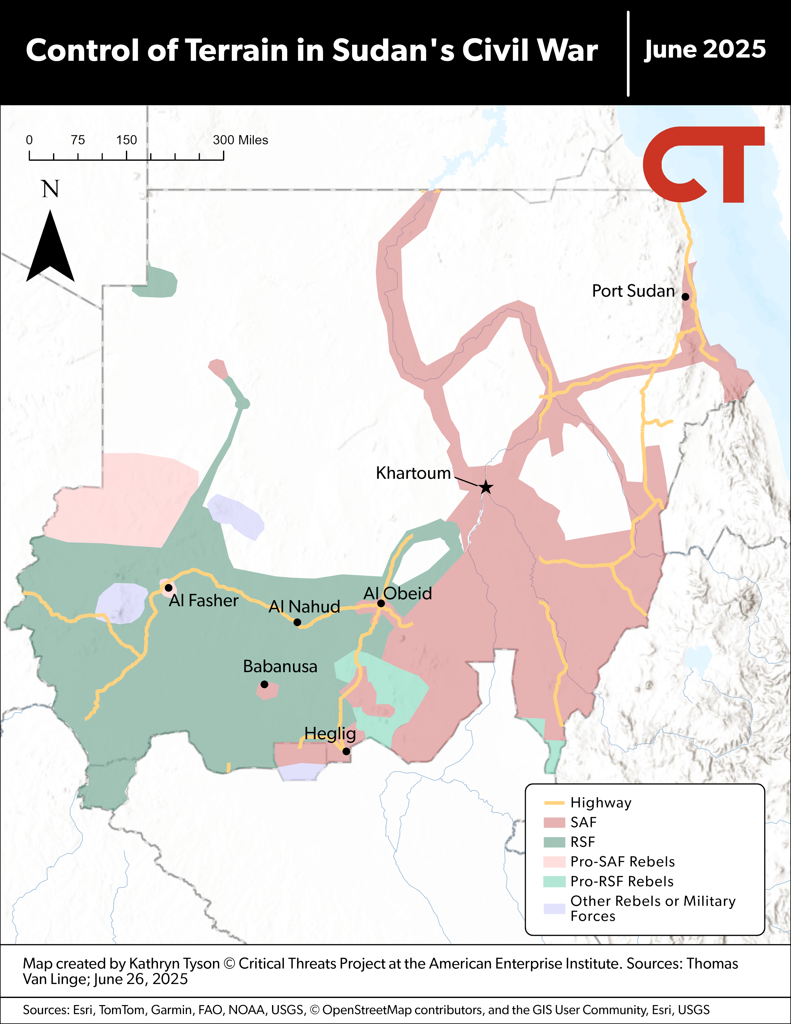 The Rapid Support Forces (RSF) launched a major attack against a key Sudanese Armed Forces (SAF) position in West Kordofan, southern Sudan. The RSF on June 20 launched its largest coordinated offensive against the SAF’s 22nd Infantry Division headquarters in Babanusa since the RSF began besieging the town in 2023.[39] The attack followed two days of RSF artillery shelling against Babanusa and SAF drone strikes targeting RSF positions on the city’s outskirts.[40] The SAF repelled the offensive but remains vulnerable as the SAF has been unable to send reinforcements and the division relies on irregular airdrops for essential supplies.[41] The RSF reportedly deployed new reinforcements to the city over the past week to encircle the town from the north and east, according to local witnesses.[42]