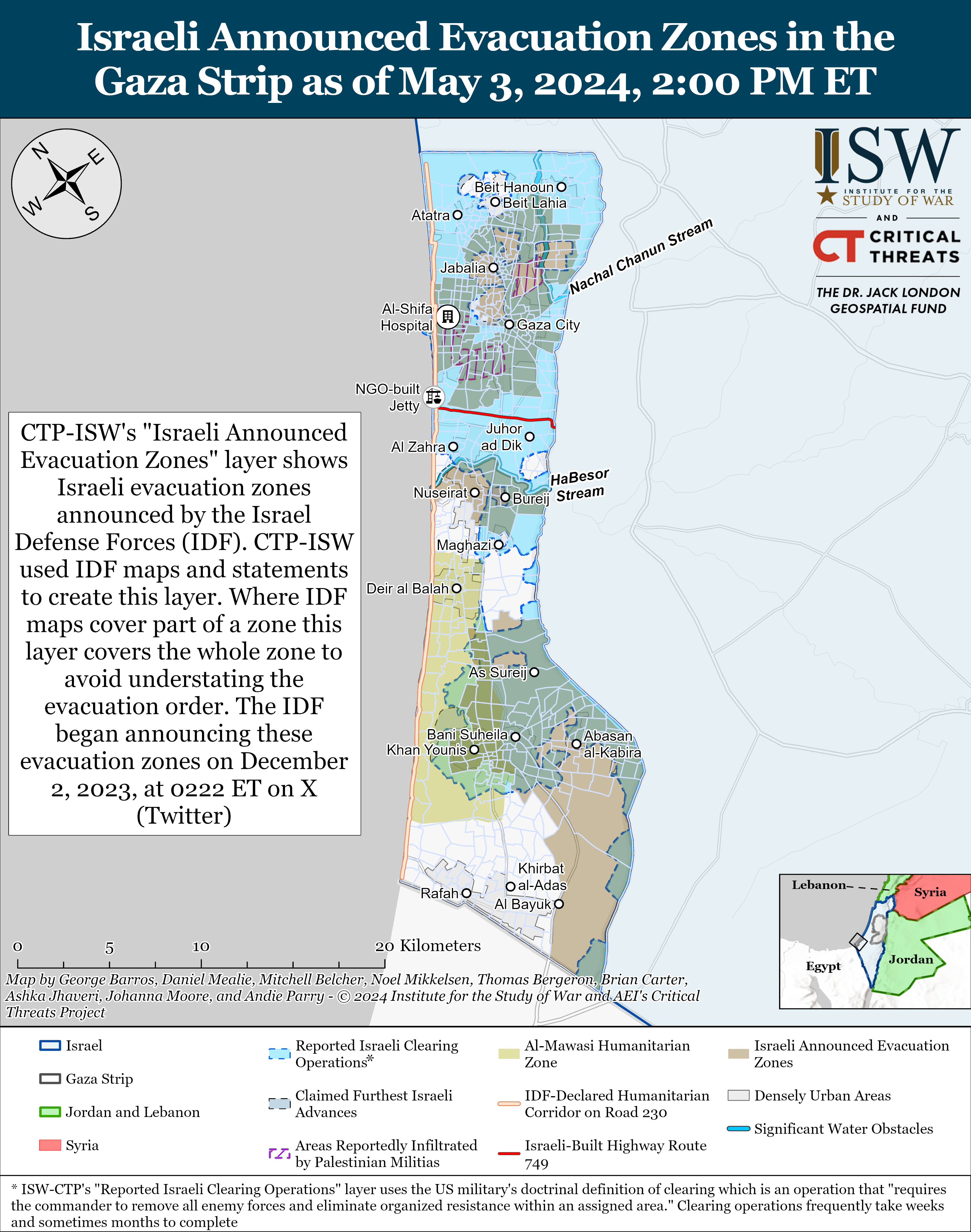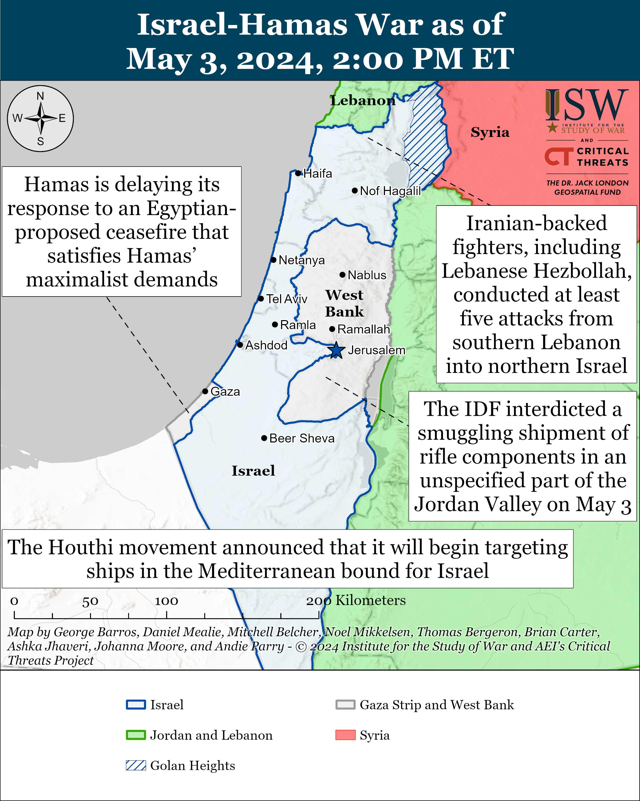 Hamas is delaying its response to an Egyptian-proposed ceasefire that satisfies Hamas’ maximalist demands. The ceasefire proposal includes a three-phased plan for the release of Israeli hostages, a ceasefire lasting up to five years, and the gradual withdrawal of all Israeli forces from the Gaza Strip. Hamas believes any ceasefire is an interim “rest” before Israel’s ultimate destruction.[8] The head of Hamas in the Gaza Strip, Yahya Sinwar, is the key decision-maker in the negotiations because he has control over Hamas’ forces in the Gaza Strip. Egyptian officials told the Wall Street Journal on May 3 that Sinwar has not yet responded to the proposal.[9] Sinwar has previously refused ceasefire proposals.[10] US and Israeli officials have noted since April 2024 that Hamas has been intransigent in negotiations and refusing to agree to a ceasefire despite Israeli concessions.[11]