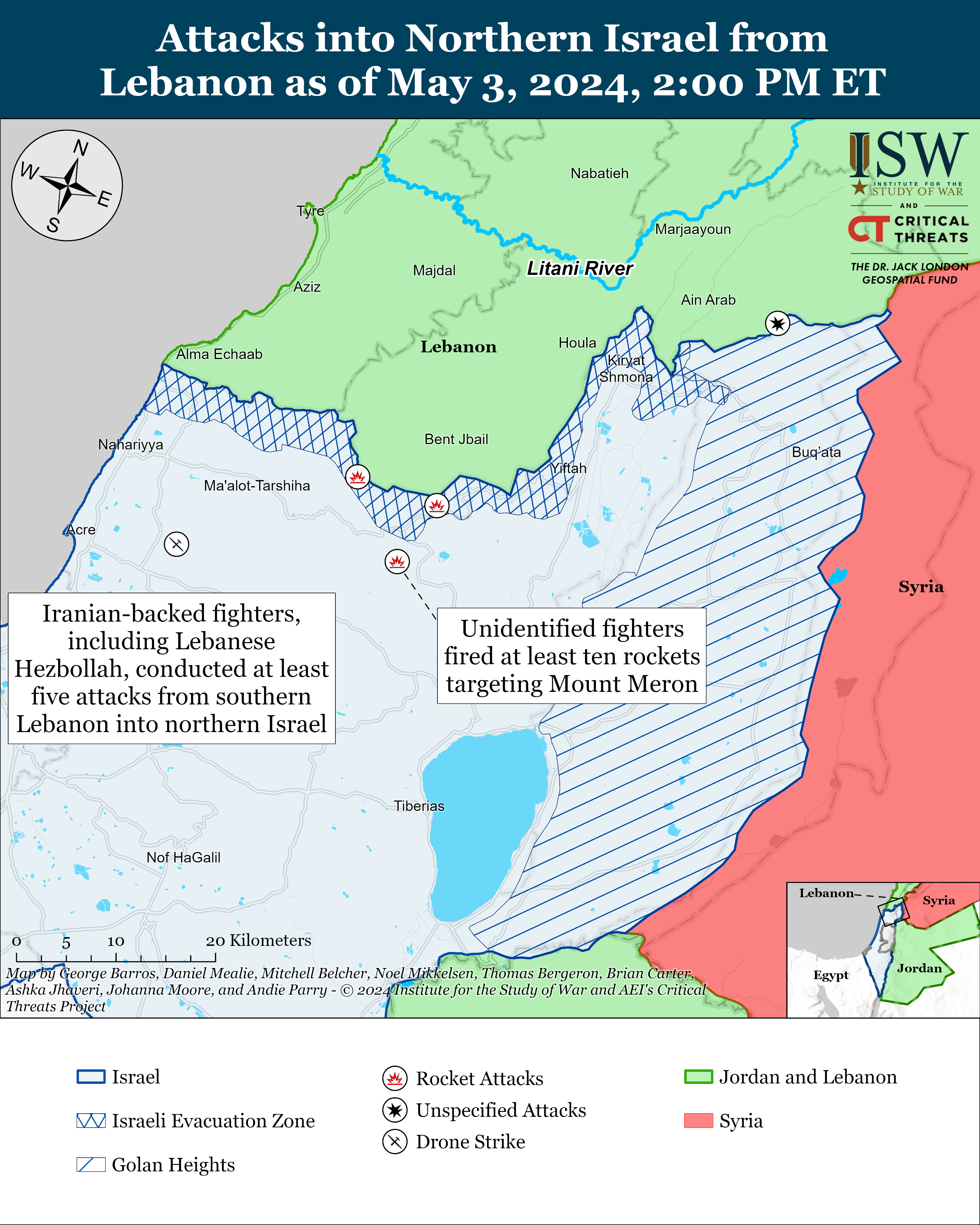 Iranian-backed fighters, including Lebanese Hezbollah, have conducted at least five attacks from southern Lebanon into northern Israel since CTP-ISW’s last data cutoff on May 2.[26] The IDF stated that Hezbollah fired a barrage of at least 10 rockets from Lebanon targeting unspecified sites near Mount Meron on May 3.[27] Israeli media reported that Hezbollah fired approximately 18 rockets towards the Mount Meron area.[28] The IDF said that the rockets landed in open areas without injuries or material damage.[29]