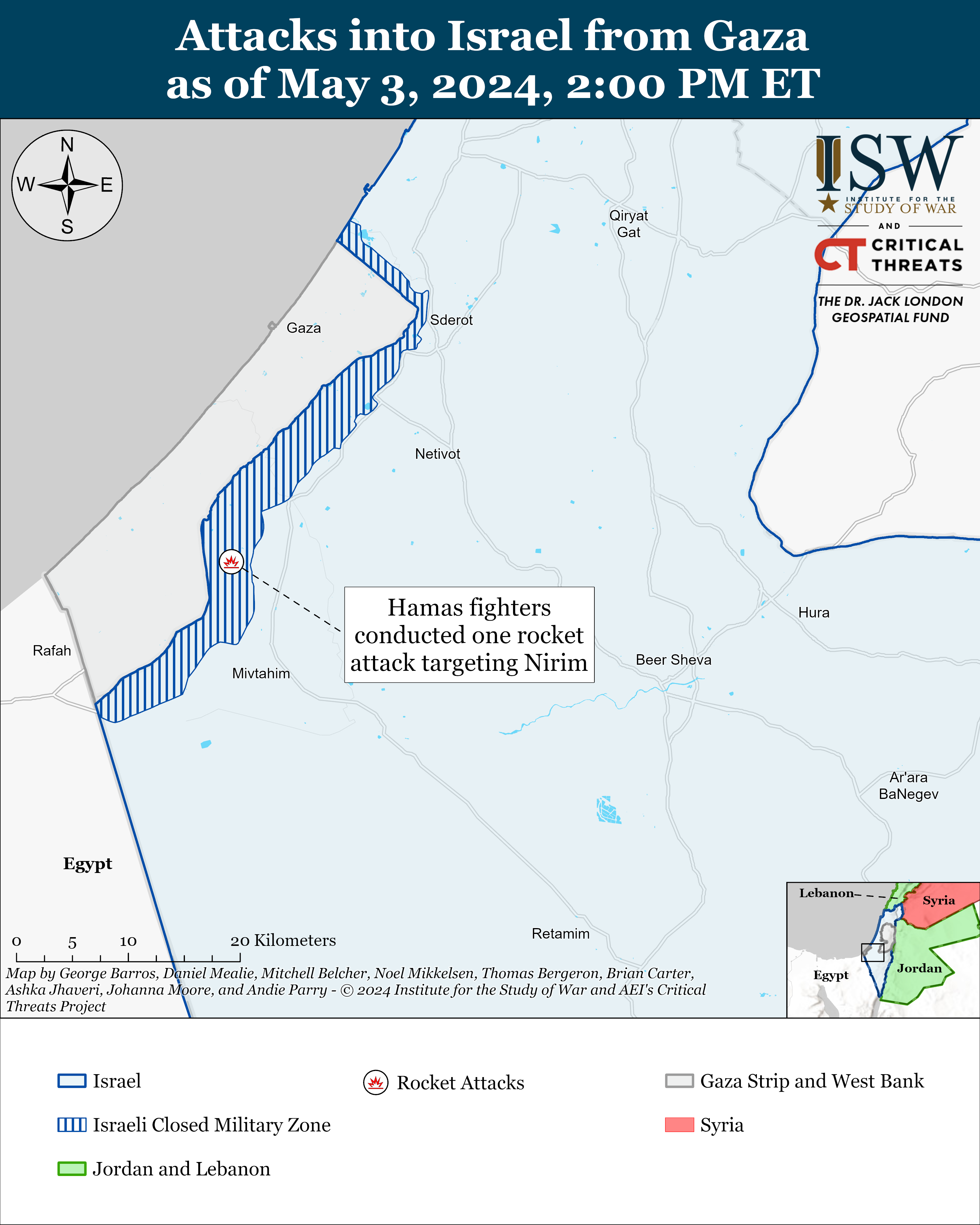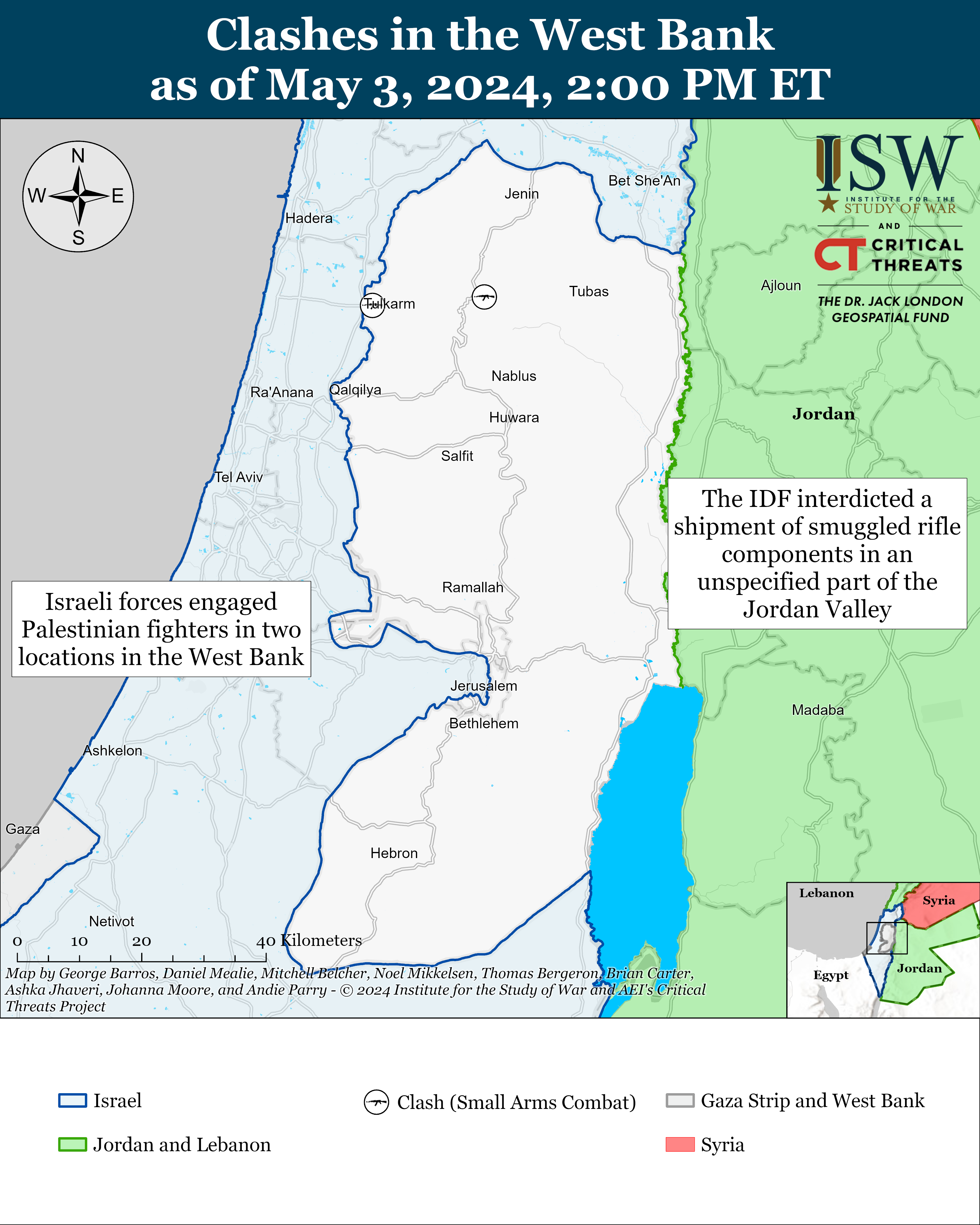 Israeli forces have engaged Palestinian fighters in at least two locations in the West Bank since CTP-ISW’s last data cutoff on May 2.[17] Unspecified Palestinian fighters clashed with Israeli forces near Tulkarm on May 2 according to Palestinian media.[18] The Al Aqsa Martyrs’ Brigade targeted Israeli forces and armored vehicles in Jaba, Jenin governorate, with ”machine guns” on May 3.[19]