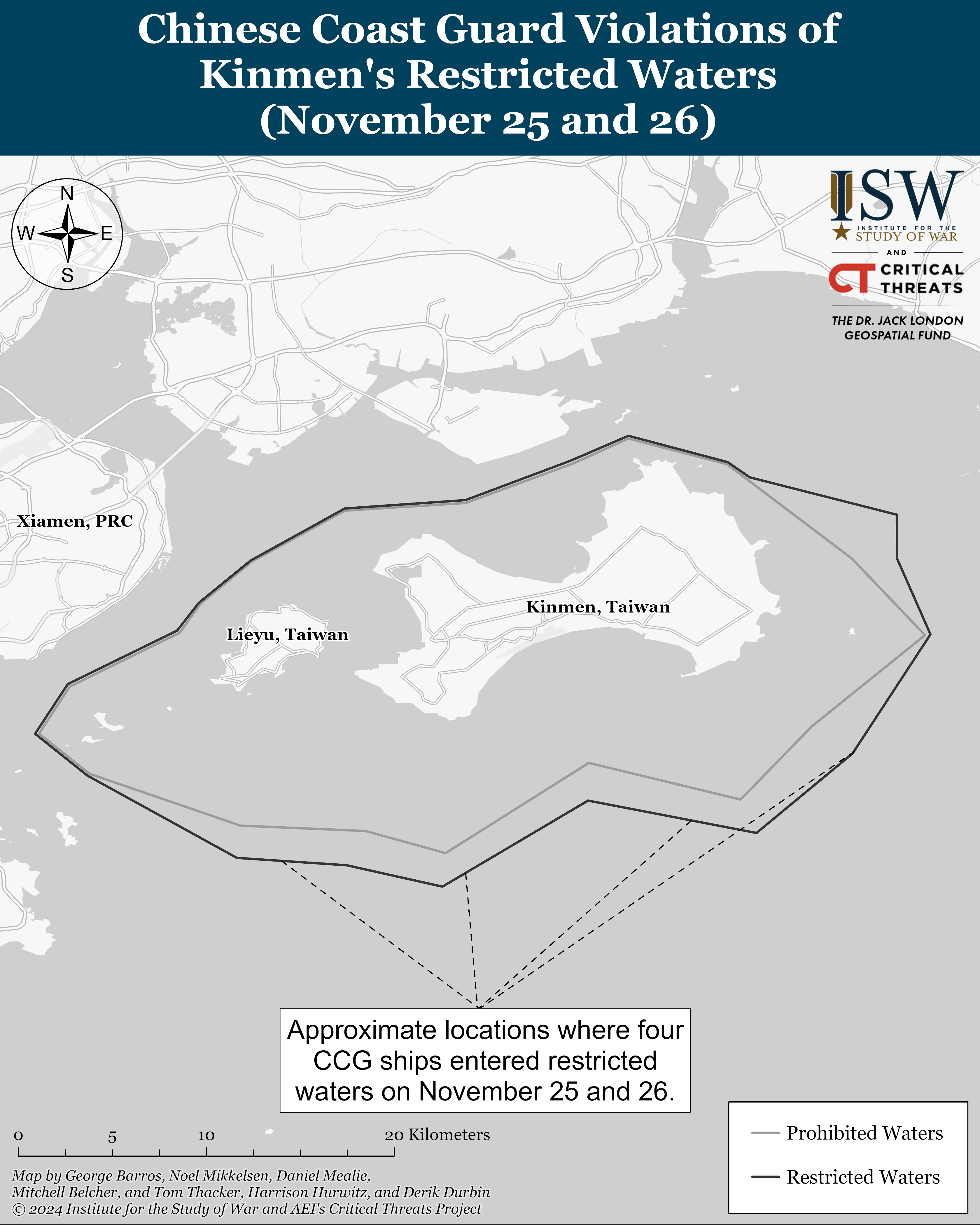 Four China Coast Guard (CCG) ships entered restricted waters around Taiwan’s Kinmen islands on November 25th and 26th. Kinmen is a Taiwanese island group located three kilometers (1.9 miles) from the PRC’s coast.[25] Four CCG ships entered Kinmen’s southern restricted waters at four different locations on November 25 for approximately two hours.[26] The same four ships returned the next morning on November 26 to the same locations.[27] CCG ships intrude into Kinmen’s restricted waters in an effort to assert PRC law enforcement control, desensitize Taiwan to incursions in its restricted waters, and expend Taiwanese Coast Guard resources. Regular CCG patrols in Kinmen’s restricted waters began in response to the February 14 capsizing incident this year, and they occur in areas where the PRC may station ships in the event of a quarantine or blockade of Kinmen.[28] Taiwan does not claim any territorial waters around Kinmen partly due to its proximity to the PRC, but it designates “prohibited” and “restricted” waters around Kinmen which it treats as equivalent to territorial waters and a contiguous zone.