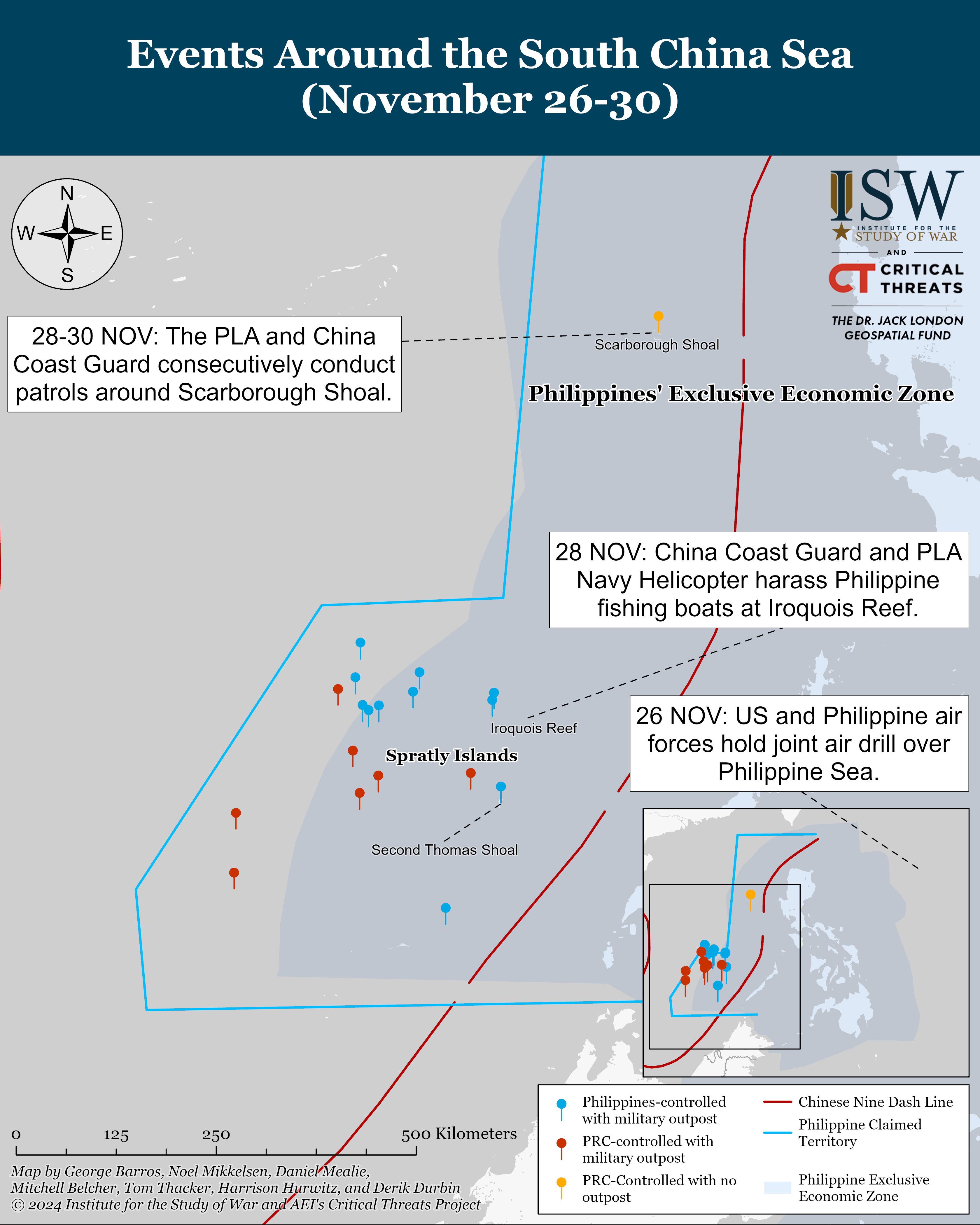 The PLA carried out military exercises the day after a joint United States-Philippines air exercise. This exercise marks the third occurrence of a symmetrical PLA response to joint United States-Philippine military exercises within Philippine maritime territory. On November 26 the United States and Philippine Air Forces carried out a joint exercise over the Western Pacific Ocean.[62] A statement from the US Air Force reported that this exercise was focused on improving force interoperability. The PLA Southern Theater Command carried out air and naval combat readiness patrols over Scarborough Shoal on November 28. The Southern Theater Command stated that this exercise was for the purpose of strengthening control and preserving national sovereignty over PRC territory.[63] This is the third time that the PLA has carried out military exercises in Scarborough Shoal following a joint exercise between the Philippines and its allies in Philippine maritime territory.[64] The PRC has established a precedent for responding in kind to joint military exercises in the South China Sea by the Philippines, which the PRC has repeatedly accused of acting provocatively and escalating tensions over disputed maritime territory. The CCG also conducted a patrol around Scarborough Shoal on November 30.[65]