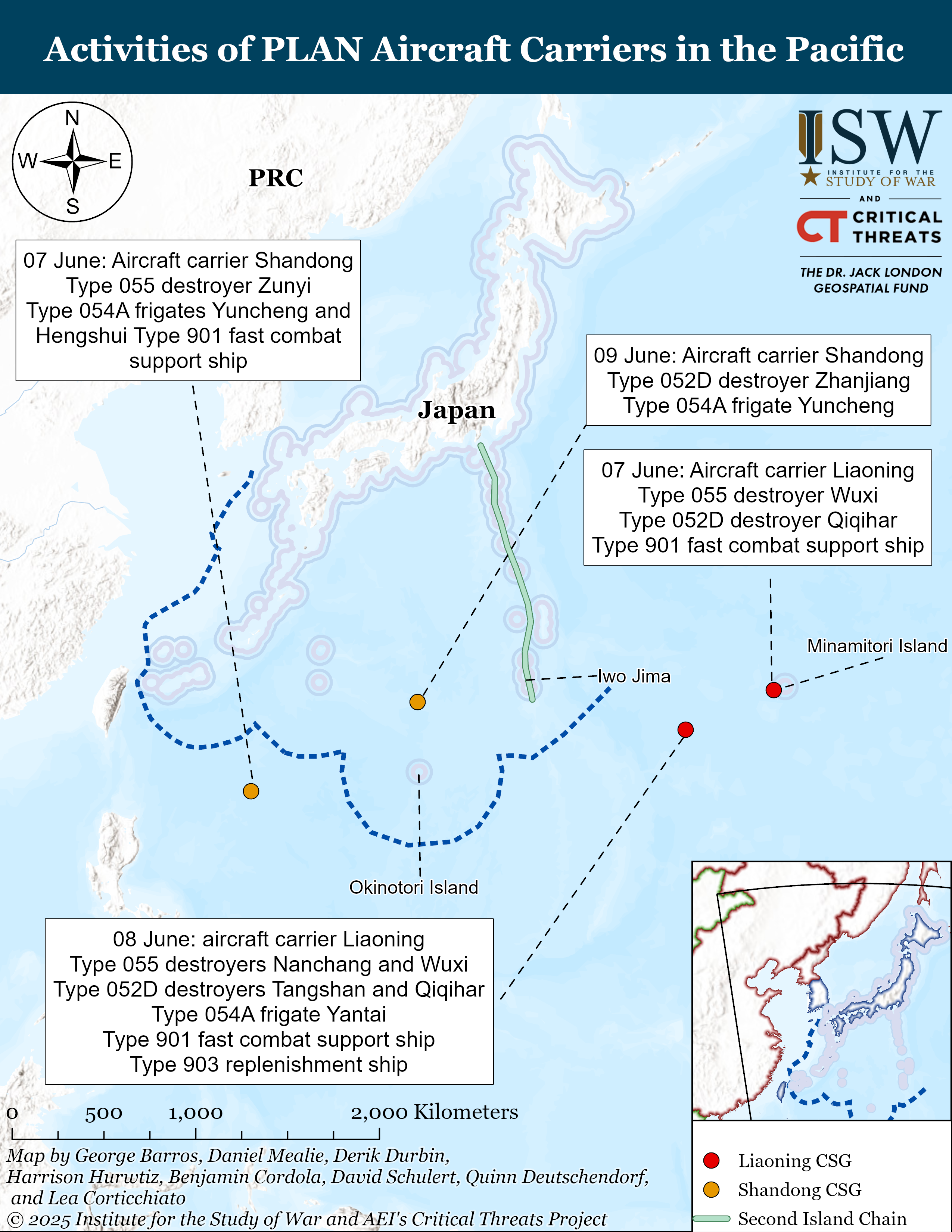 A PLA Navy (PLAN) carrier strike group (CSG) breached the second island chain for the first time. A second PLAN CSG simultaneously operated in the Pacific. Japan’s Ministry of Defense (MOD) announced that the PLAN Liaoning CSG entered Japan’s Minamitori Island’s exclusive economic zone (EEZ) on June 7.[39] Minamitori Island is Japan’s easternmost territory, located approximately 1550 km northeast of Guam. The MOD previously tracked the Liaoning transiting through the Miyako Strait on May 27 and the Philippine Sea waters east of Samar Island on May 30. Four additional vessels joined the Liaoning CSG on June 8 while operating in international waters between Minamitori Island and Iwo Jima. Japan also confirmed on June 9 that the Shandong CSG was operating in the EEZ north of Okinotori Island and approximately 500 km southwest of Iwo Jima.[40]