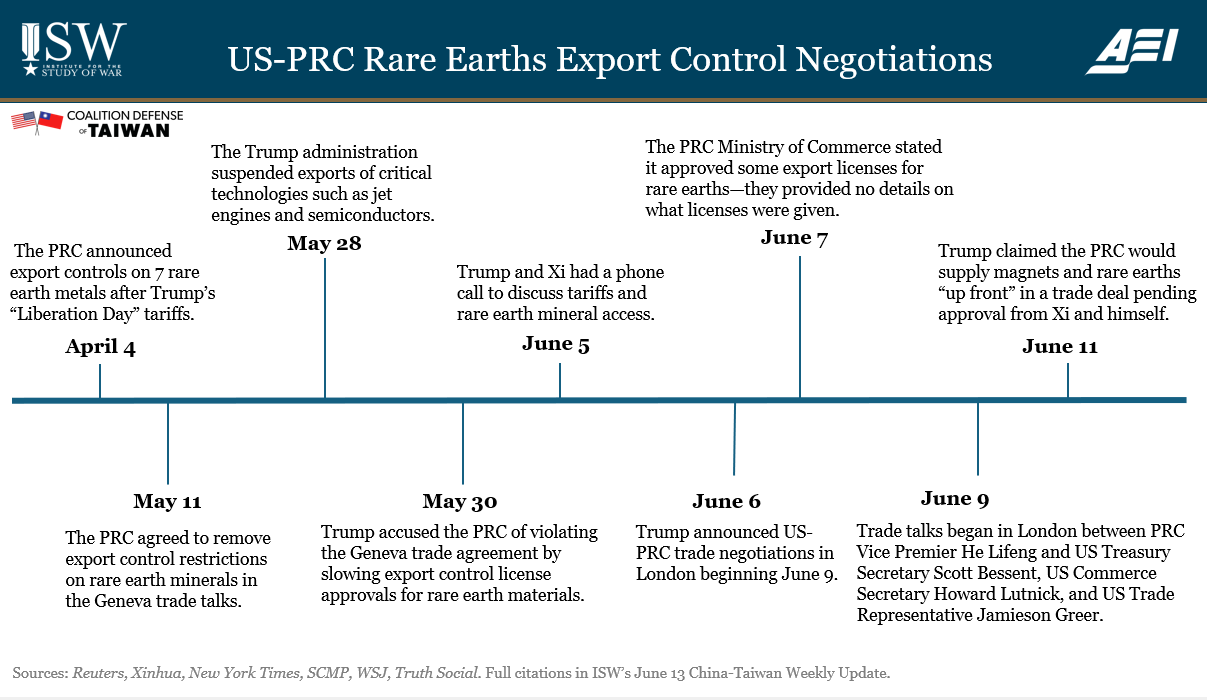 The two countries accused each other of violating the Geneva trade agreement in mid-May. Trump specifically accused the PRC of slow-walking export control license approvals for rare earth minerals, and the PRC in turn accused the United States of undermining the agreement by warning against Huawei AI chips.[23] The Trump administration followed the accusations with export restrictions on critical technologies, such as semiconductors and jet engines, on May 30. PRC General Secretary Xi Jinping and US President Donald Trump discussed tariffs and rare earth mineral access on June 5.[24] Trump claimed that they had addressed “any complexity” regarding rare earth products in the call without elaborating on any details, but the PRC readout on state-media outlet Xinhua made no mention of rare earth minerals. [25] Xinhua instead called attention to visa issues for PRC nationals and US policy towards Taiwan.[26] The PRC Ministry of Foreign Affairs (MFA) declined to comment on the details of the rare earth mineral issue in the press conference following the phone call. [27]
