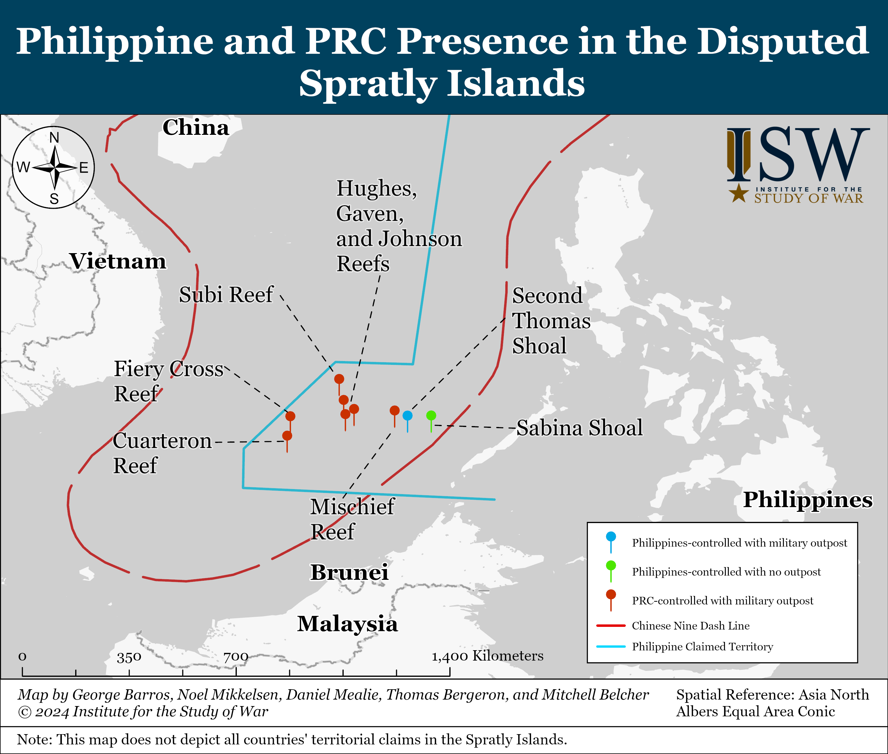 The confrontation happened two days after the CCG officially implemented new procedures first announced on May 15 that authorize it to detain for up to 60 days any foreign national that illegally intrudes into the PRC’s claimed territory and to board and inspect the cargo of foreign vessels traveling to the PRC’s claimed waters. ISW previously assessed that the procedures were intended to enhance PRC efforts to assert its sovereignty claims in the South China Sea.[28] Armed Forces of the Philippines Chief Romeo Brawner urged Filipino fishermen to ignore the CCG’s restrictions and continue fishing operations as normal.[29] It is unclear whether the CCG attempted to arrest any of the Philippine personnel involved in the June 17 supply mission.