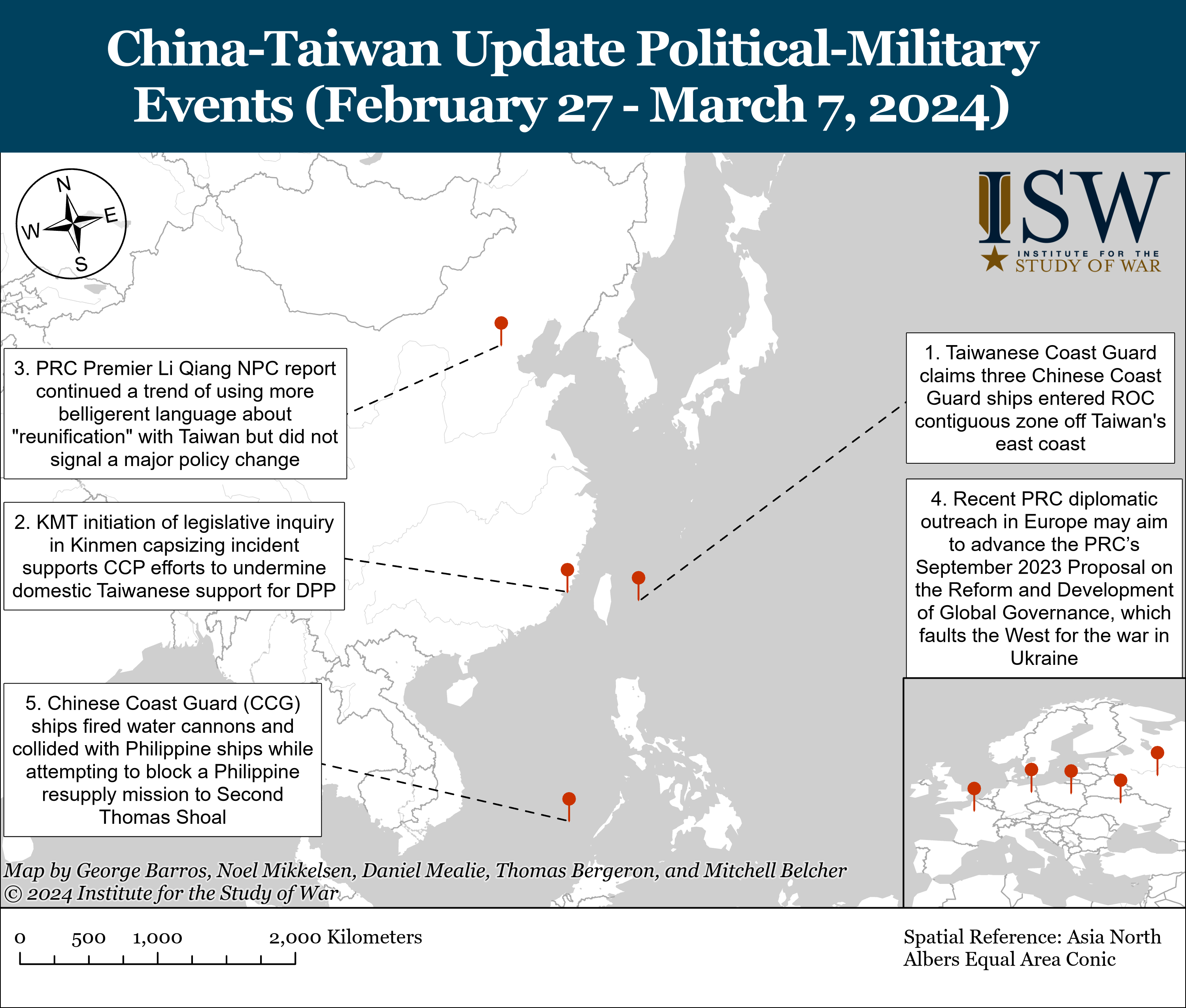 PRC Special Representative for Eurasian Affairs Li Hui traveled to Europe on March 2 for a round of visits to Russia, the EU, Poland, Ukraine, Germany, and France. PRC MFA Spokeswoman Mao Ning claimed that Li Hui would “pave the way for peace talks.”[27] Li’s comments align with Kremlin talking points, however. The South China Morning Post reported on March 6 that PRC Special Representative for Eurasian Affairs Li Hui reiterated the Kremlin talking point that the discussion of Ukrainian territorial sovereignty could only occur when violence ceases. He also implied that the EU needs to stop sending weapons to Ukraine for this to happen.[28] Li’s claims align with PRC Foreign Minister Wang Yi’s message at the Munich Security Conference in mid-February that the PRC is a “responsible major country” that would serve as a “stabilizing force” amid global turmoil. [29] Wang also repeated his claim on March 7 that the PRC “supports the timely convening of an international peace conference” during a press conference at the annual Two Sessions meeting.[30] CCP leadership delivers policy guidance for the upcoming year to the party cadre at this annual meeting.