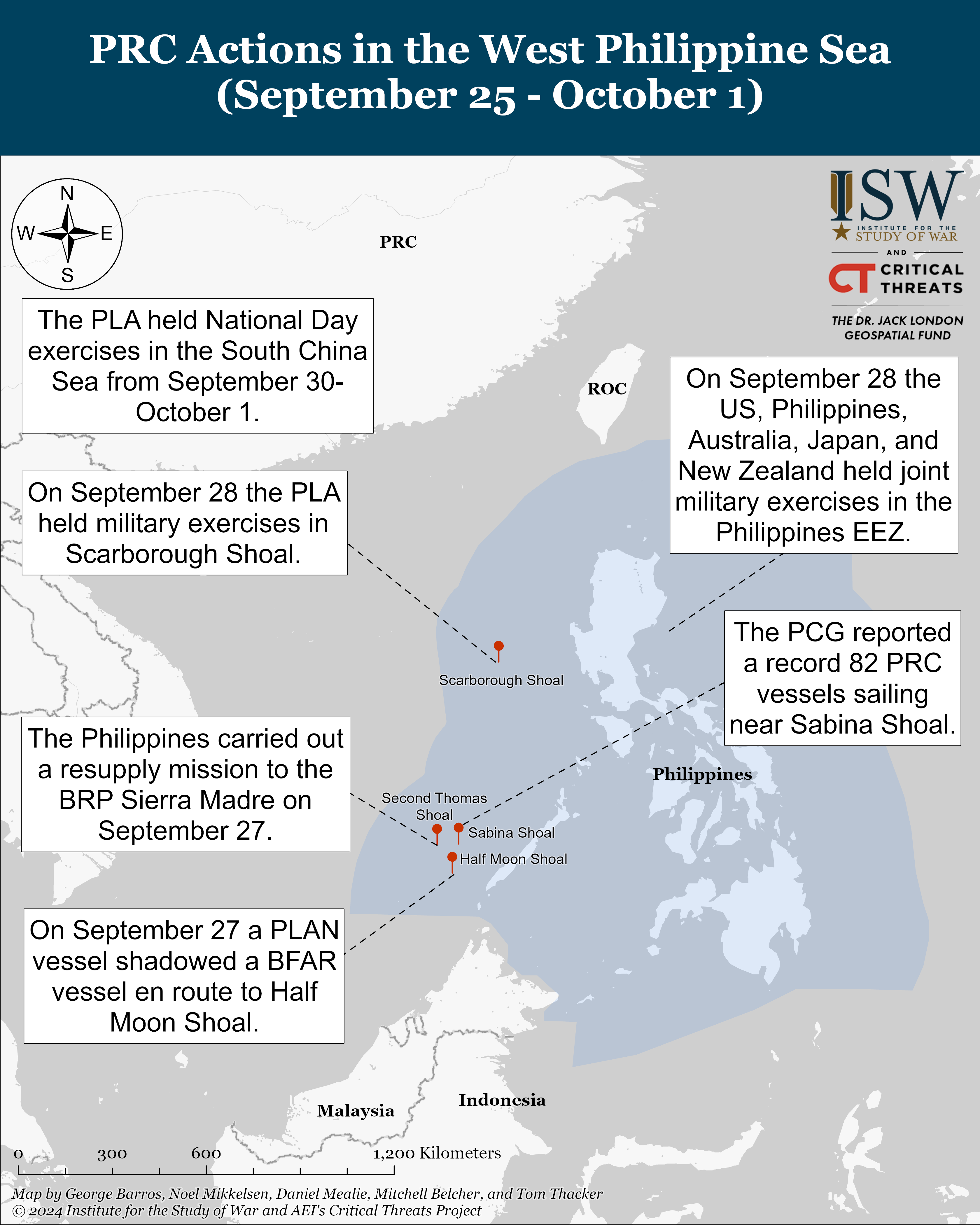 The PLA conducted military exercises and operations likely in response to a joint training exercise by the United States, Philippines, Japan, Australia, and New Zealand. The PLA’s behavior indicates that it will maintain current levels of coercion and military presence within contested waters. On September 28 the Philippines, Japan, United States, Australia, and New Zealand held a multilateral maritime cooperative activity (MMCA) in the Philippines EEZ intended to improve interoperability.[29] On the same day, the PLA Southern Theater Command reported that it held exercises near Scarborough Shoal focused on reconnaissance and surveillance, patrol and combat readiness, and joint strike capabilities.[30] Philippine defense authorities responded to PRC claims by rejecting the idea that PLA drills took place near Scarborough Shoal, saying that Philippine troops did not observe the activity[31] This is the second time that the PLA has held military exercises in Scarborough Shoal at the same time as joint Philippine and allied military exercises in the Philippines EEZ. This is the second time that the PLA has held military exercises in Scarborough Shoal at the same time as joint Philippine and allied military exercises in the Philippines EEZ.