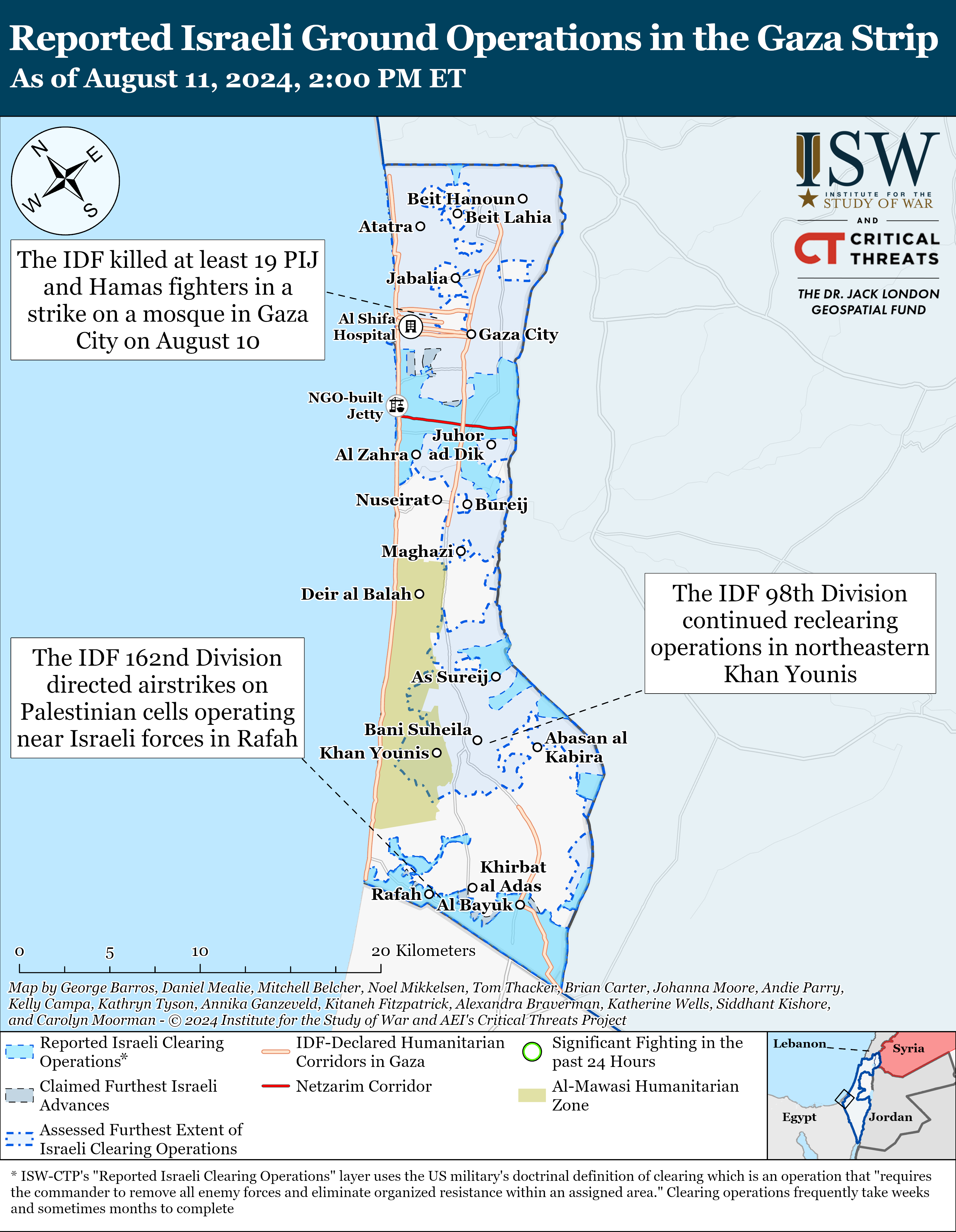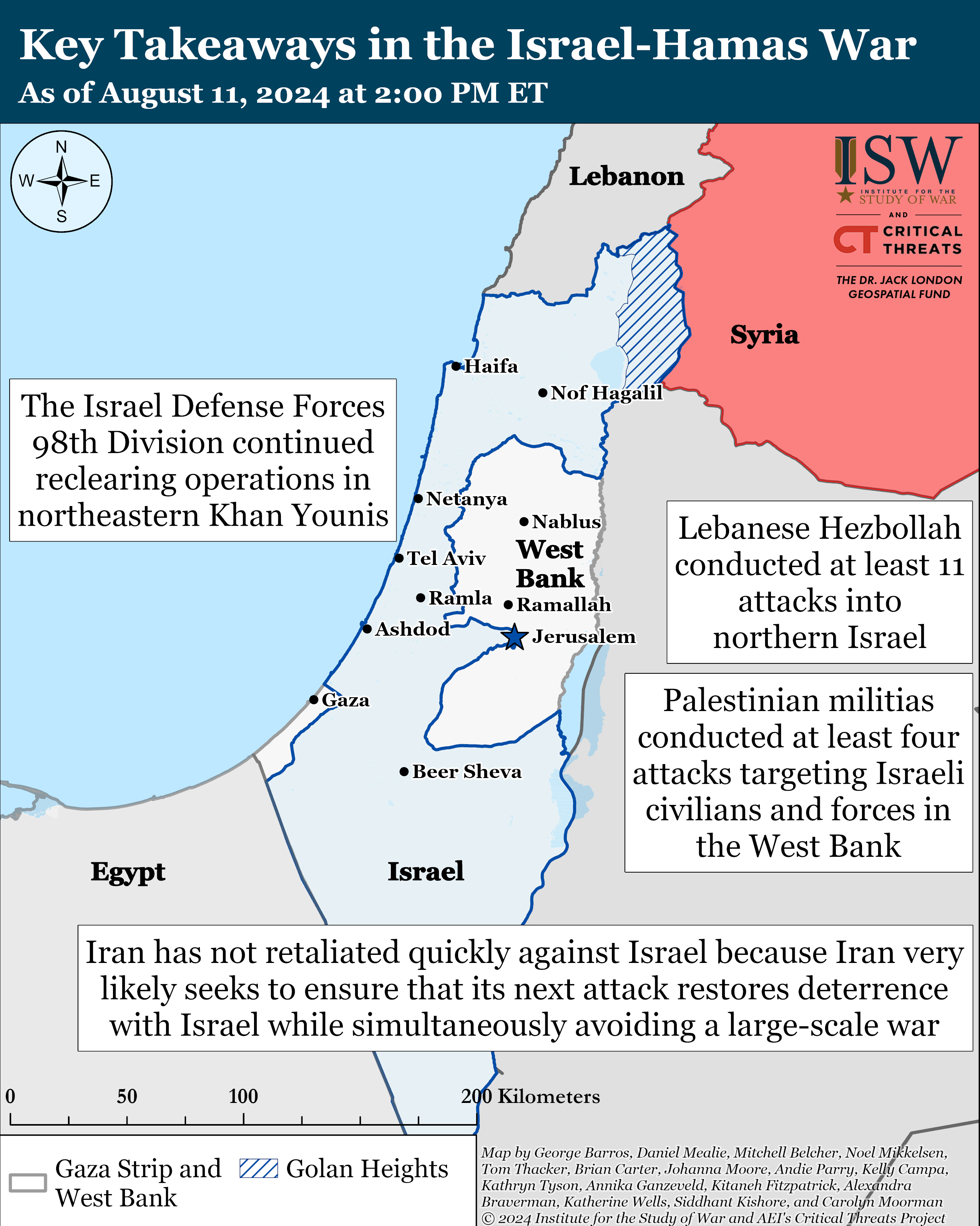 The Israel Defense Forces (IDF) 98th Division continued clearing operations in Khan Younis on August 11.[20] The IDF said that it re-entered Khan Younis on August 9 following intelligence indicating the presence of additional militia infrastructure in the area.[21] The IDF 7th Brigade and Yahalom combat engineering unit located an underground tunnel containing small arms, explosive devices, and long-term residence facilities in an unspecified area of Khan Younis on August 10.[22] The IDF Air Force struck dozens of militia sites and Palestinian fighters in Khan Younis, including Hamas engineering commanders and snipers.[23] The IDF 98th Division also targeted a Hamas rocket launch site used by fighters on August 10 to target southern Israel.[24] Palestinian militias continued to defend against Israeli advances into northeastern Khan Younis with mortar fire.[25] Hamas and Palestinian Islamic Jihad (PIJ) targeted Israeli forces with sniper fire in al Zana, northeast of Khan Younis.[26]