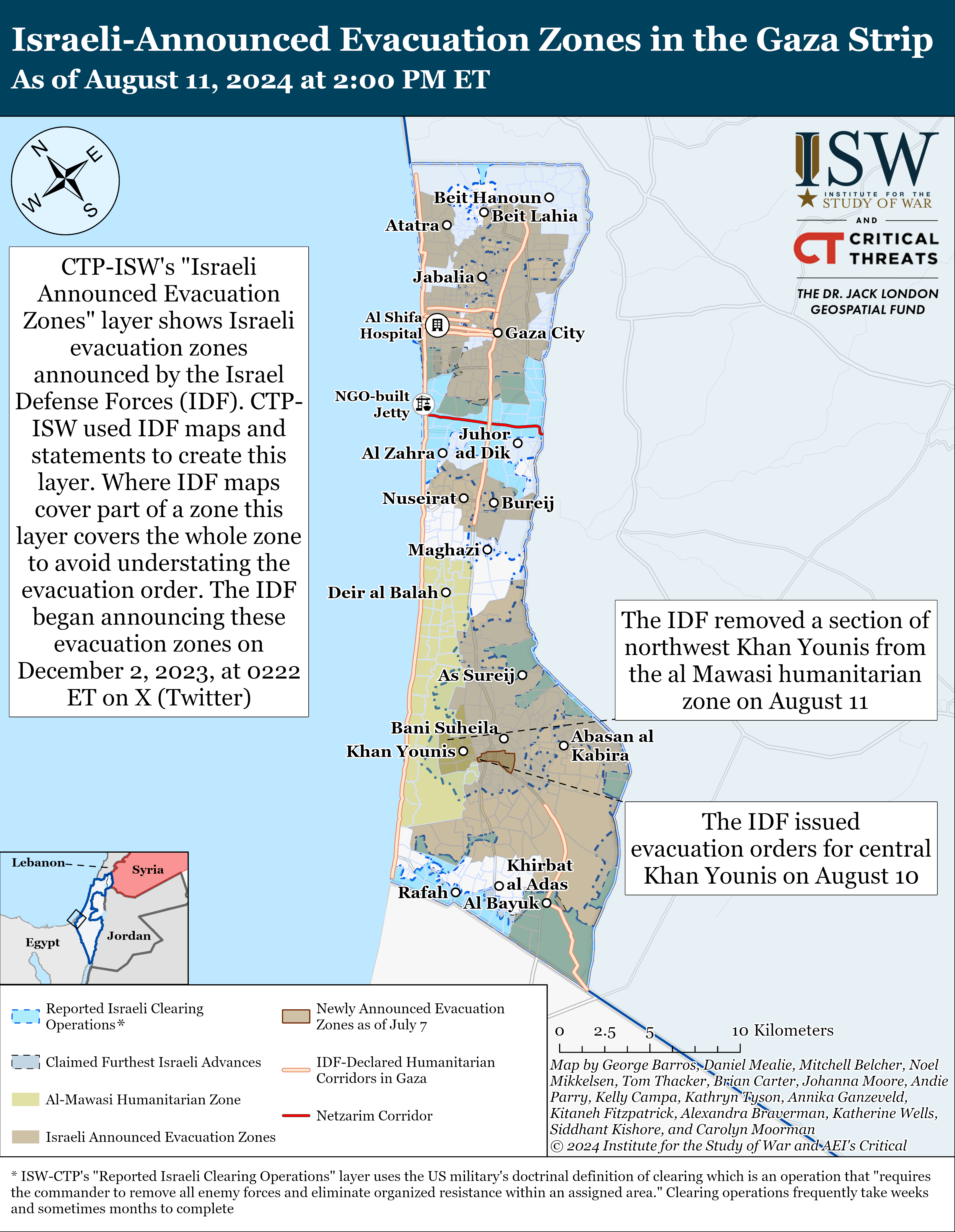 The IDF issued evacuation orders for central Khan Younis on August 10.[36] The IDF said it would act “forcefully” against Palestinian militants who are firing rockets into Israel from the evacuation zone.[37] The IDF separately removed a section of northwest Khan Younis from the al Mawasi humanitarian zone on August 11.[38] The IDF removed the neighborhood of al Jalaa from the humanitarian zone because of attacks from the area targeting Israel and Hamas infrastructure in the block.[39] The IDF said that it announced that it changed the status of the area to a combat zone in order to warn civilians and enable them to leave.[40] Palestinian journalists and militias have not reported an IDF presence in these re-designated areas at the time of this writing.
