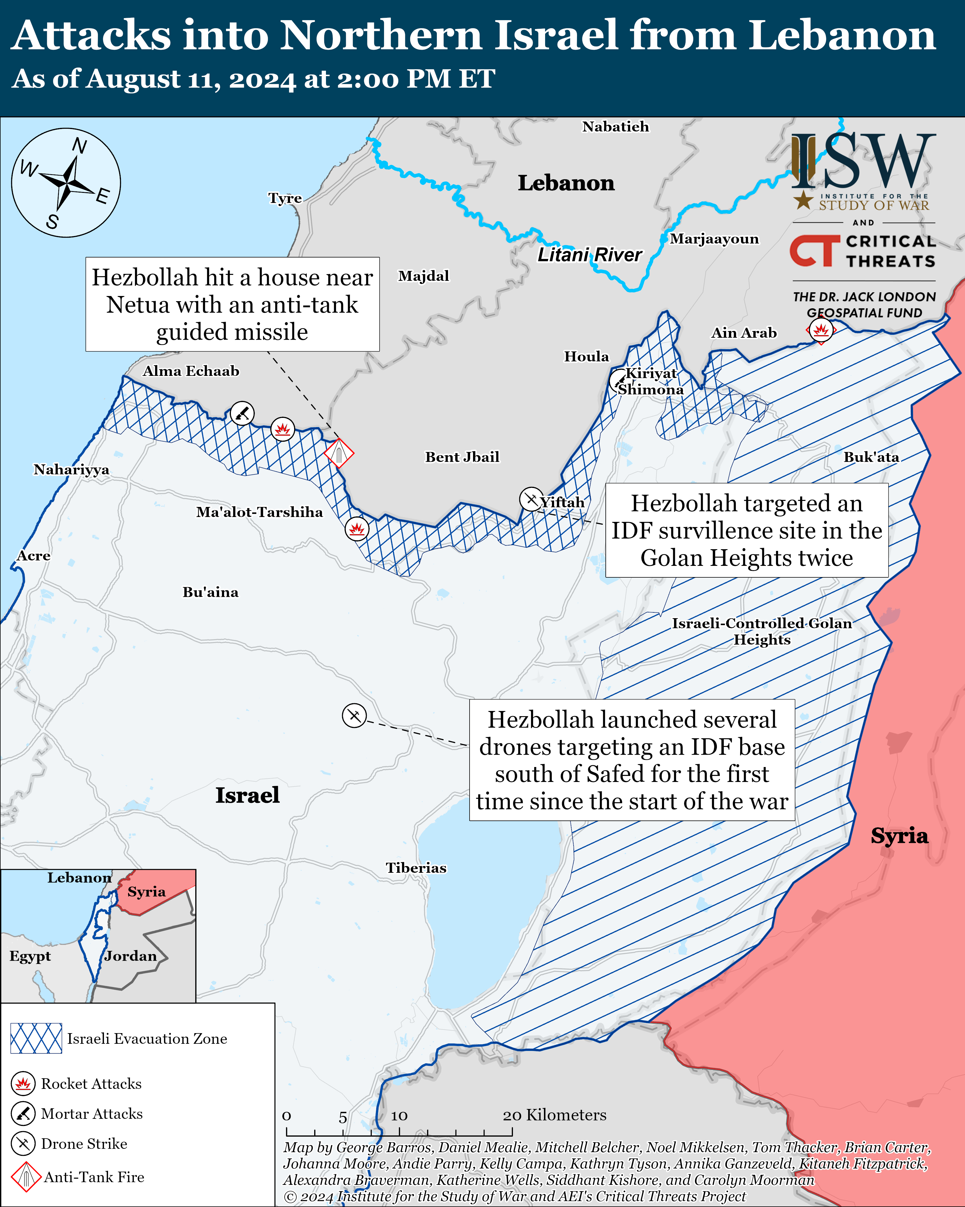 Lebanese Hezbollah conducted at least 11 attacks into northern Israel since CTP-ISW’s last data cut-off on August 10.[54] Hezbollah targeted Alon Field Base with attack drones in response to Israel’s killing of a Hamas commander in Sidon on August 9.[55] The IDF said that it intercepted one drone, but others struck and caused damage.[56] This is the first time that Hezbollah has targeted Alon since the start of the war.[57] Hezbollah claimed that Alon Field Base is used to assemble and mobilize forces and emergency warehouses for the IDF Northern Command.[58]