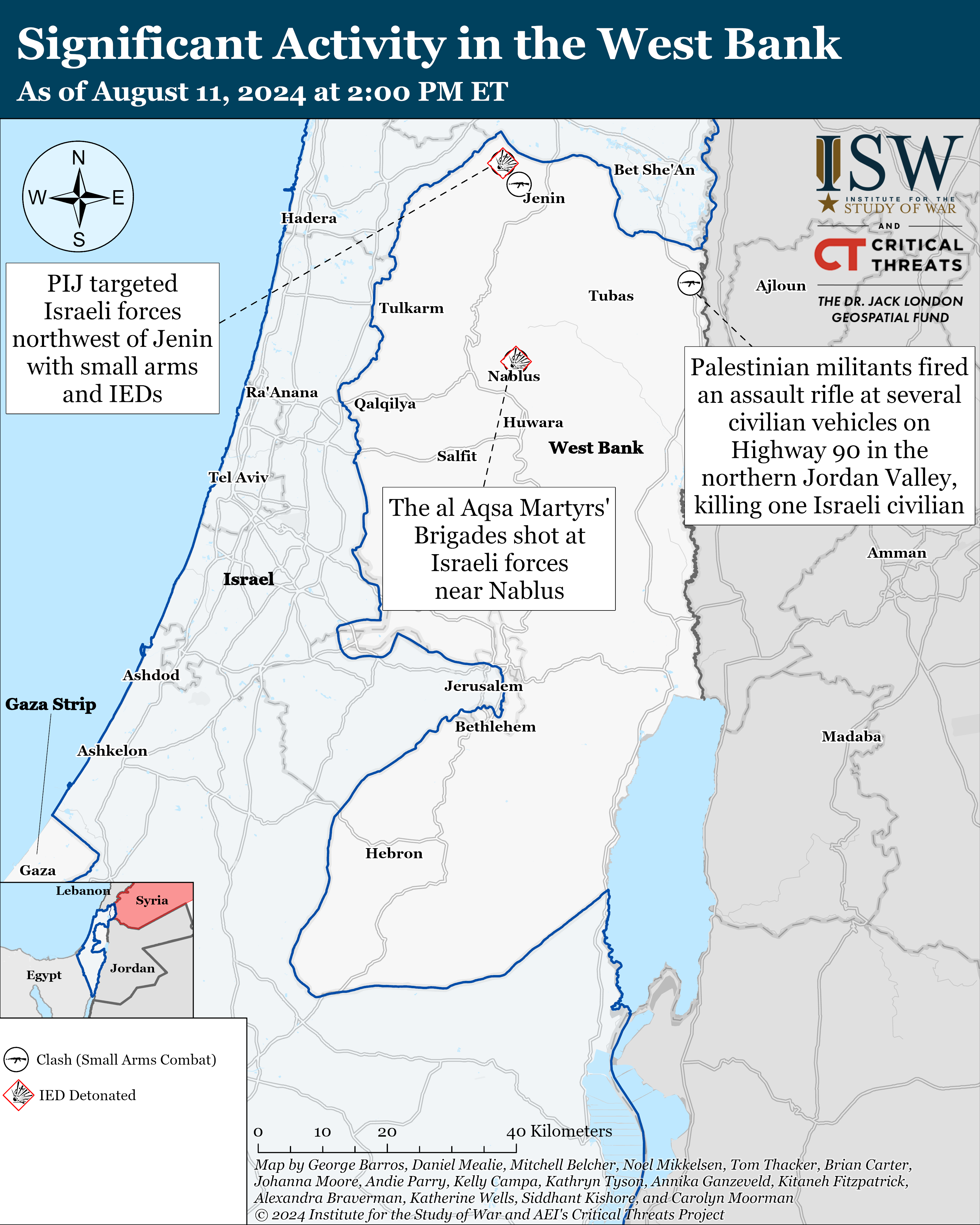 Palestinian militias conducted at least four attacks targeting Israeli civilians and forces in the West Bank since CTP-ISW’s last data cutoff on August 10.[47] PIJ fighters in Jenin detonated improvised explosive devices and fired small arms targeting Israeli forces in Silat al Harithiya and Kafr Dan, northwest of Jenin. Al Aqsa Martyrs’ Brigades fighters targeted Israeli forces in Al Ain refugee camp near Nablus.[48]