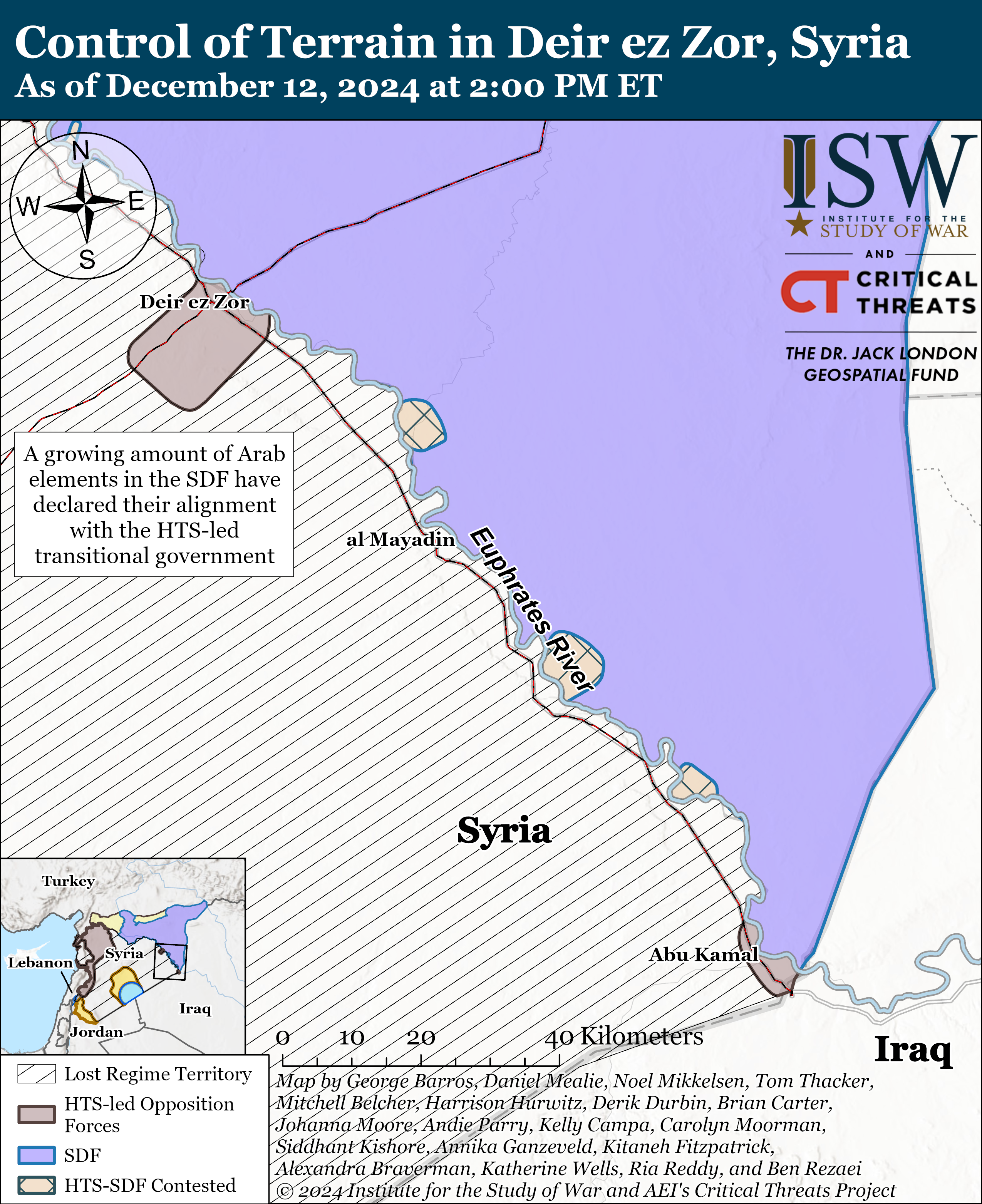 The Syrian Democratic Forces (SDF) is factionalizing under internal and external pressure. Local footage posted on December 12 showed the SDF attempt to suppress demonstrators in Raqqa who demanded that the city be brought under the HTS-led transitional government.[11] Citizens have longstanding grievances against the SDF in Raqqa, which include limited reconstruction in Arab areas, repeated SDF abuses of the local populations, and a lack of representative Arab leadership.[12] The head of the al Kasra Military Council–a member of the SDF– defected from the SDF, citing SDF “violations” against civilians in Deir ez Zor and Raqqa.[13] Arab contingents of the SDF have rapidly begun to defect in recent days.[14] A Syrian journalist reported that approximately 220 members of the Deir ez Zor Military Council have defected from the SDF over the past 48 hours.[15]