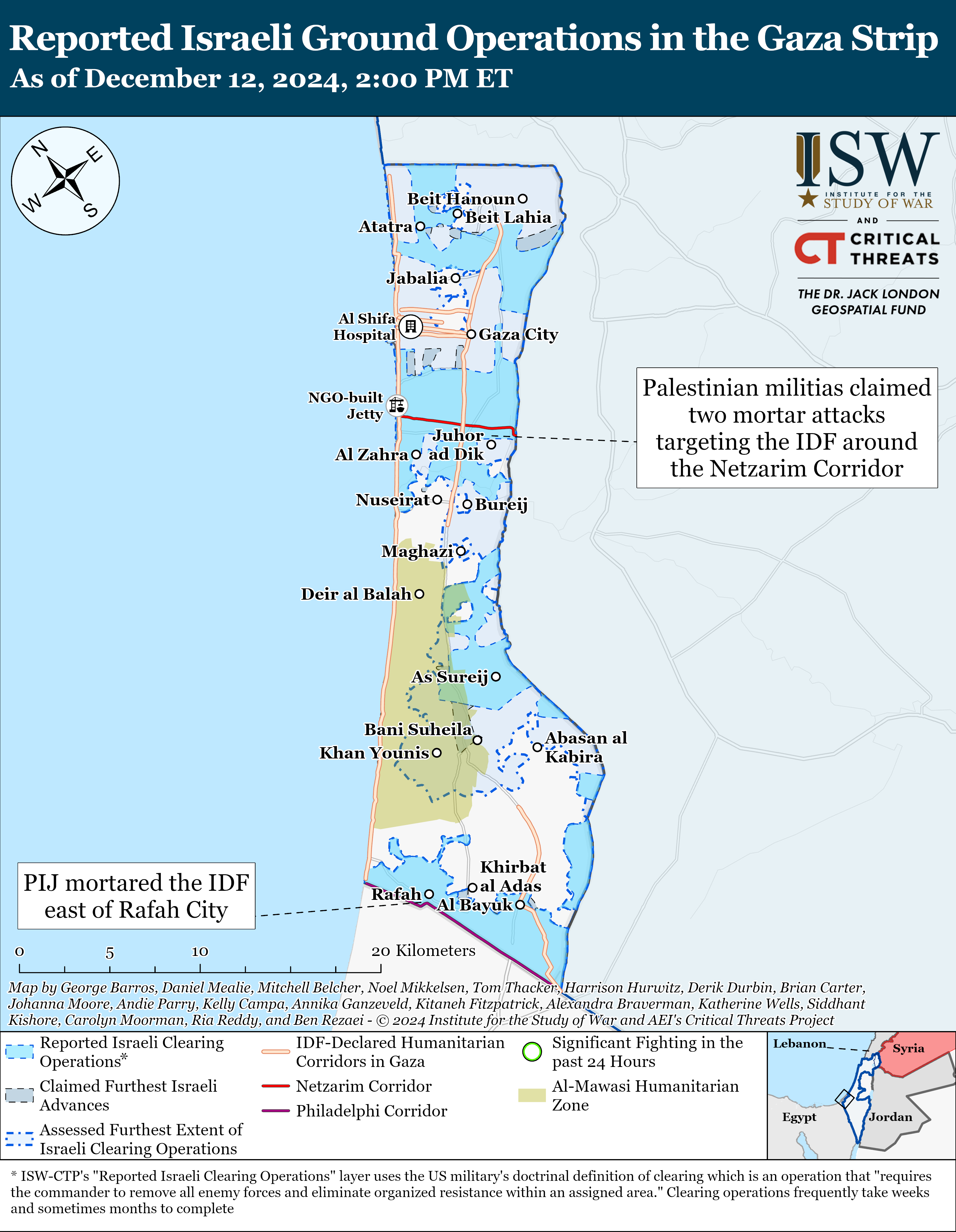 Palestinian militias claimed two mortar attacks targeting IDF sites around the Netzarim Corridor on December 12.[37] The IDF Arabic-language spokesperson re-issued evacuation orders for residents in al Rimal and al Sabra neighborhoods in the central Gaza Strip.[38] The spokesperson stated that fighters in these areas launched rockets and that the IDF would target these fighters shortly.