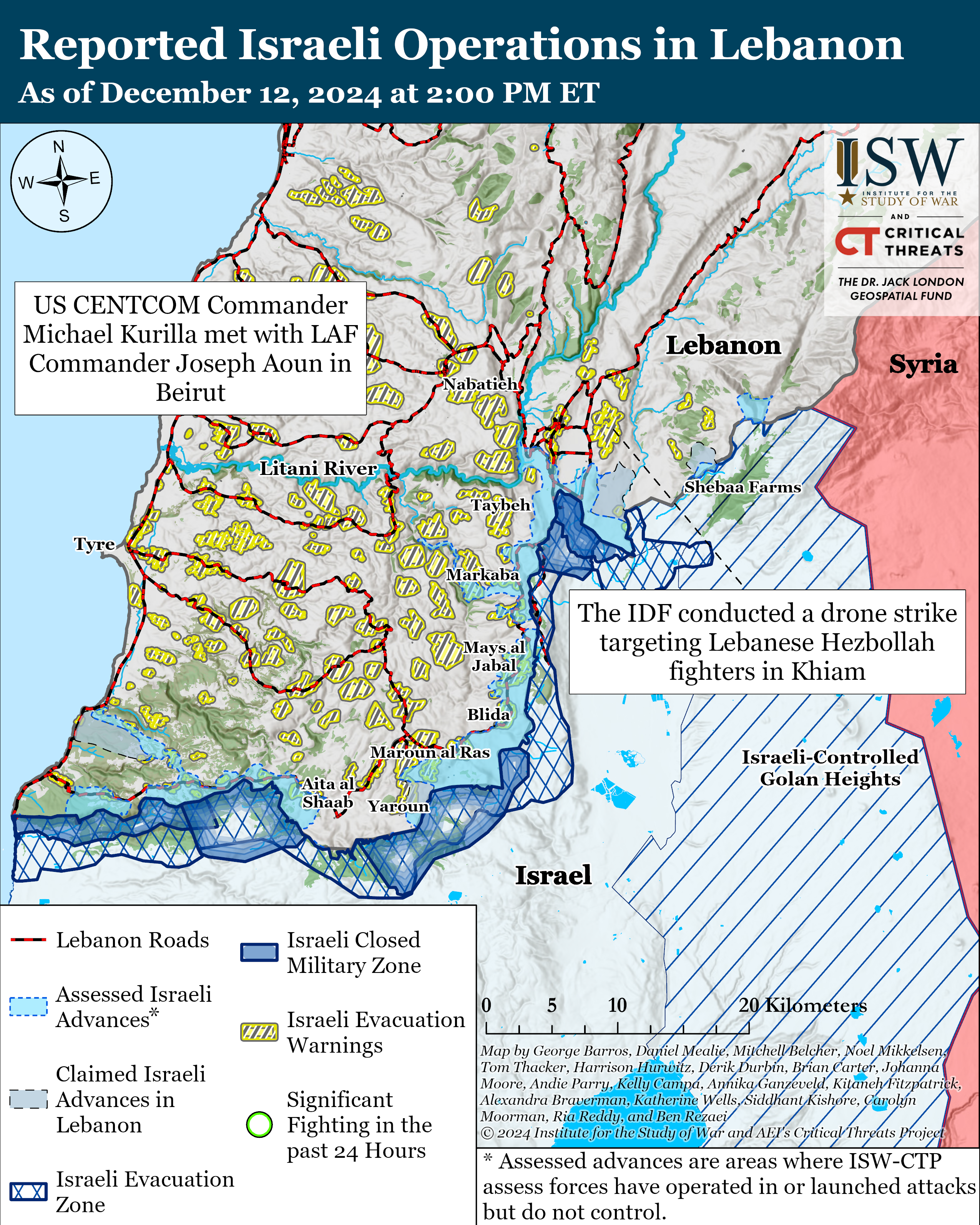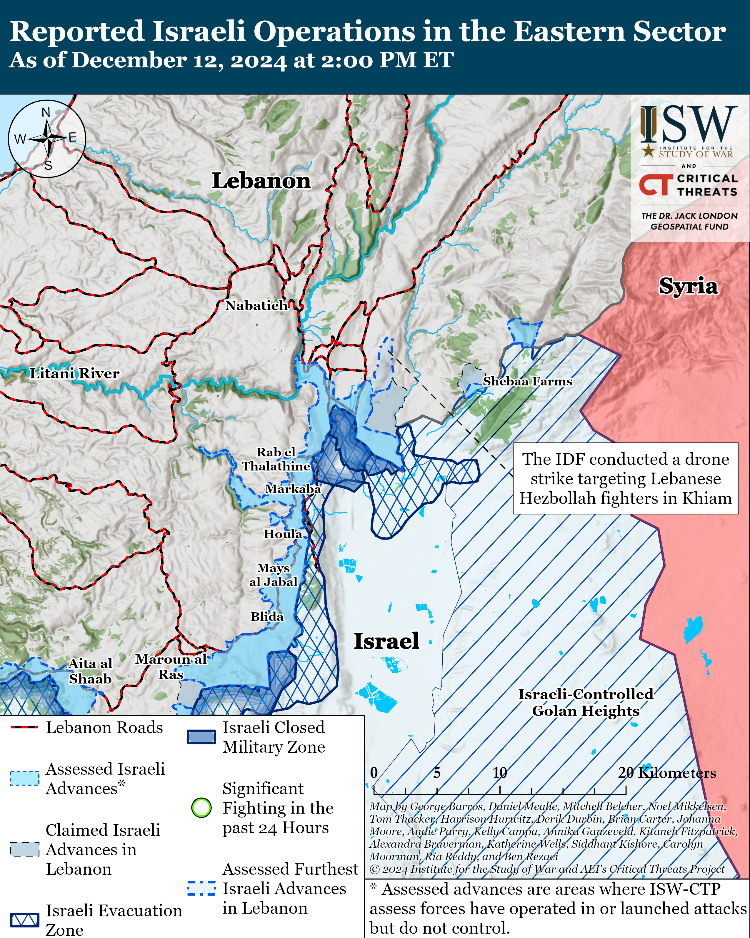 The IDF conducted a drone strike targeting Hezbollah fighters in Khiam, southeastern Lebanon, on December 12.[51] The IDF reported that the Hezbollah fighters posed a threat to Israeli civilians. The IDF also reiterated its commitment to the Israel-Lebanon ceasefire agreement.[52]