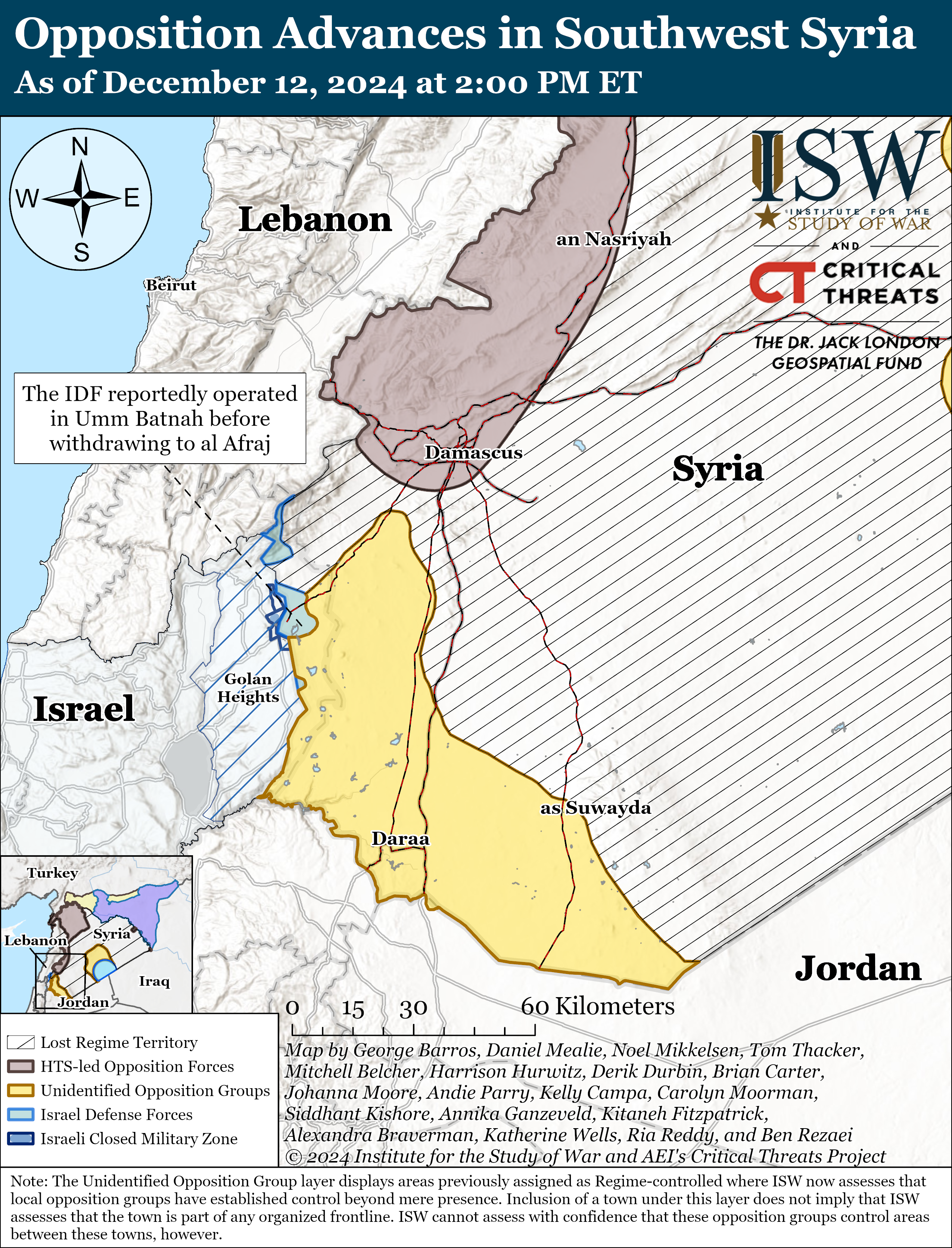 Click here to see CTP and ISW’s interactive map of Israeli ground operations, and here to see CTP and ISW’s interactive map of the ongoing opposition offensive in Syria. These maps are updated daily alongside the static maps present in this report.