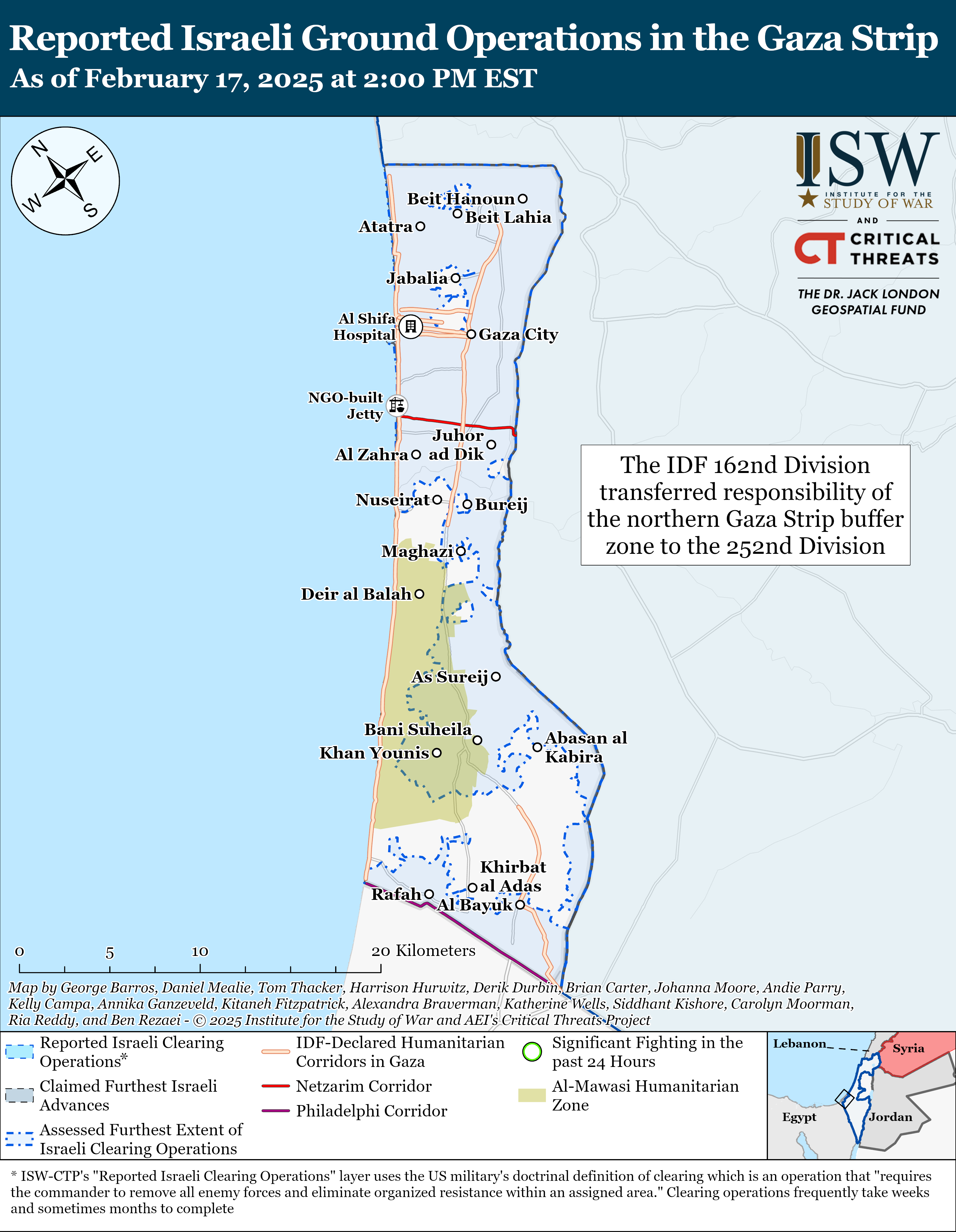 The IDF 162nd Division transferred authority of the northern Gaza Strip buffer zone to the 252nd Division on February 17.[64]